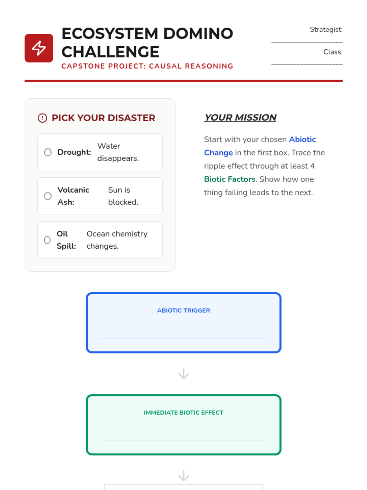 Students predict and map the ripple effects of abiotic disruptions on an entire ecosystem using causal reasoning and flowcharting.