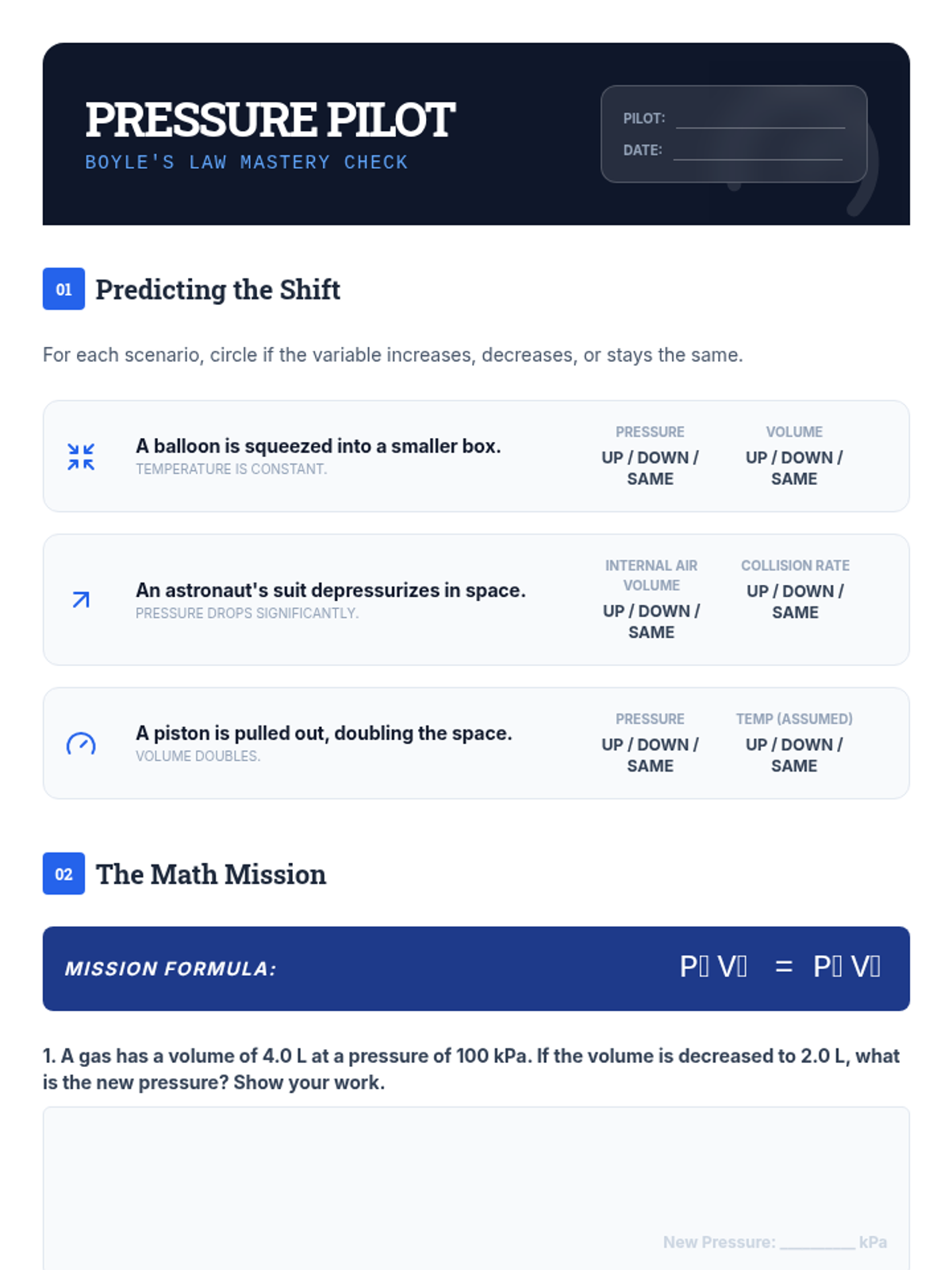 A mastery check and game-based review to predict how gas variables change in various scenarios.