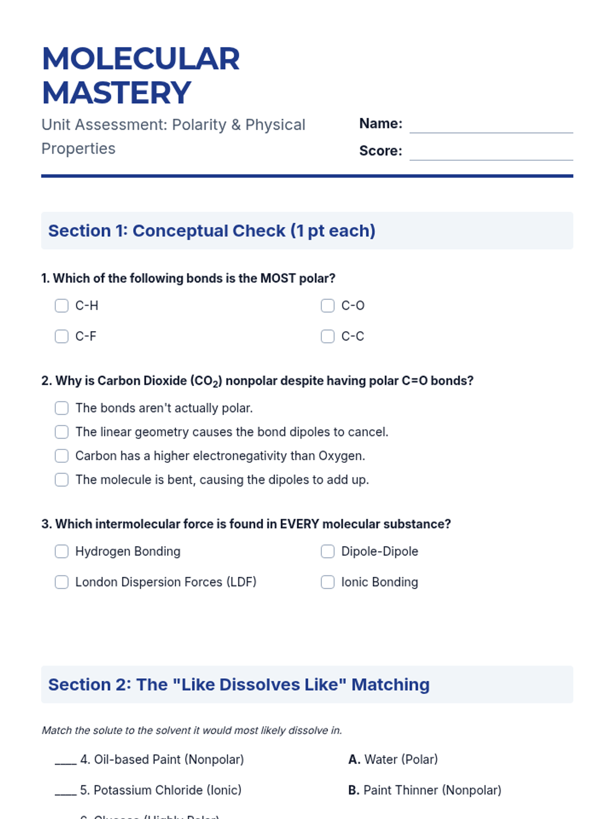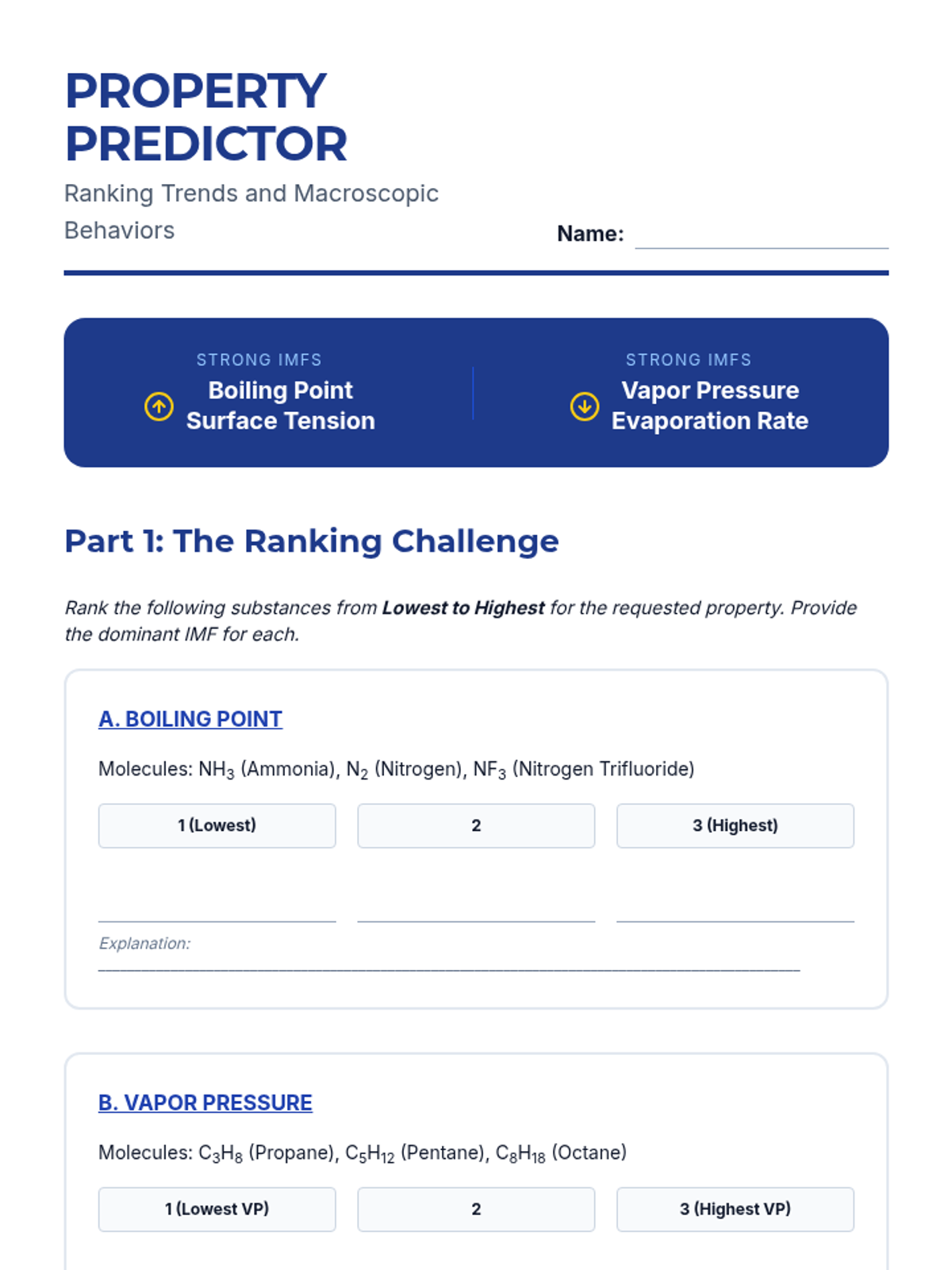 Students use their knowledge of IMFs to predict and rank physical properties like boiling points and vapor pressure.