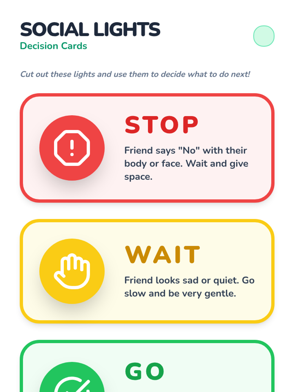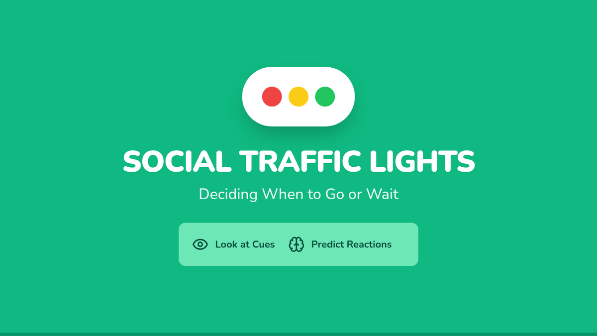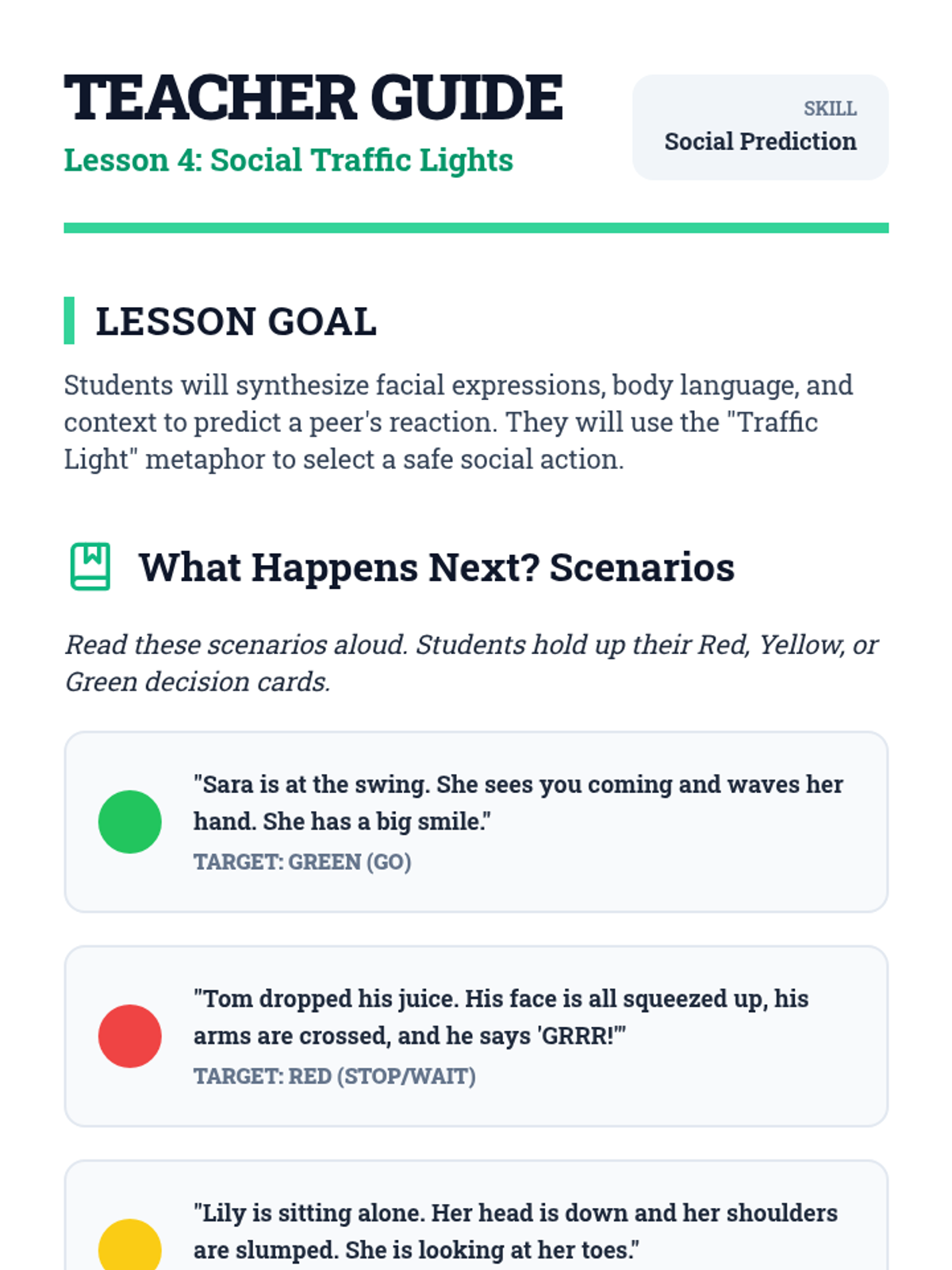 Using picture scenarios, students predict social outcomes and decide on 'green light' or 'red light' social actions.