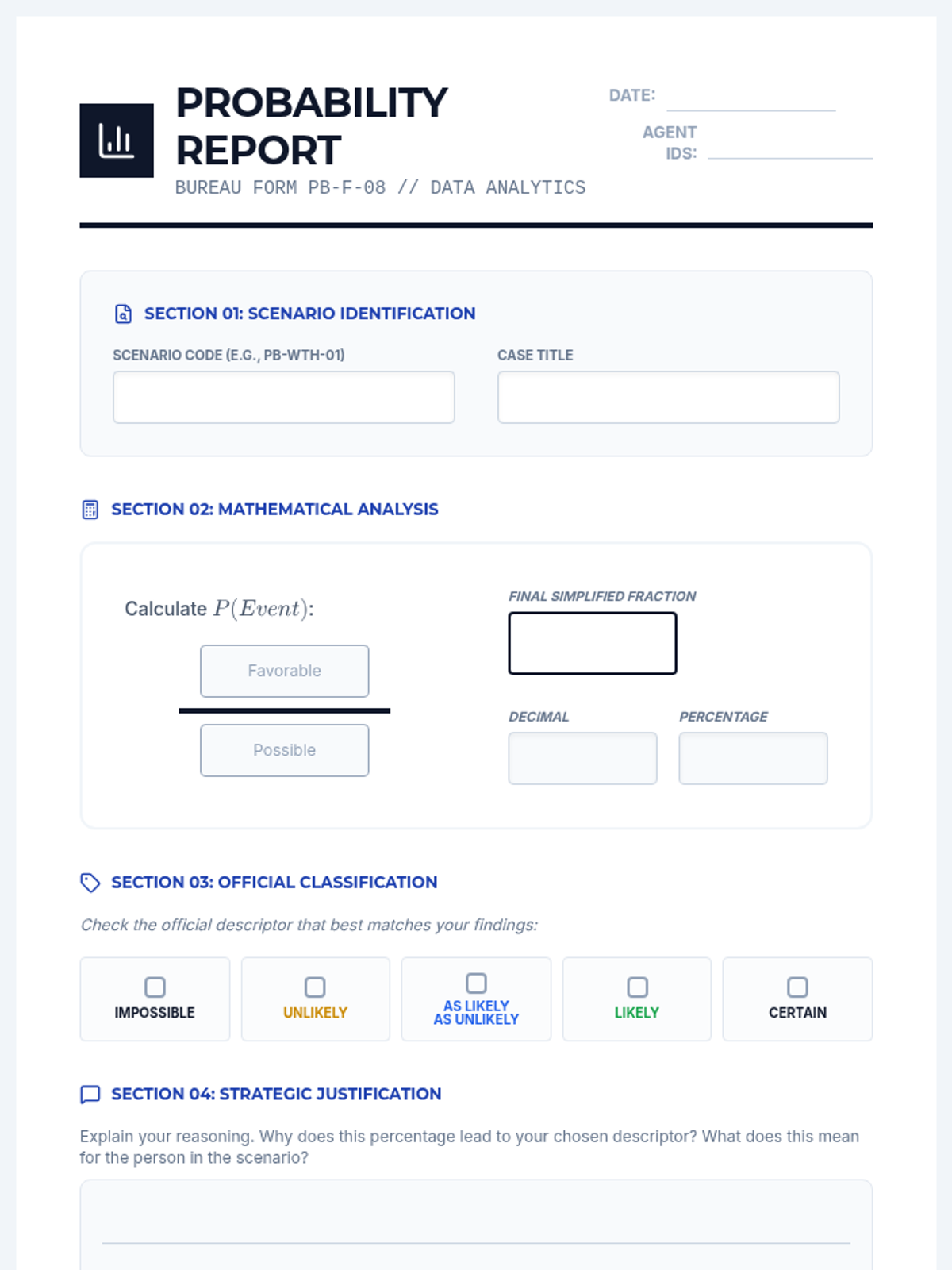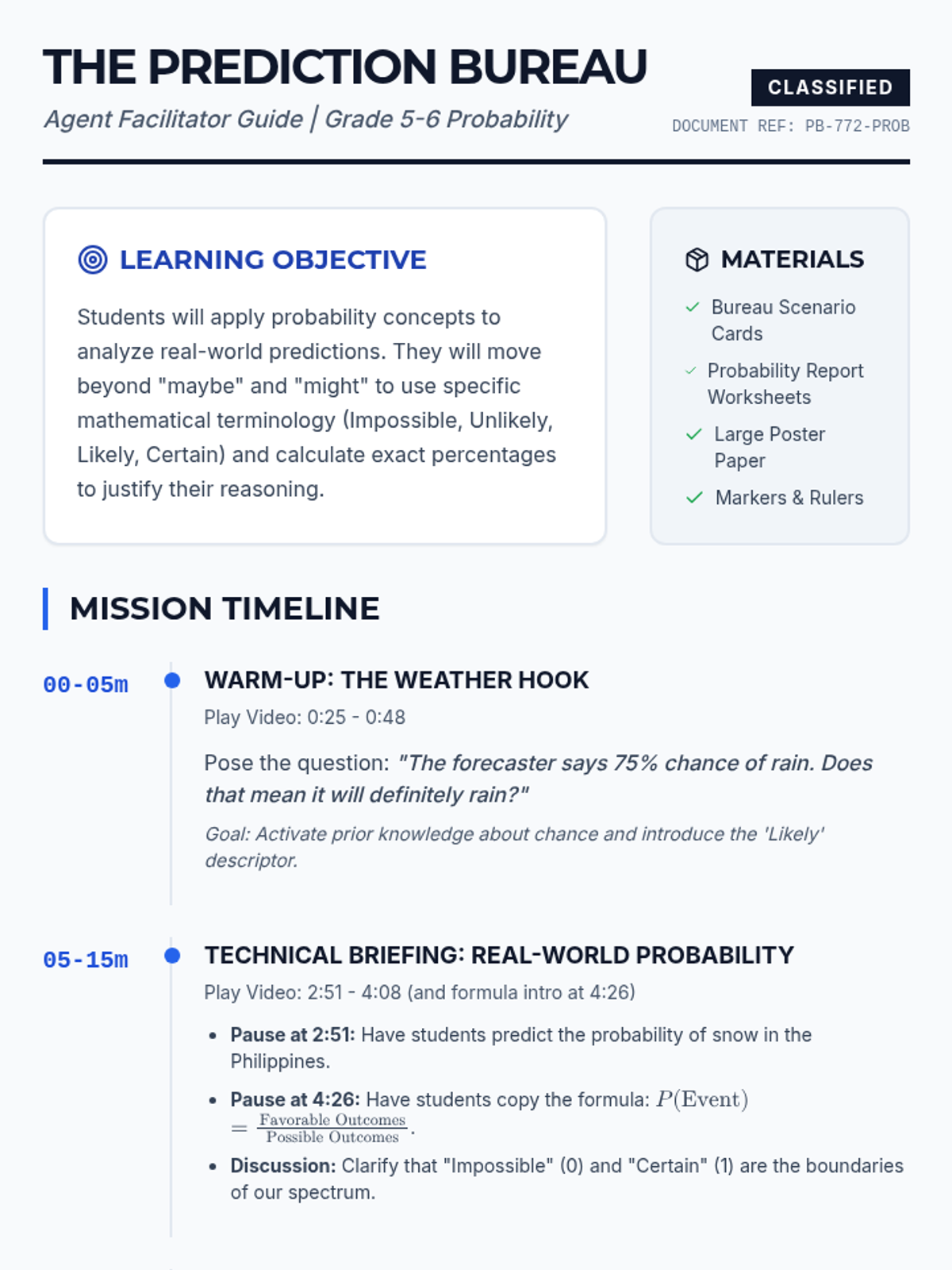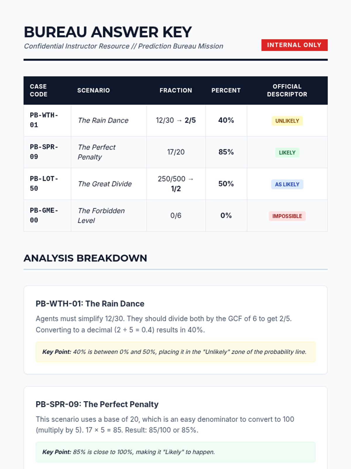 A data-driven lesson where students act as agents for 'The Prediction Bureau', using probability to analyze weather, sports, and games. Students will calculate probabilities, place them on a spectrum, and justify their predictions using specific terminology.