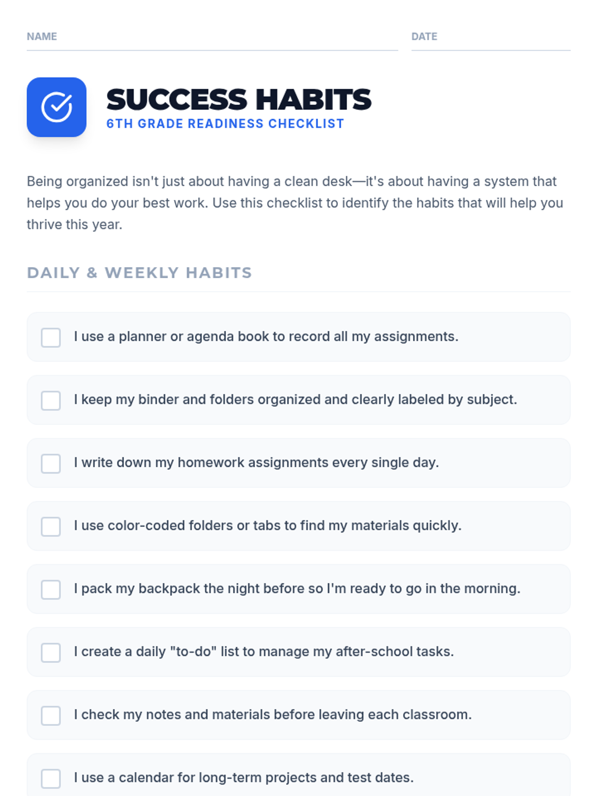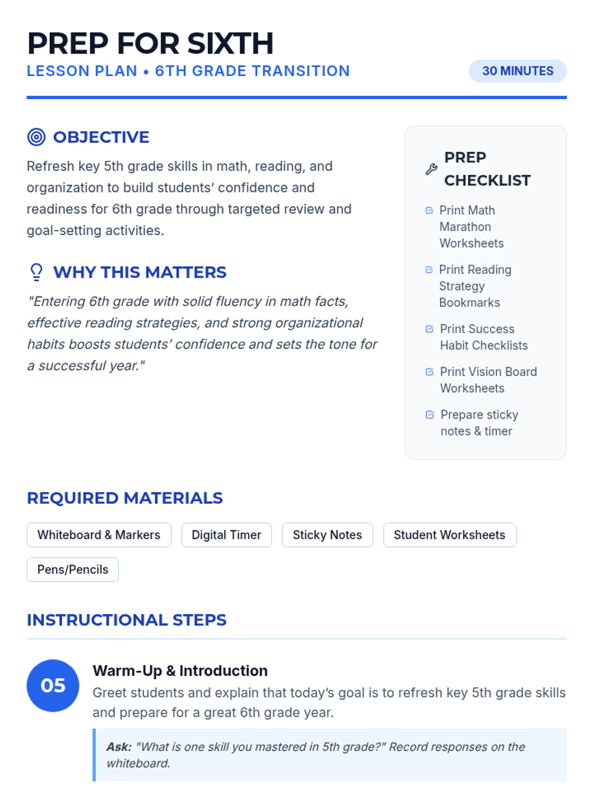 A 30-minute Tier 1 session for 6th graders to refresh foundational math, reading, and organizational skills while setting goals for the upcoming school year.