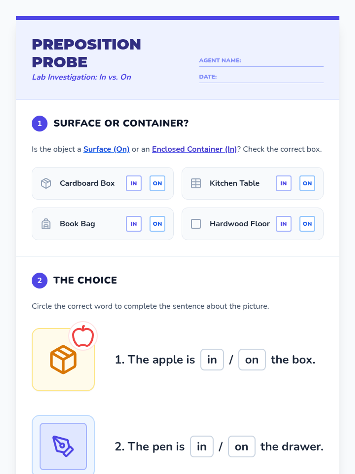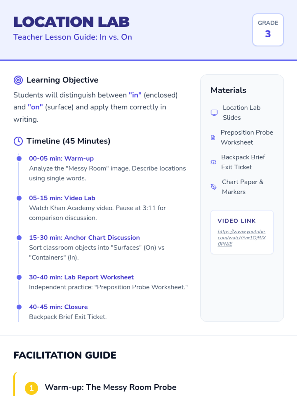 A lesson for 3rd graders focused on distinguishing between 'in' (enclosed areas) and 'on' (surfaces) using a combination of visual analysis, video instruction, and hands-on classification.