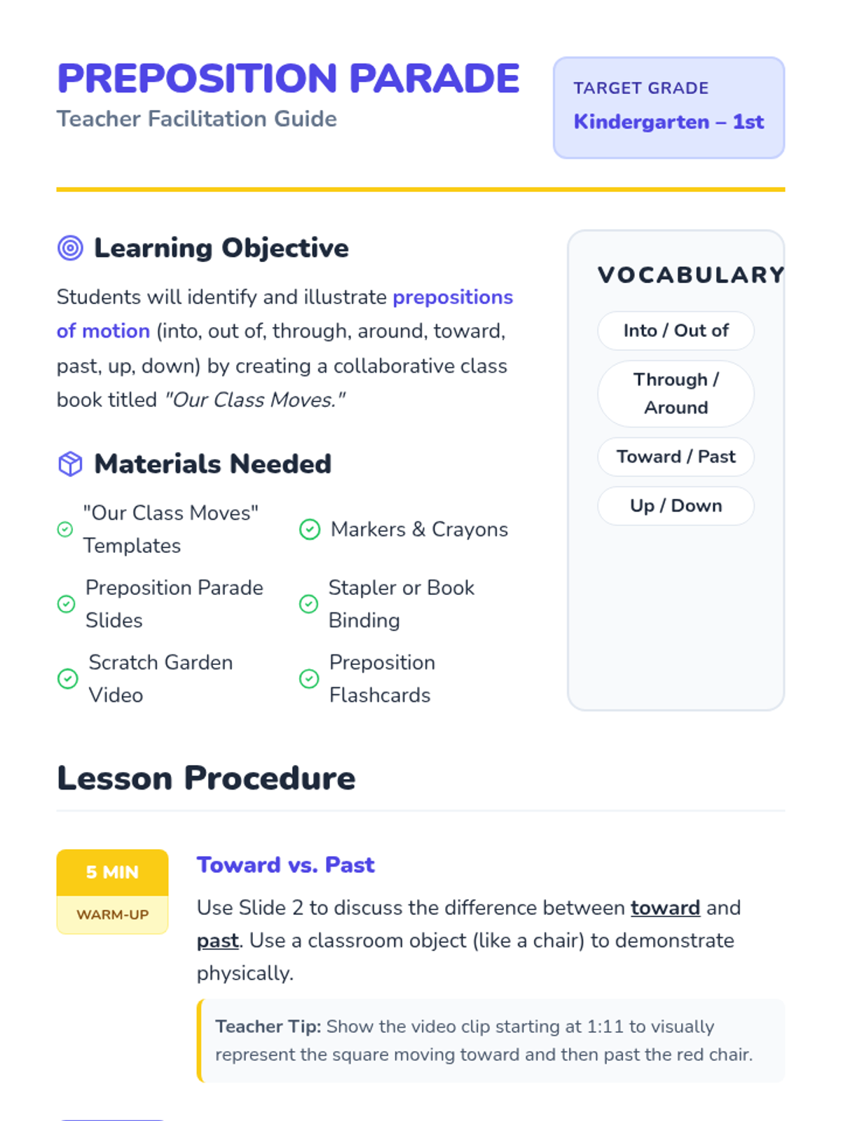 A foundational lesson for K-1 students to learn and illustrate prepositions of motion through music, movement, and the creation of a collaborative class book.
