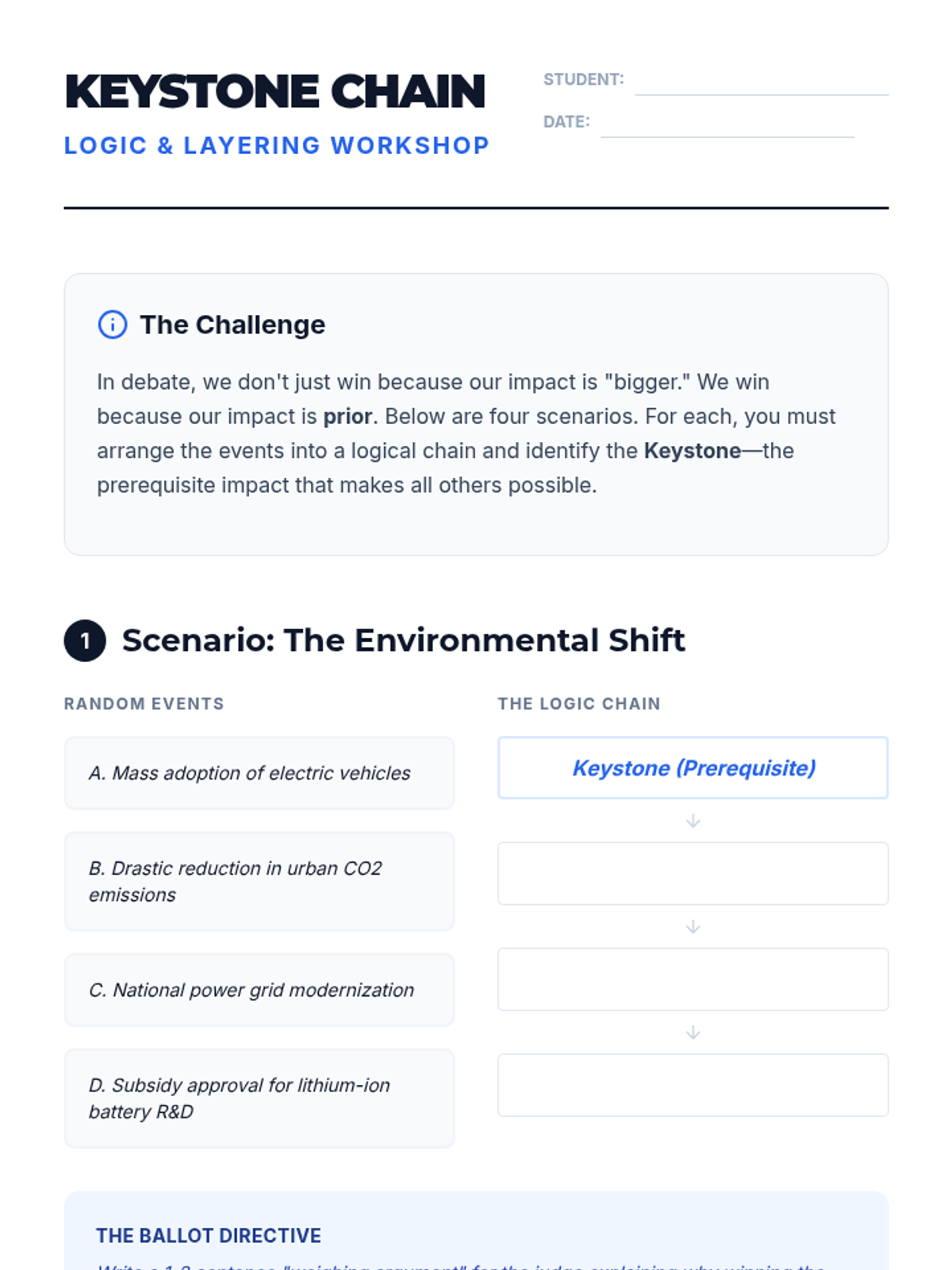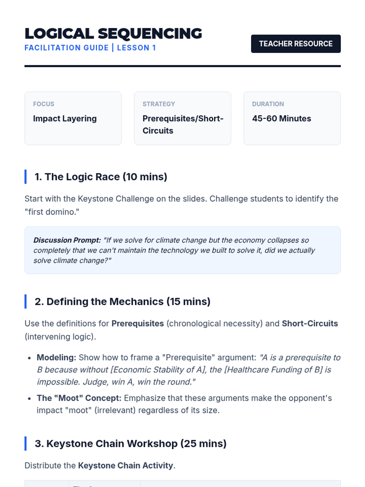 Students learn to identify and argue 'prerequisites' and 'short-circuits' to create logical hierarchies in debate rounds.