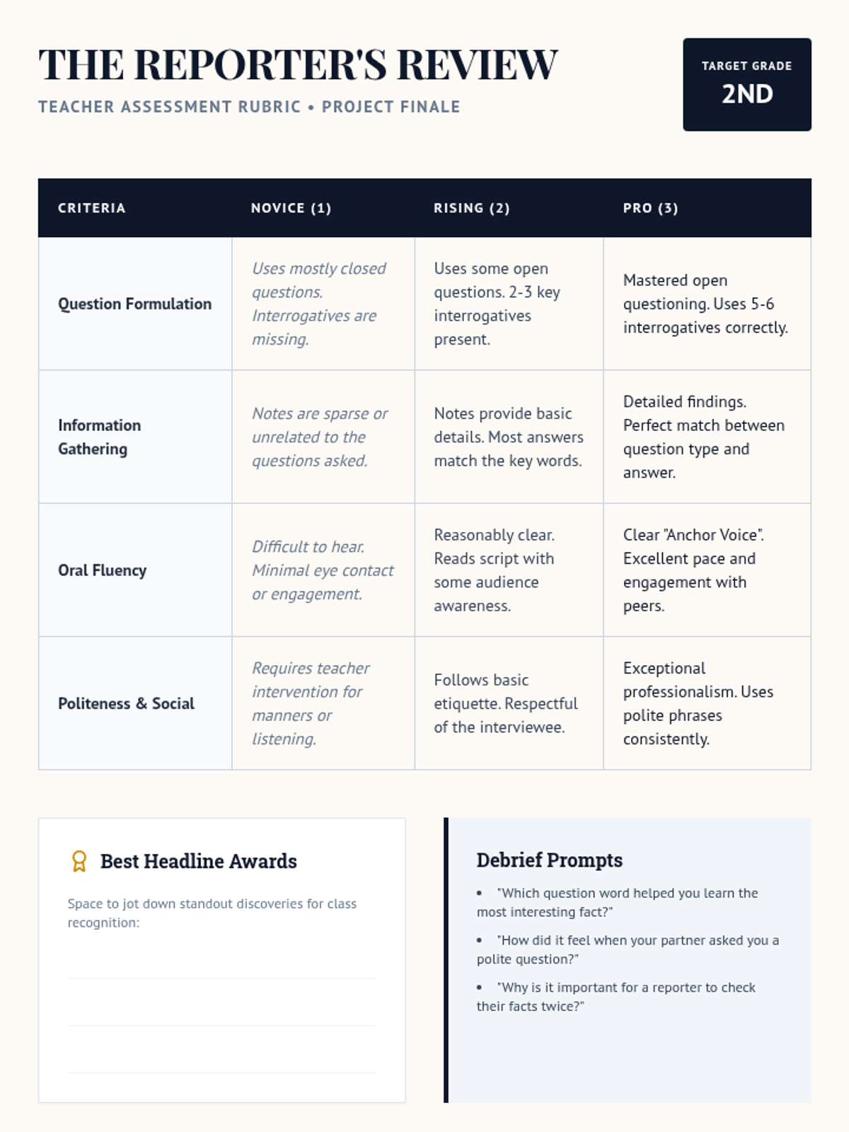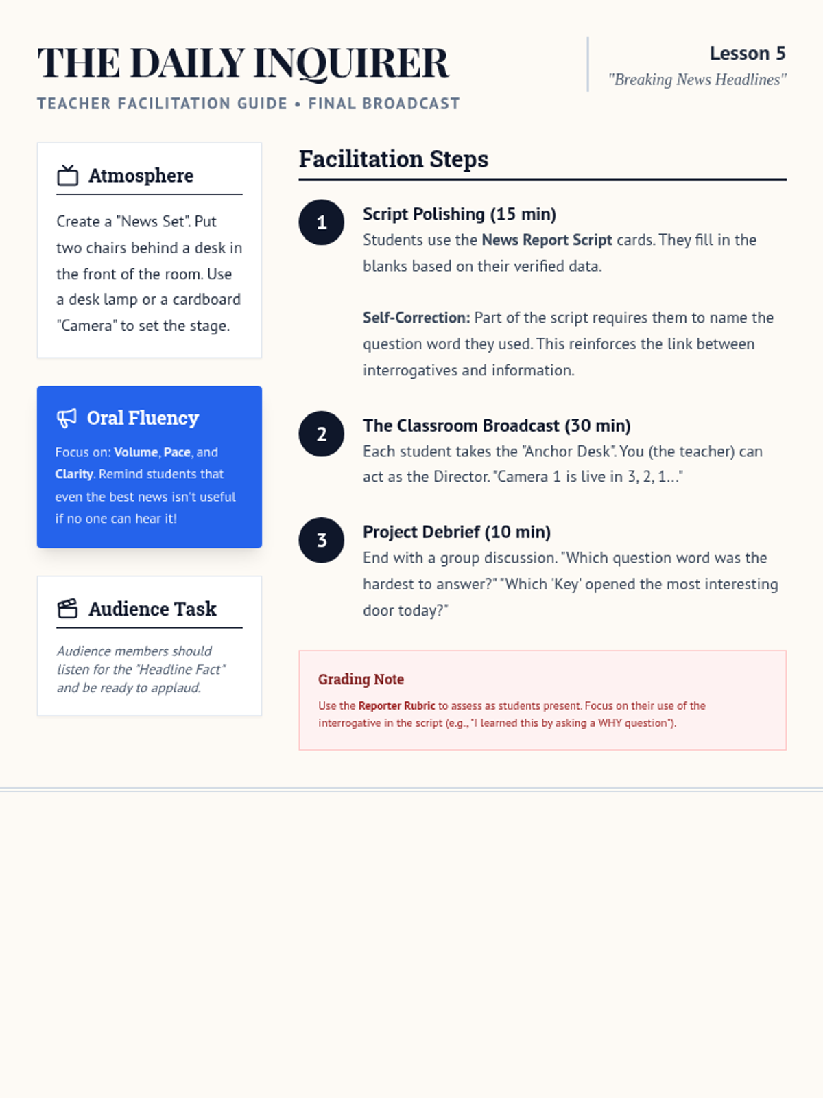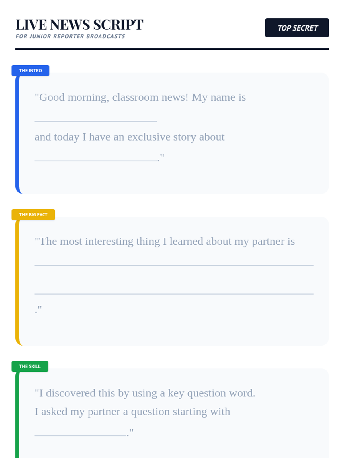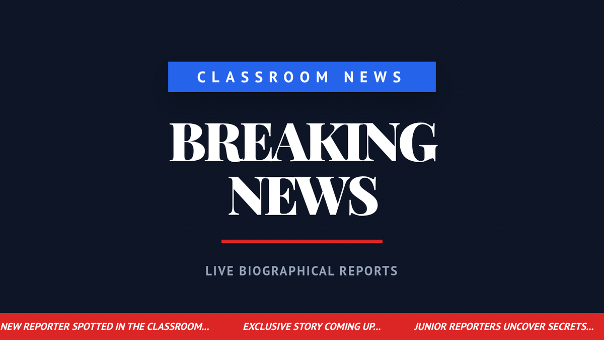 Students present their biographical findings in a classroom news broadcast format, highlighting the most interesting discovery from their interview.