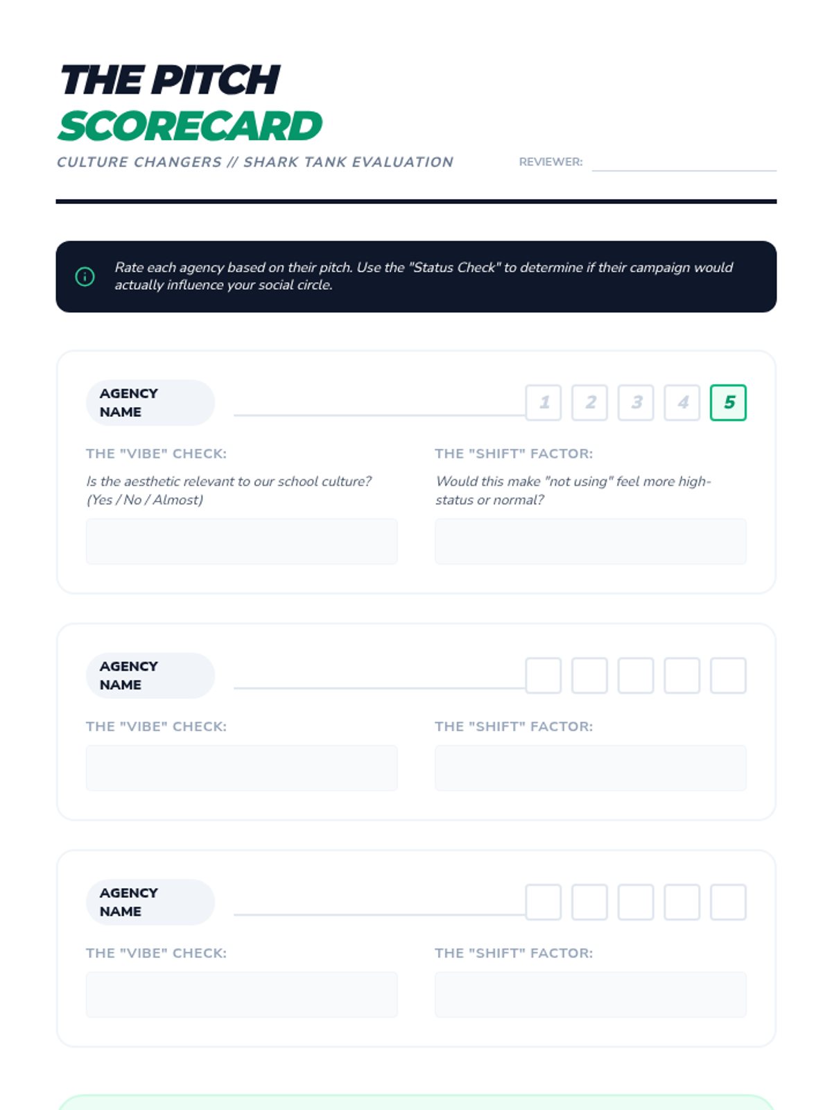 Students pitch their advocacy campaigns to a panel, focusing on the potential for cultural shift within their school.