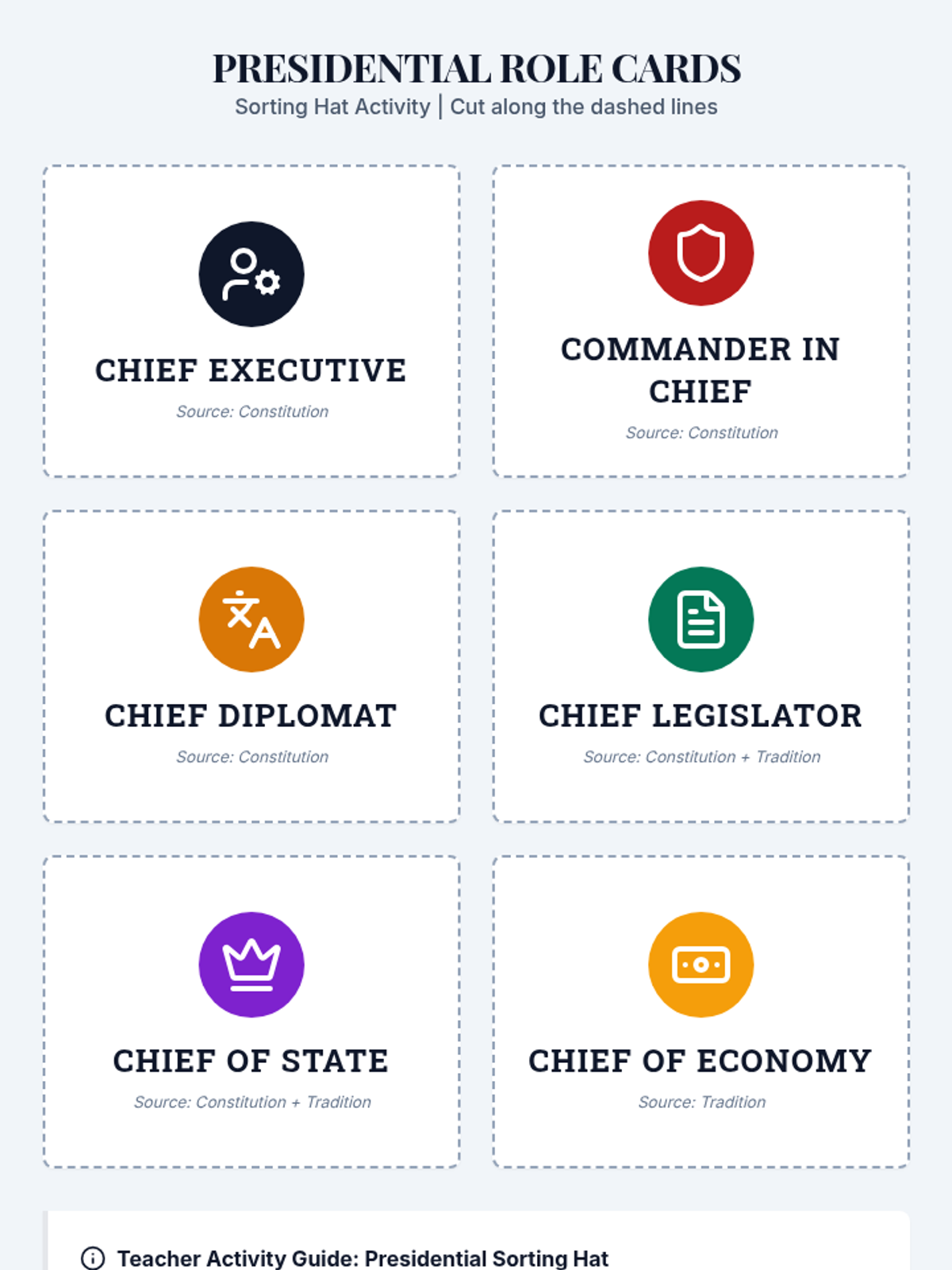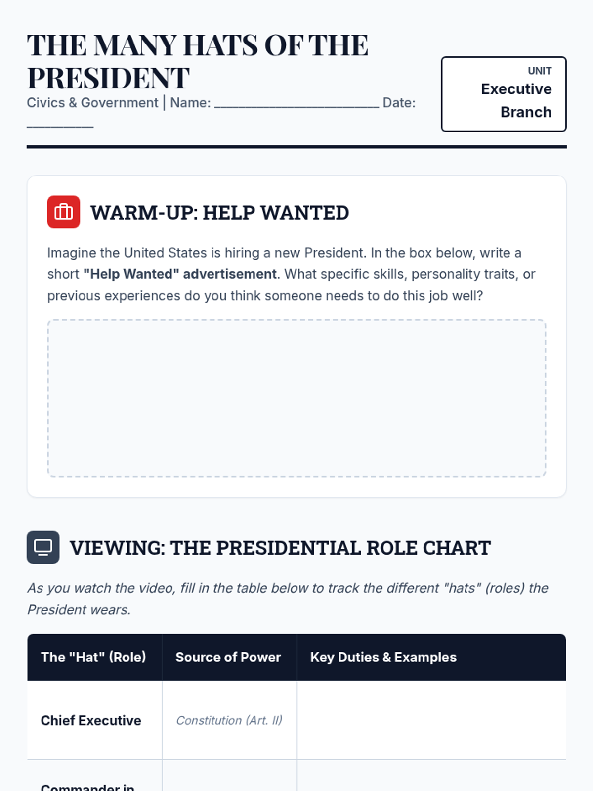A comprehensive civics lesson exploring the various roles of the U.S. President, distinguishing between constitutional powers and those developed through tradition. Students analyze a video, complete a guided role chart, and participate in a scenario-based sorting activity.