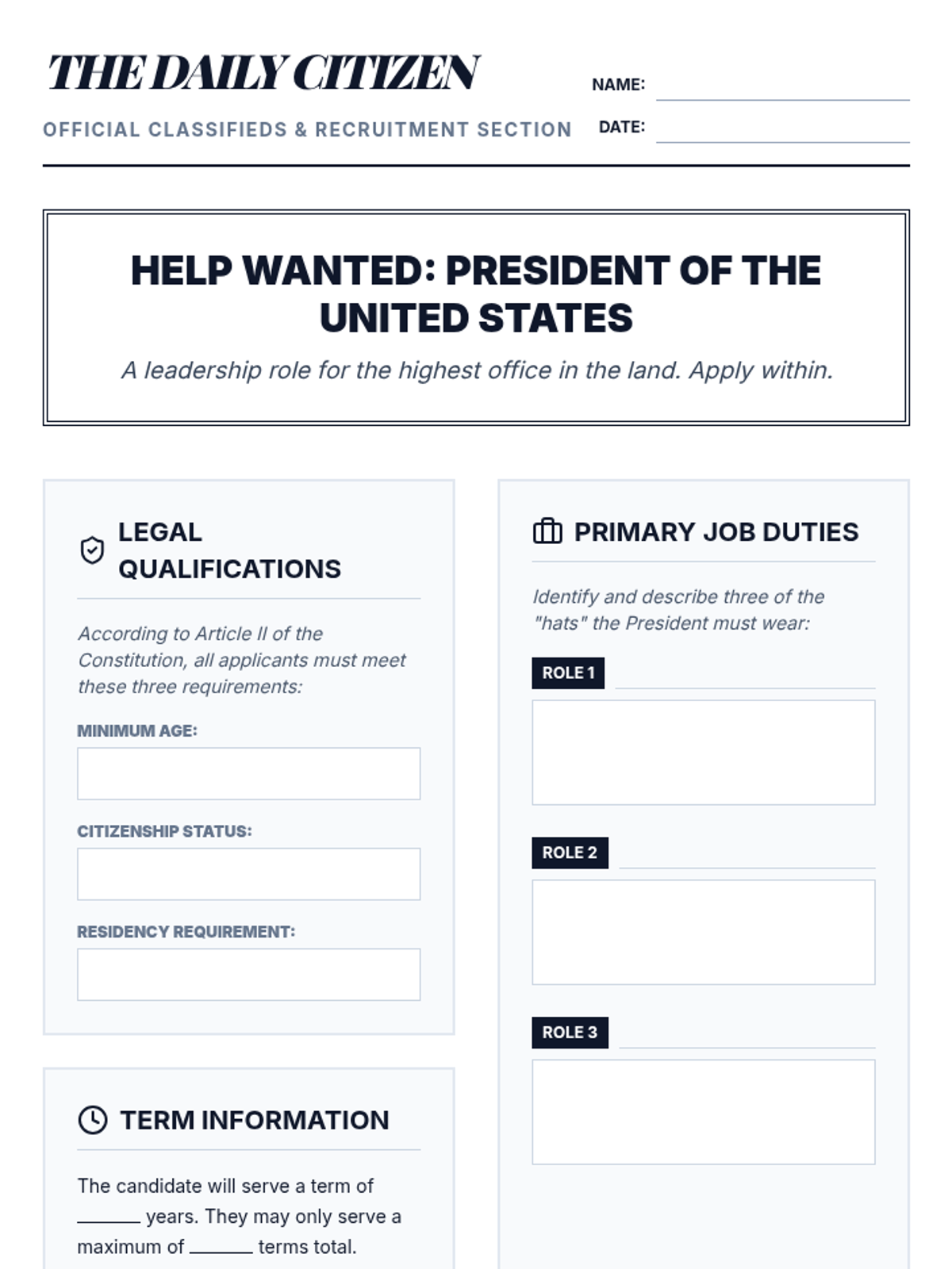 Students analyze the constitutional requirements and primary job responsibilities of the President, creating a 'Help Wanted' advertisement for the role.