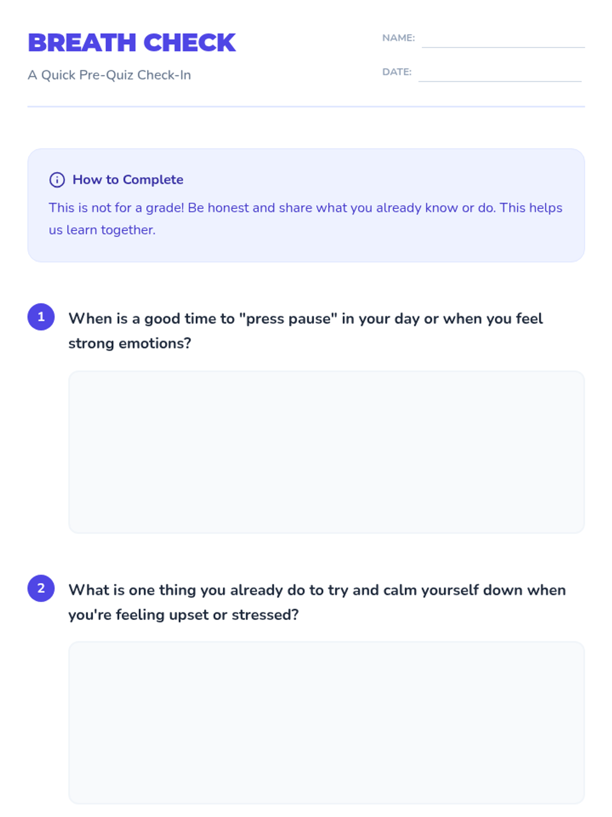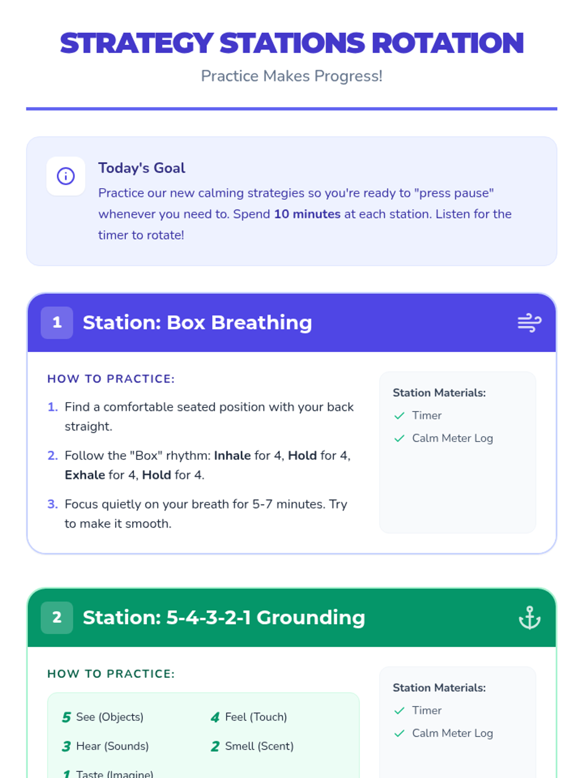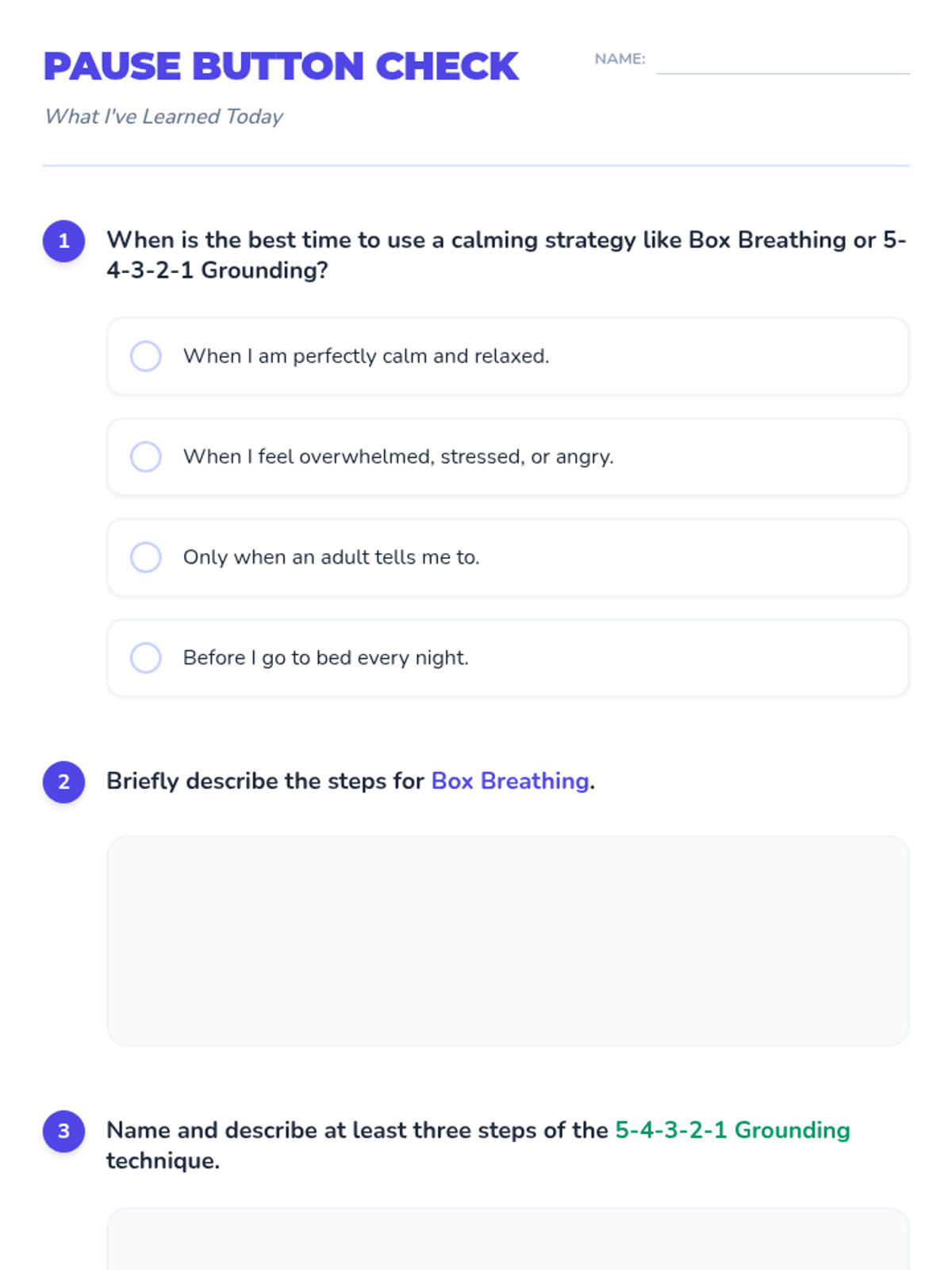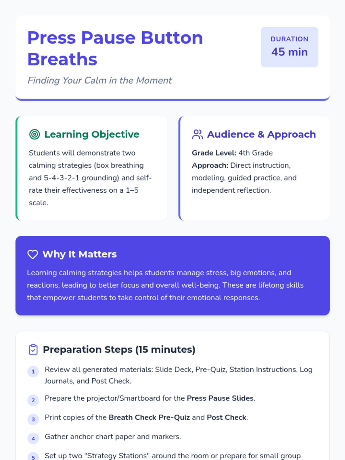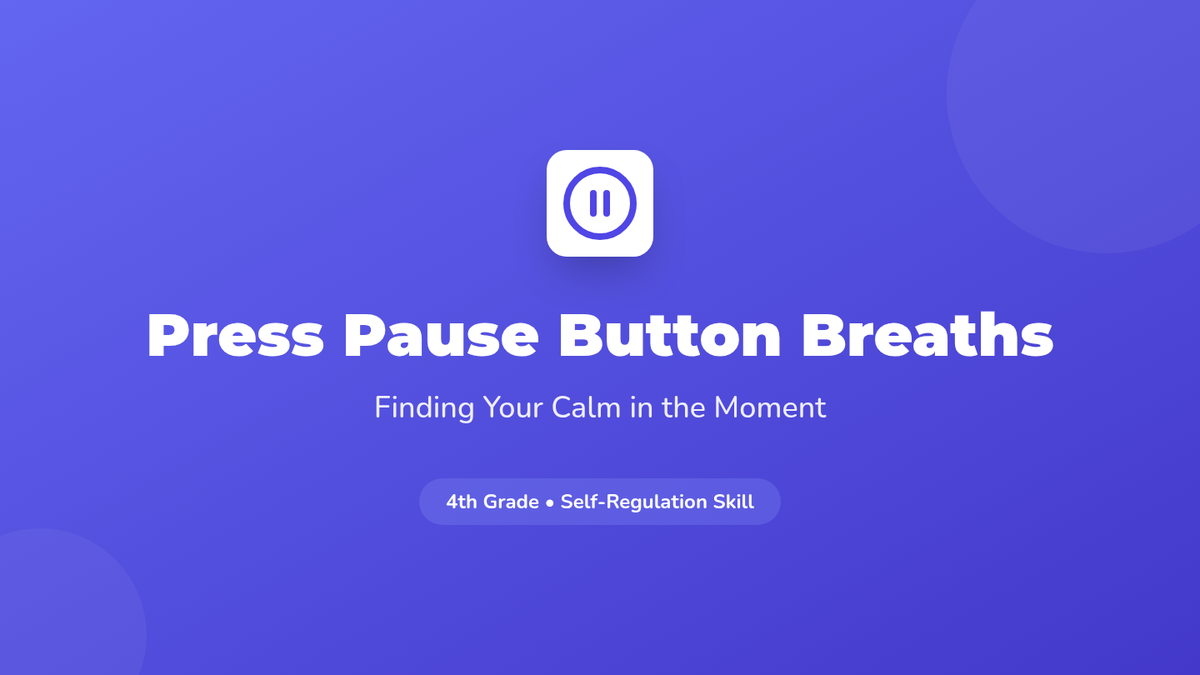 A 45-minute lesson for 4th graders teaching box breathing and 5-4-3-2-1 grounding to manage emotions and reactions through the concept of 'pressing pause'.