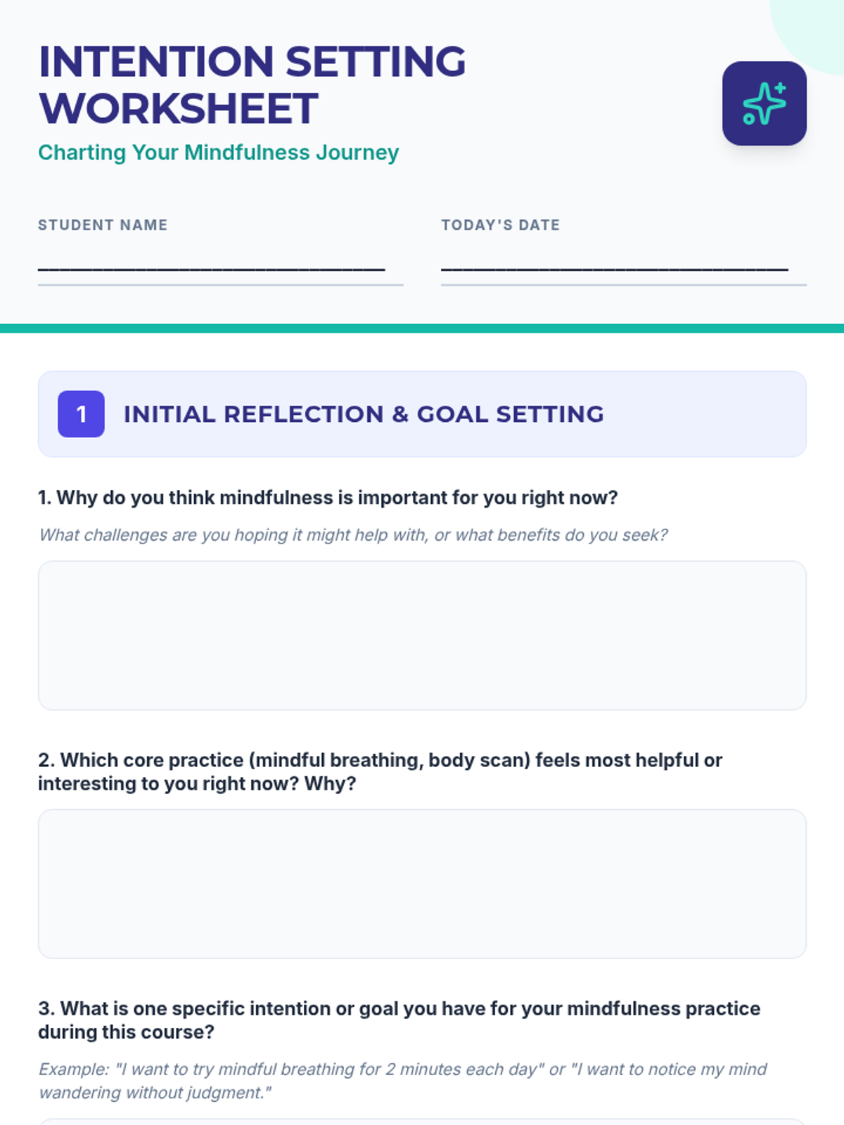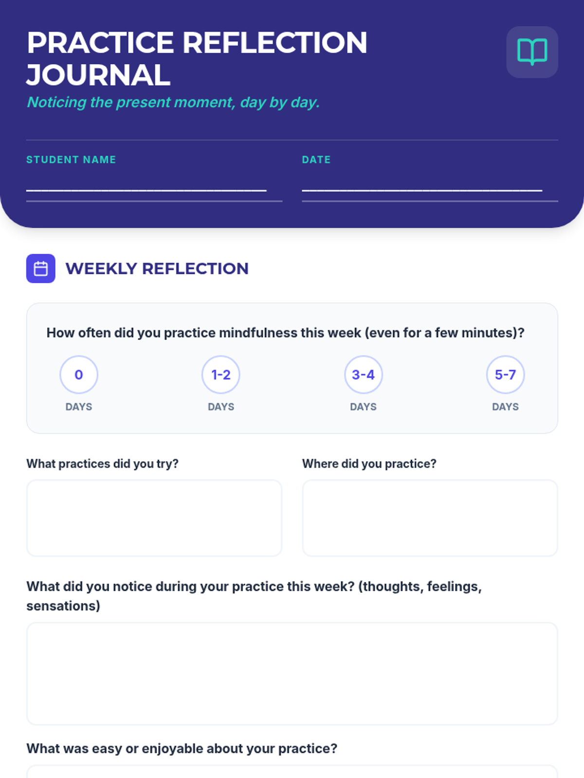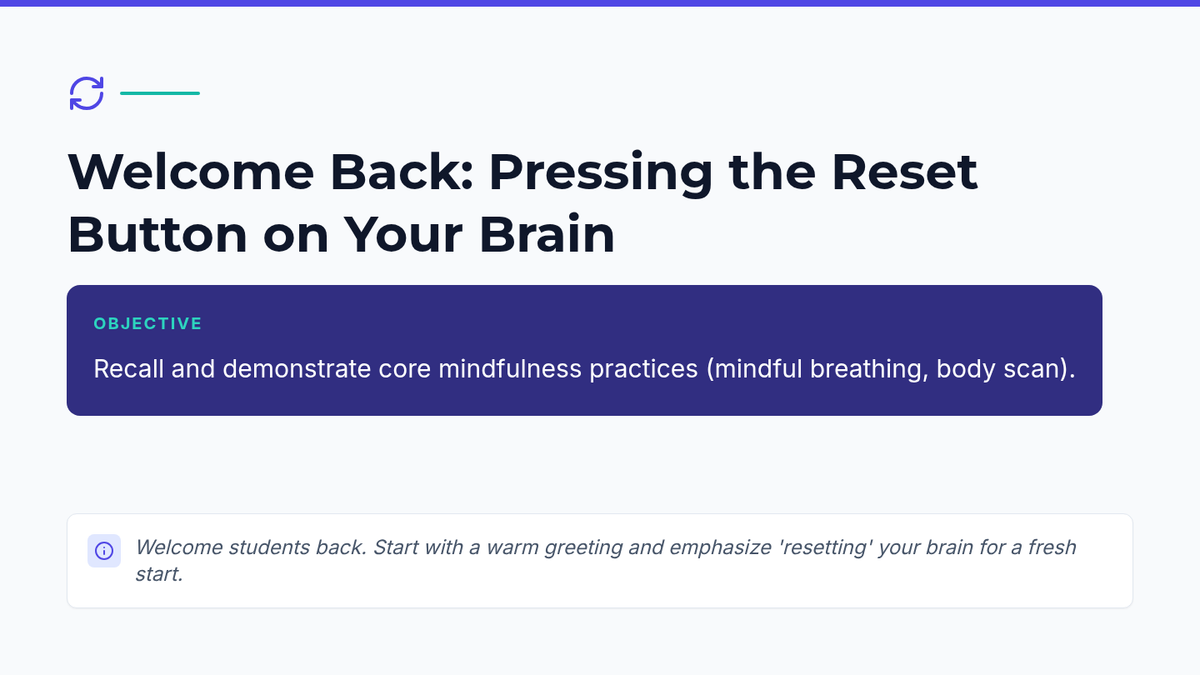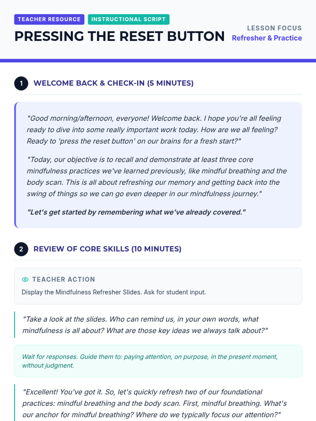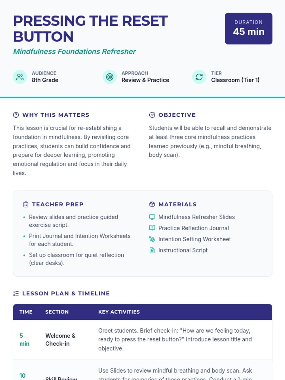 This lesson helps 8th-grade students recall and demonstrate core mindfulness practices. It emphasizes consistency and a beginner's mind, preparing them for deeper engagement in the course.