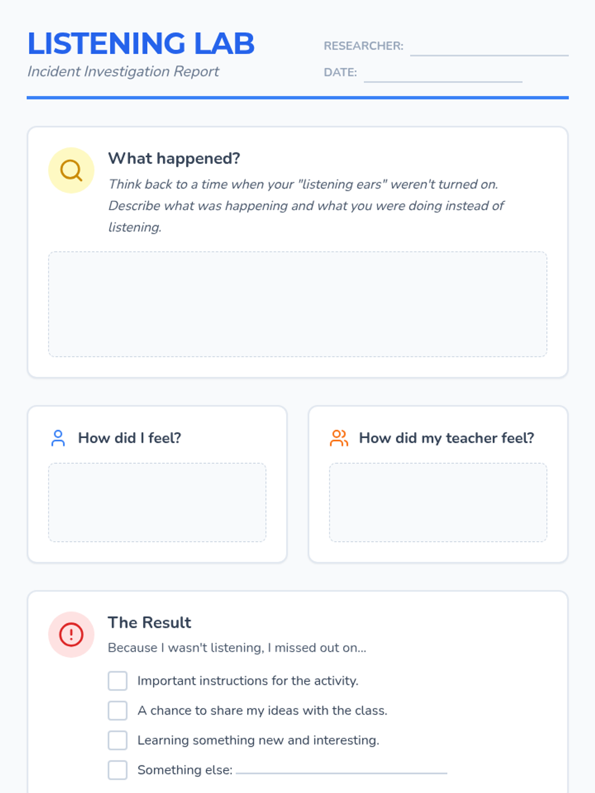 A restorative reflection lesson designed to help students understand the impact of not listening and develop better classroom communication habits through self-reflection.