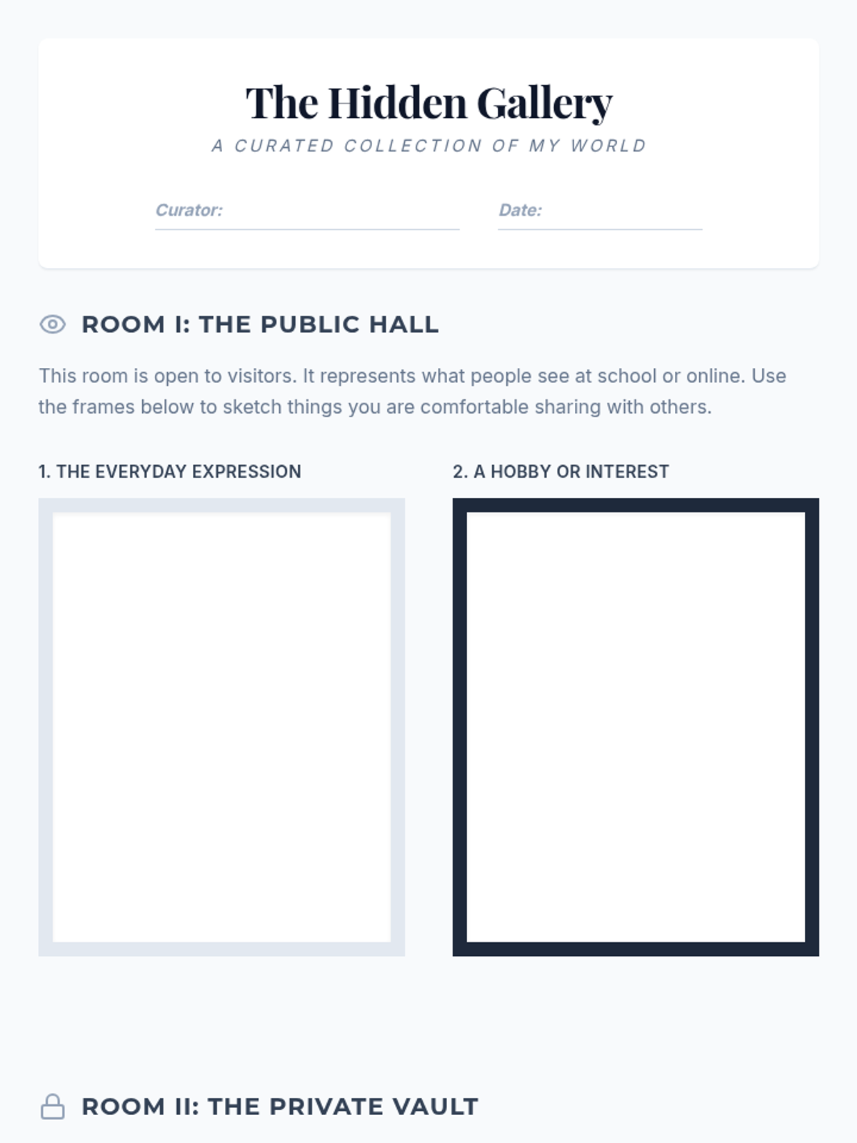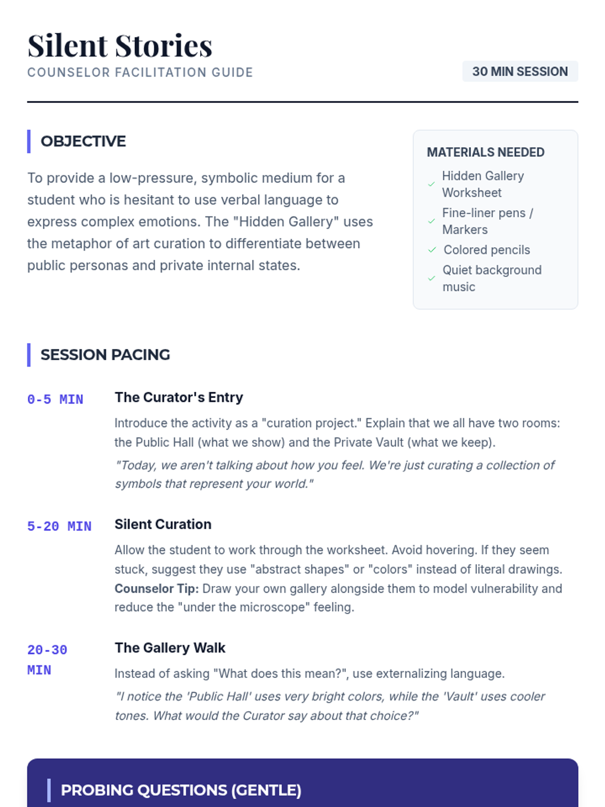 A creative counseling session designed for students who are hesitant to share feelings verbally. This lesson uses a "Hidden Gallery" art activity to explore the difference between public personas and private emotions in a low-pressure, symbolic way.