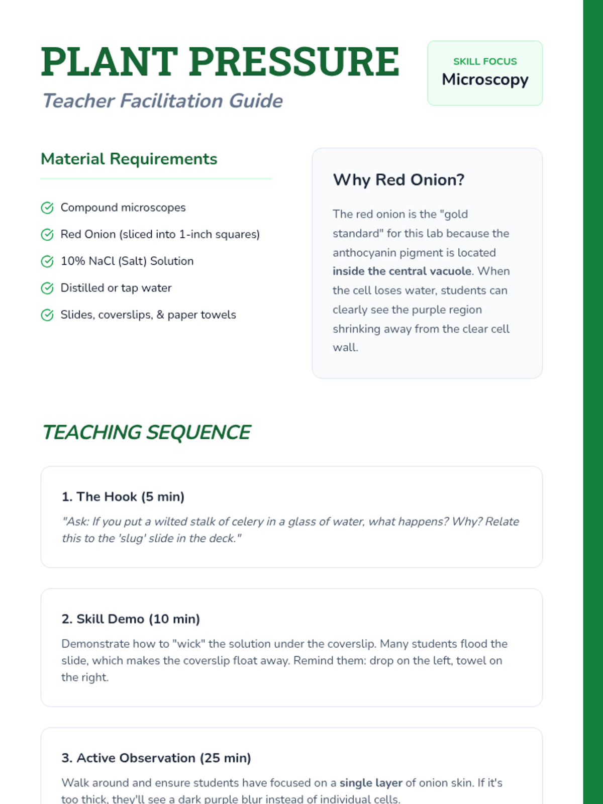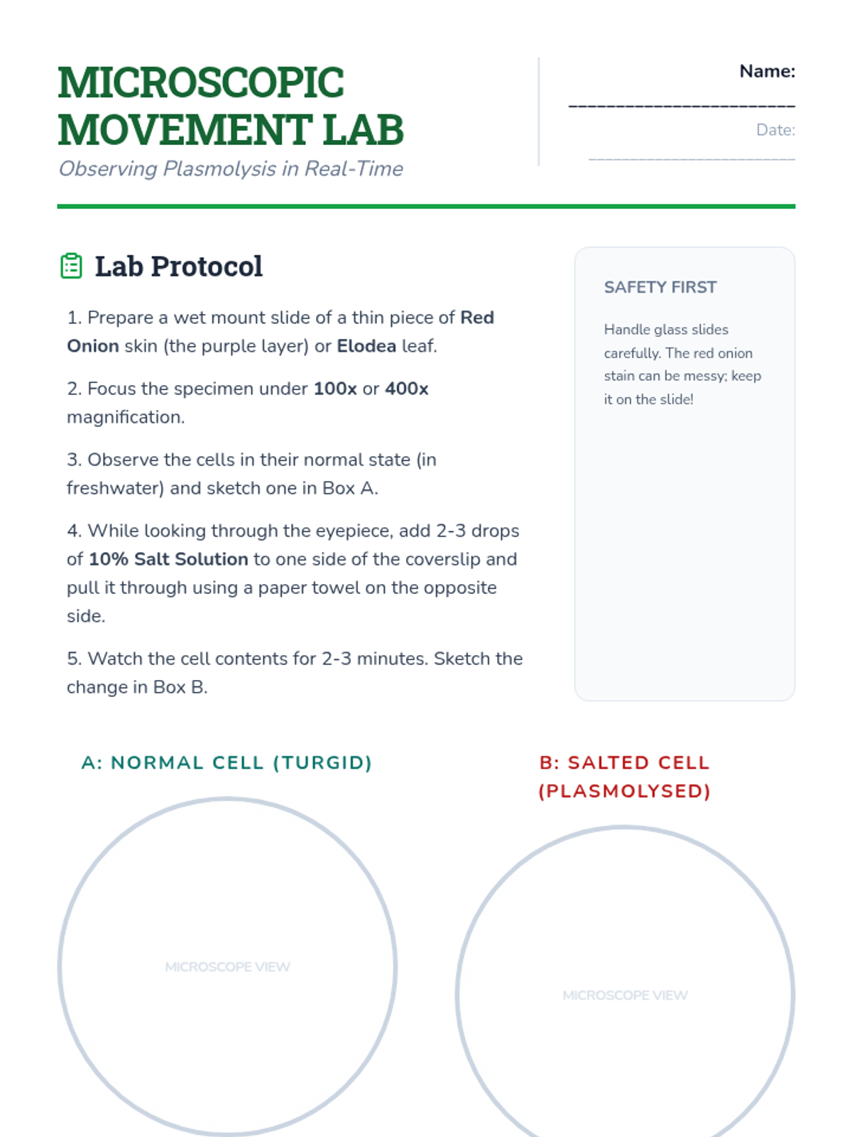 Students prepare wet mount slides of red onion or Elodea cells and expose them to saline solutions to observe plasmolysis under a microscope. They sketch the cellular changes and explain turgor pressure in relation to the cell wall.