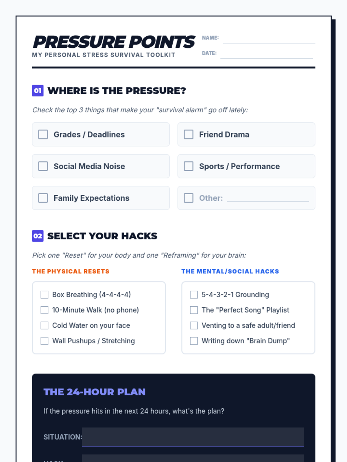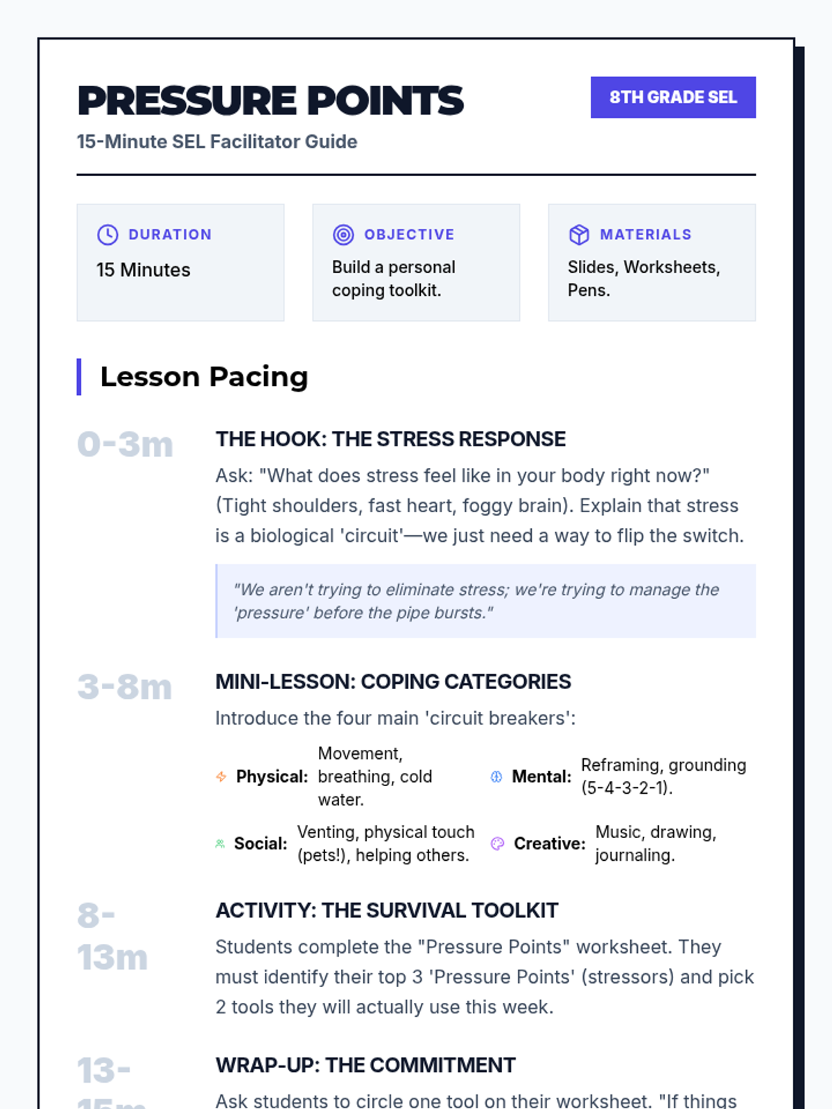 A fast-paced, 15-minute SEL lesson designed for 8th graders to identify personal stressors and build a customized toolkit of healthy coping strategies.