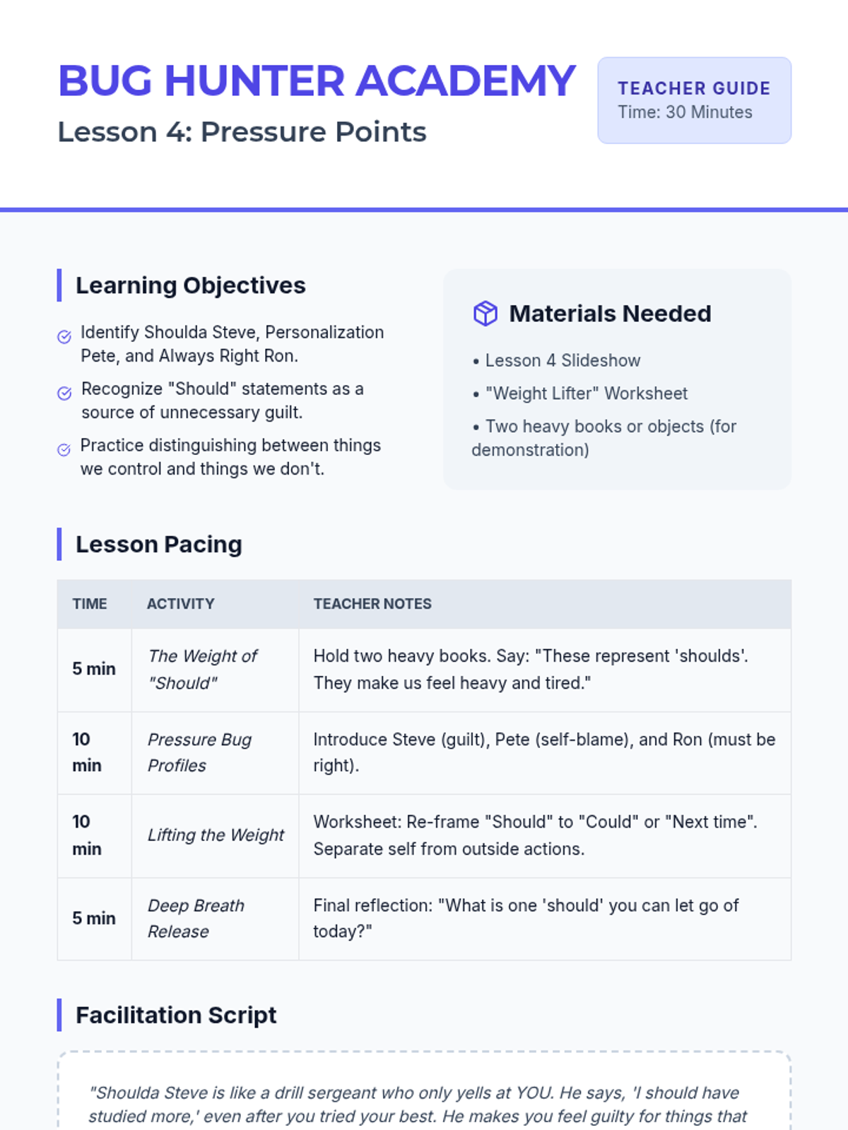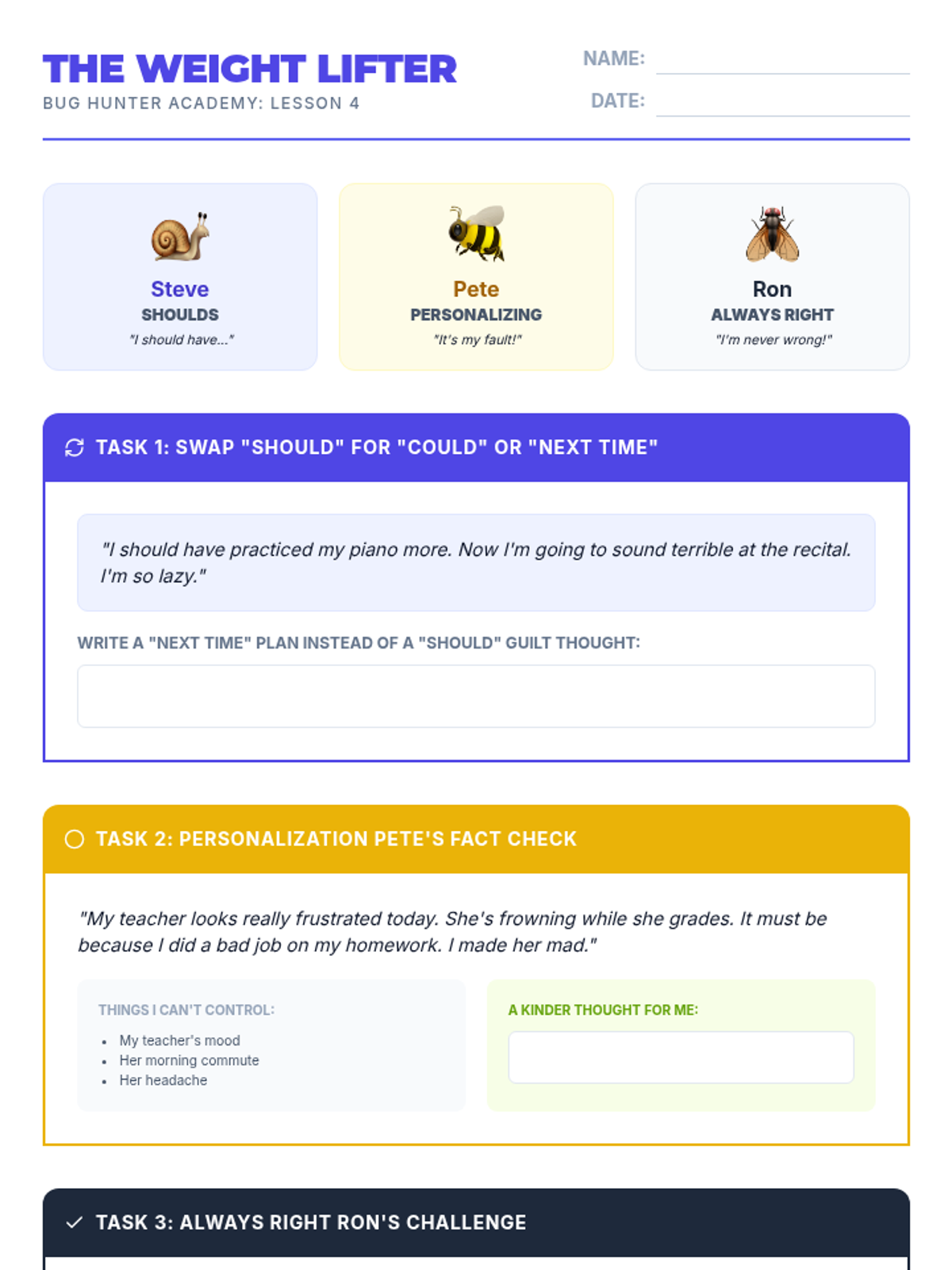 Focuses on thoughts that create internal pressure and guilt through 'shoulds' and unnecessary self-blame, featuring Shoulda Steve, Personalization Pete, and Always Right Ron.