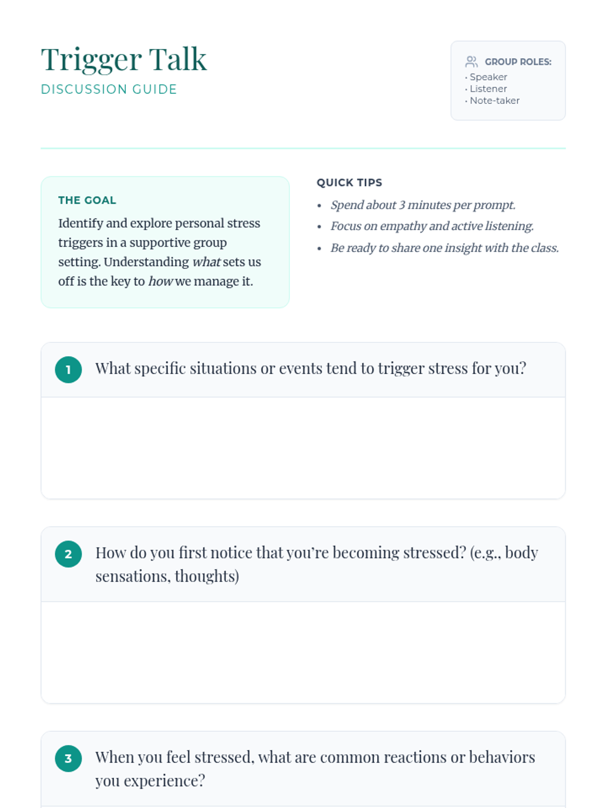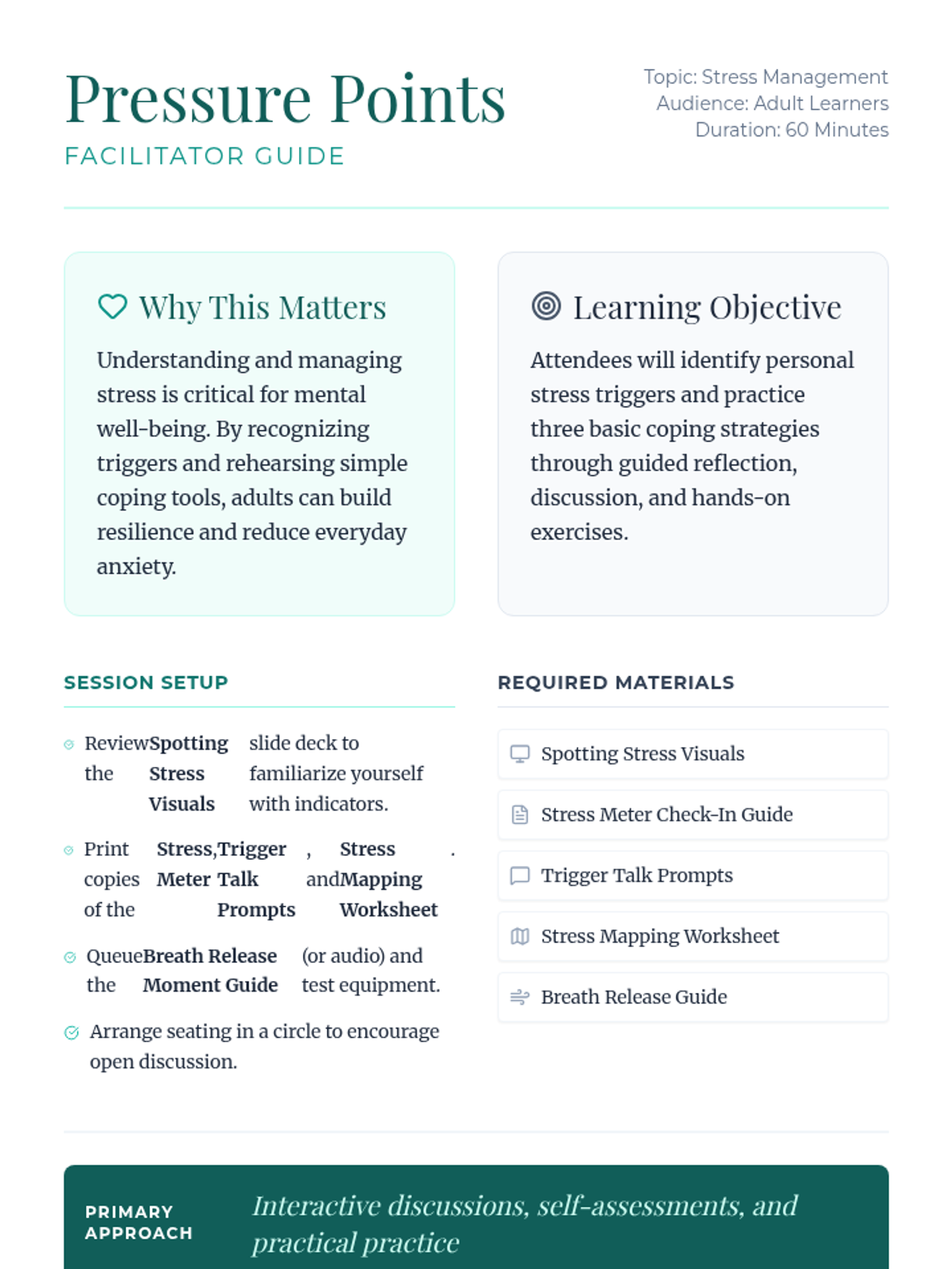 A 60-minute adult session focused on identifying personal stress triggers and practicing fundamental coping strategies to build resilience and mental well-being.