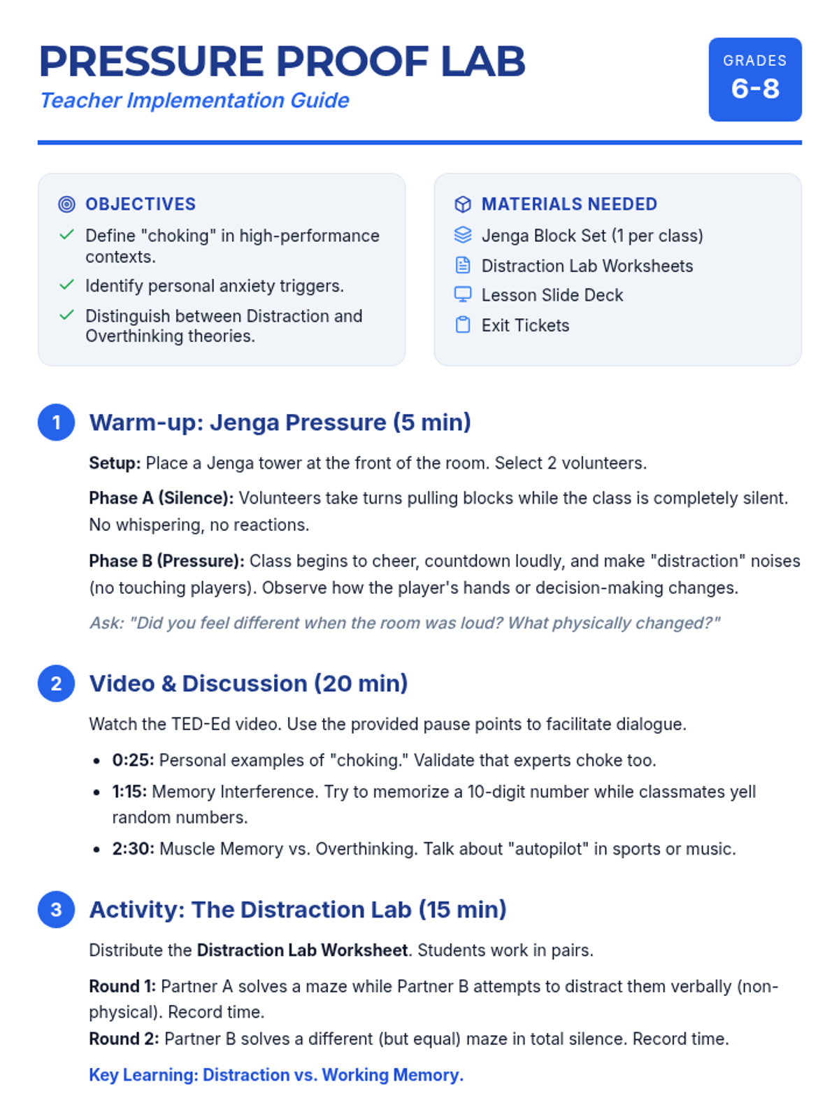 A lesson exploring the psychology of 'choking' under pressure, teaching students to identify distraction and overthinking theories and apply strategies to stay calm.
