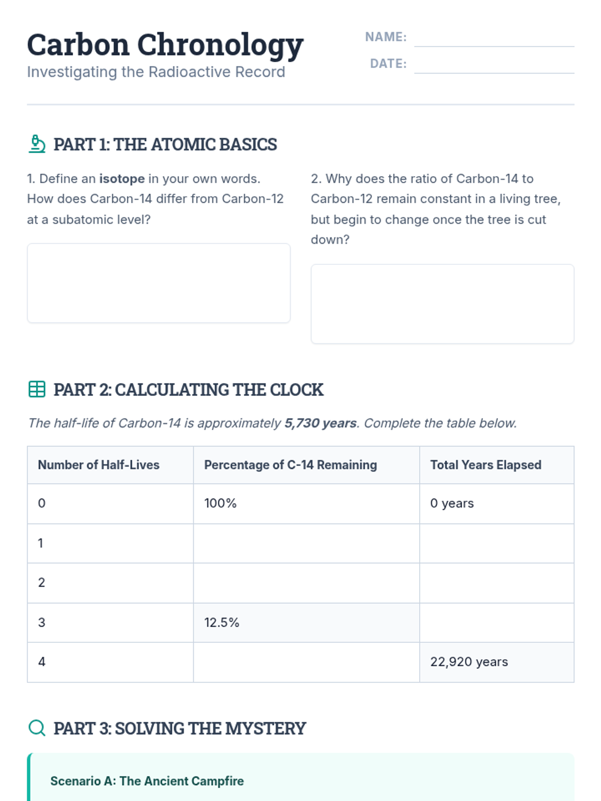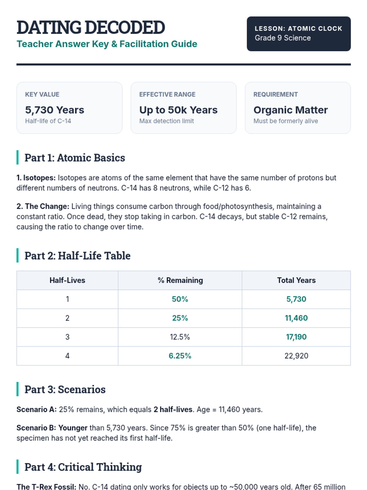 An introductory lesson on Carbon-14 dating for 9th-grade science, covering isotopes, radioactive decay, and calculating the age of organic remains.