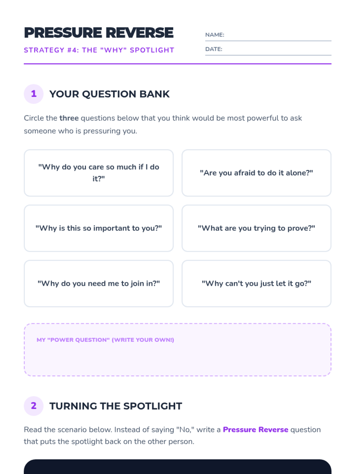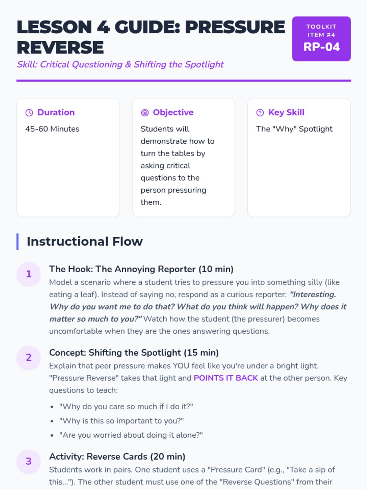 Students learn to turn the tables by questioning the person pressuring them, shifting the focus off themselves.