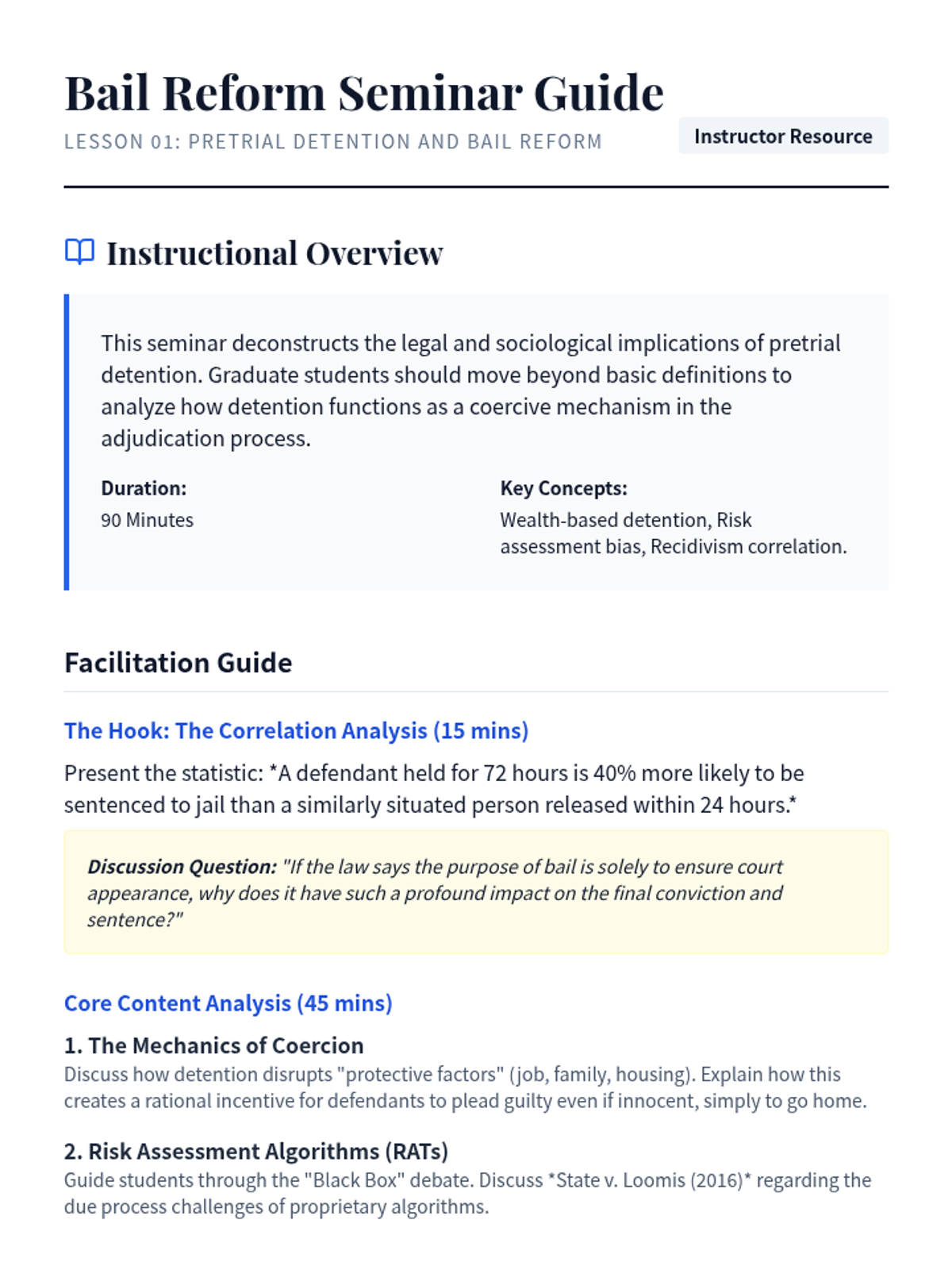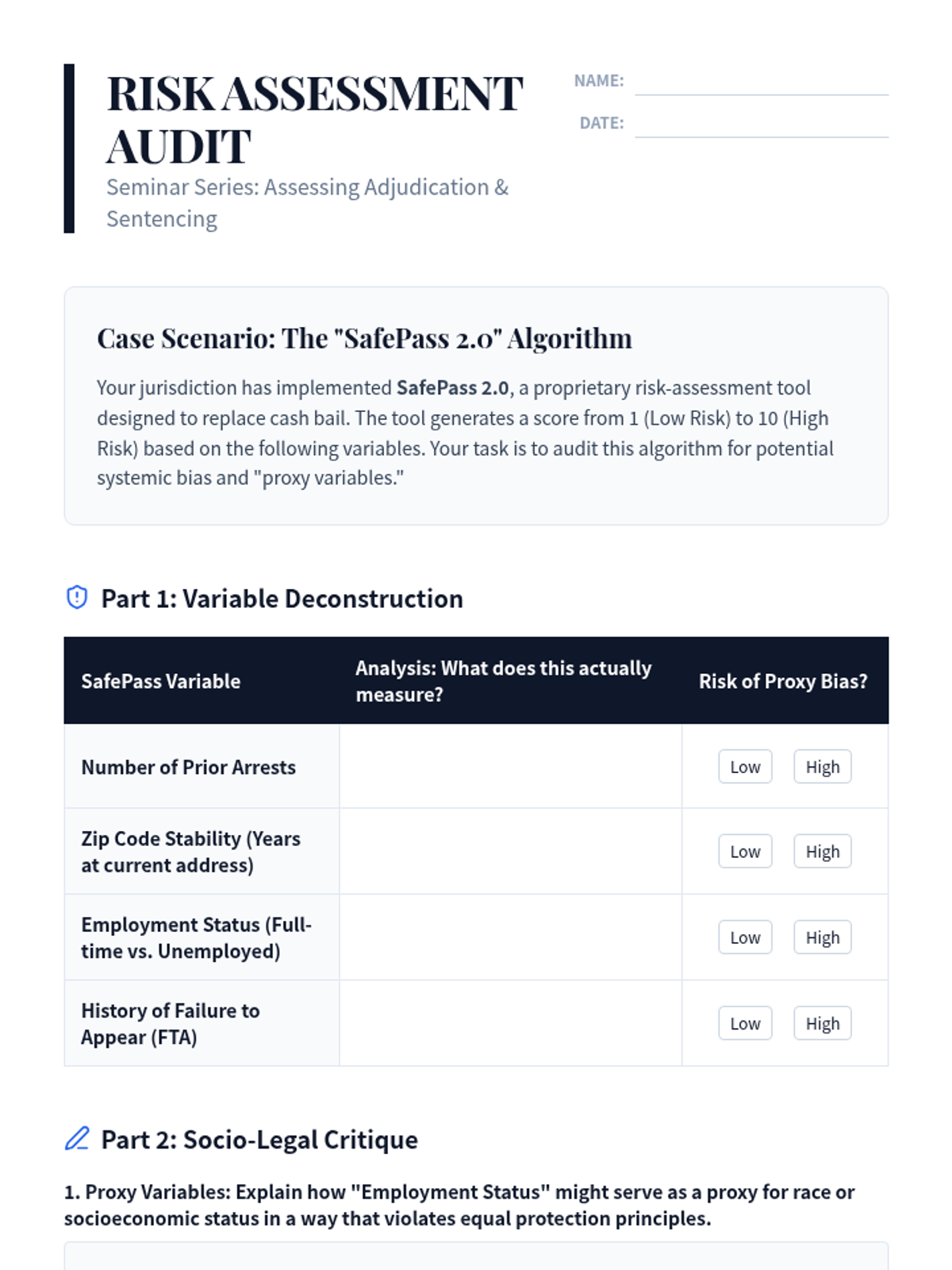 Students analyze the impact of cash bail on case outcomes and socioeconomic disparities, comparing risk assessment algorithms with traditional bail schedules.