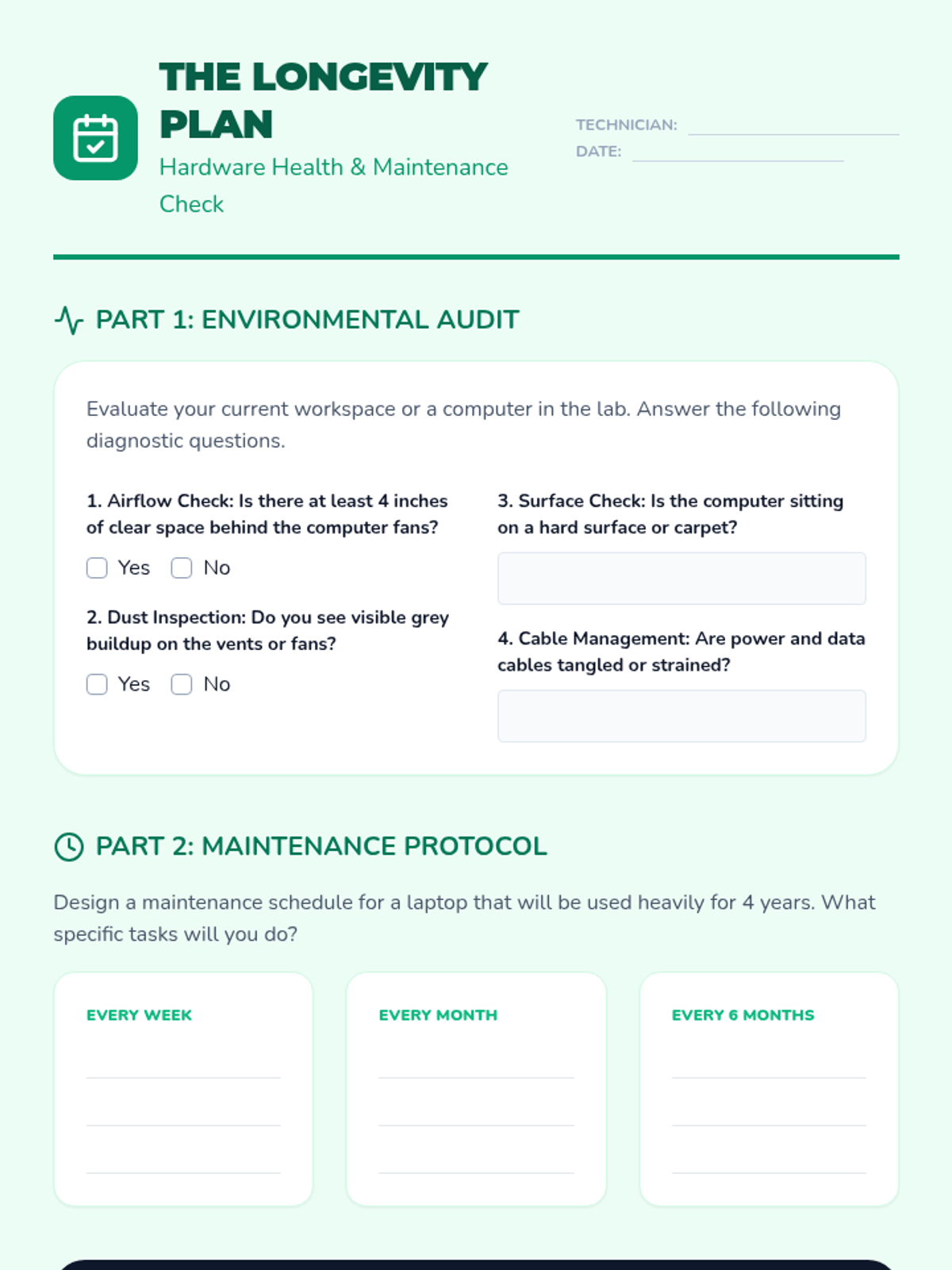 Students focus on the long-term health of computing systems. They learn how environmental factors like dust and heat lead to hardware degradation and practice creating maintenance schedules that include both physical cleaning and digital optimization (disk health, file organization).