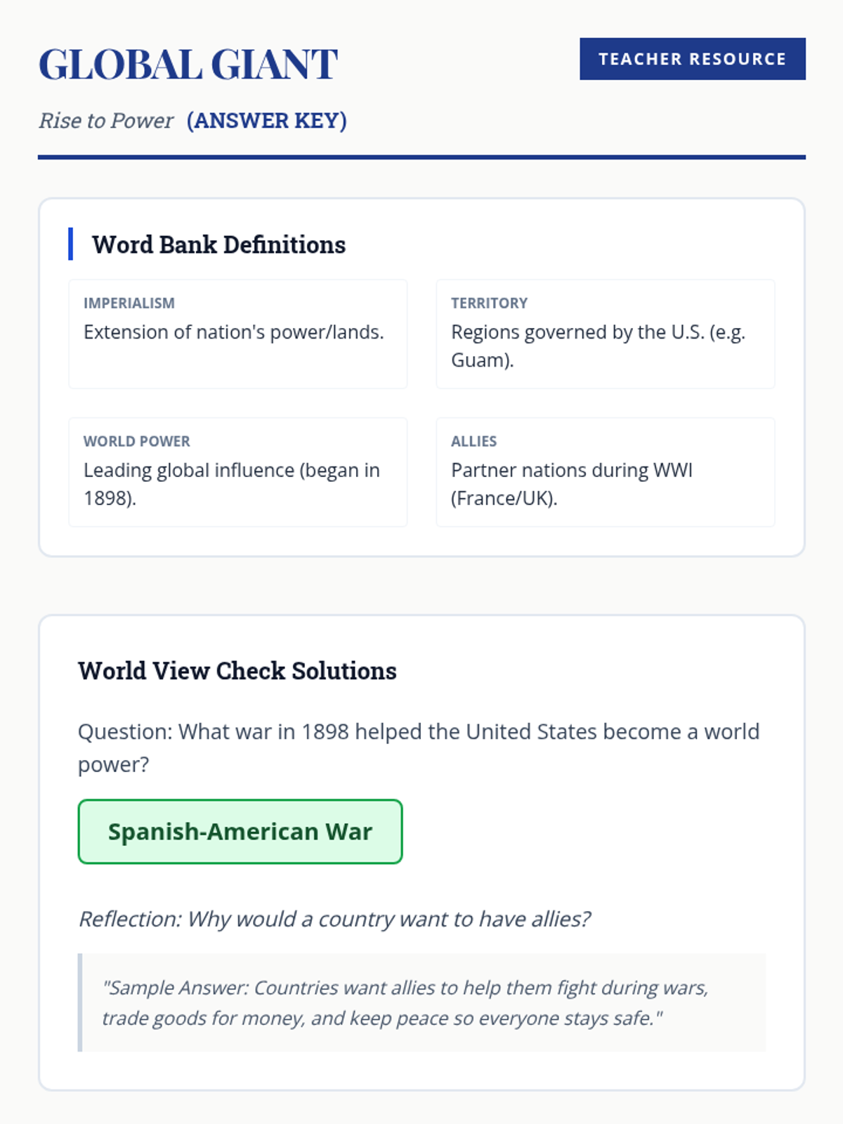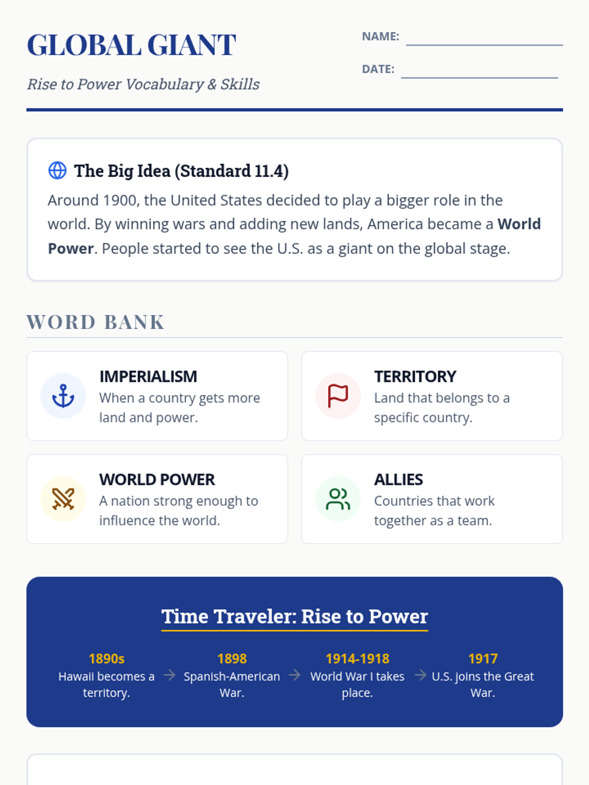 Examining the rise of the United States as a world power in the early twentieth century, including the Spanish-American War and world involvement, based on Grade 11 Standard 11.4.