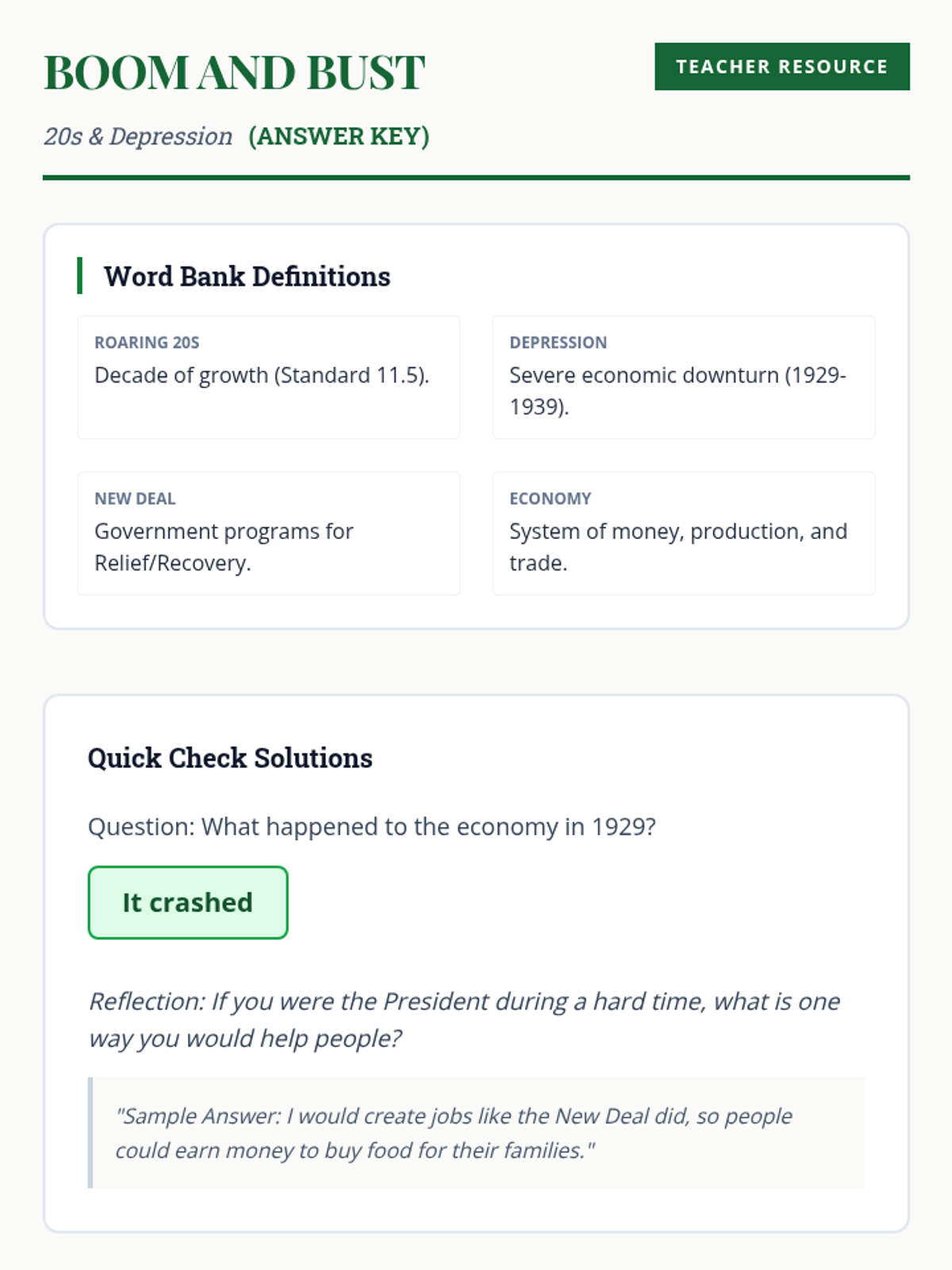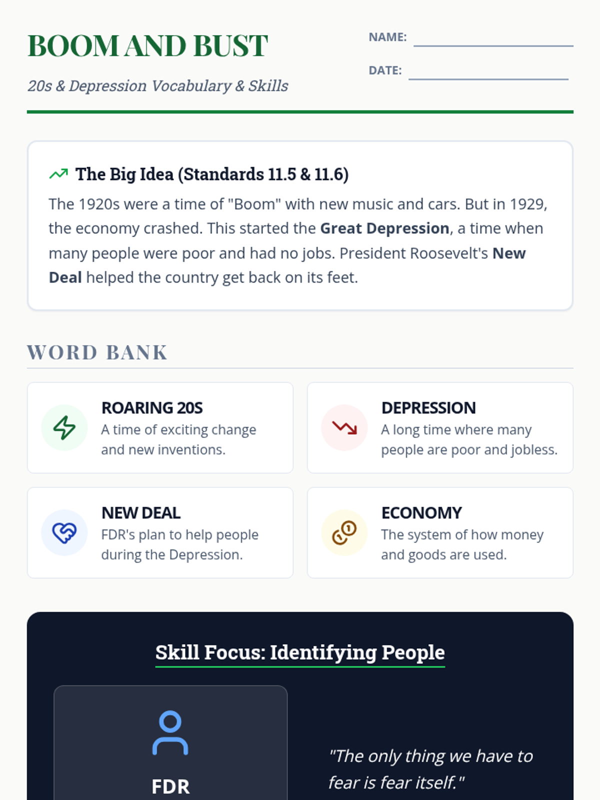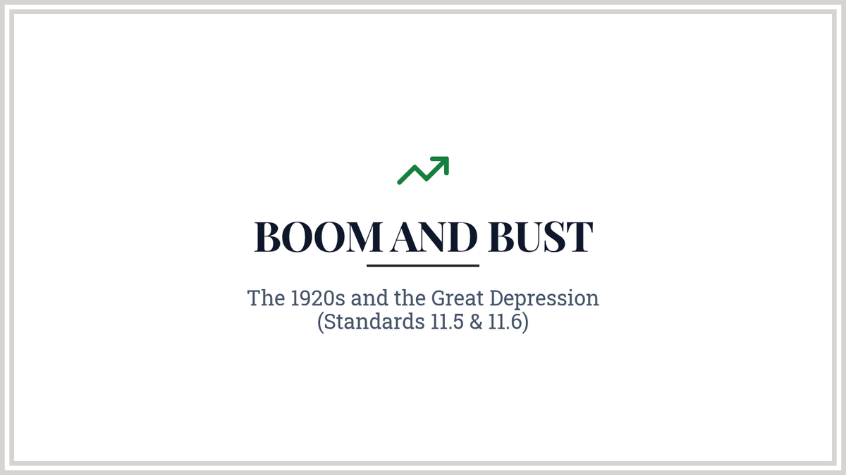 Analyzing the social and economic changes of the 1920s followed by the causes and impacts of the Great Depression and New Deal, based on Grade 11 Standards 11.5 and 11.6.
