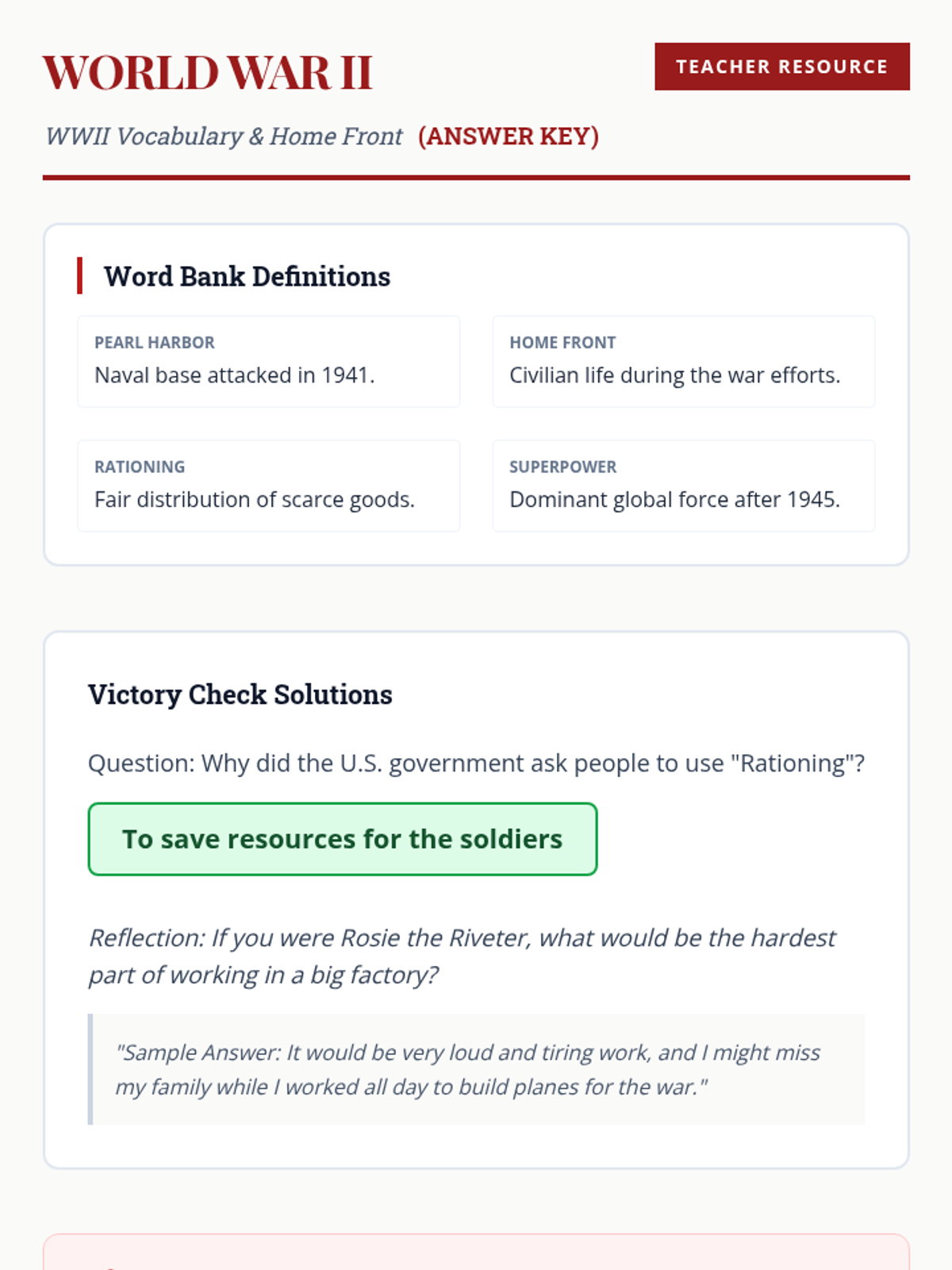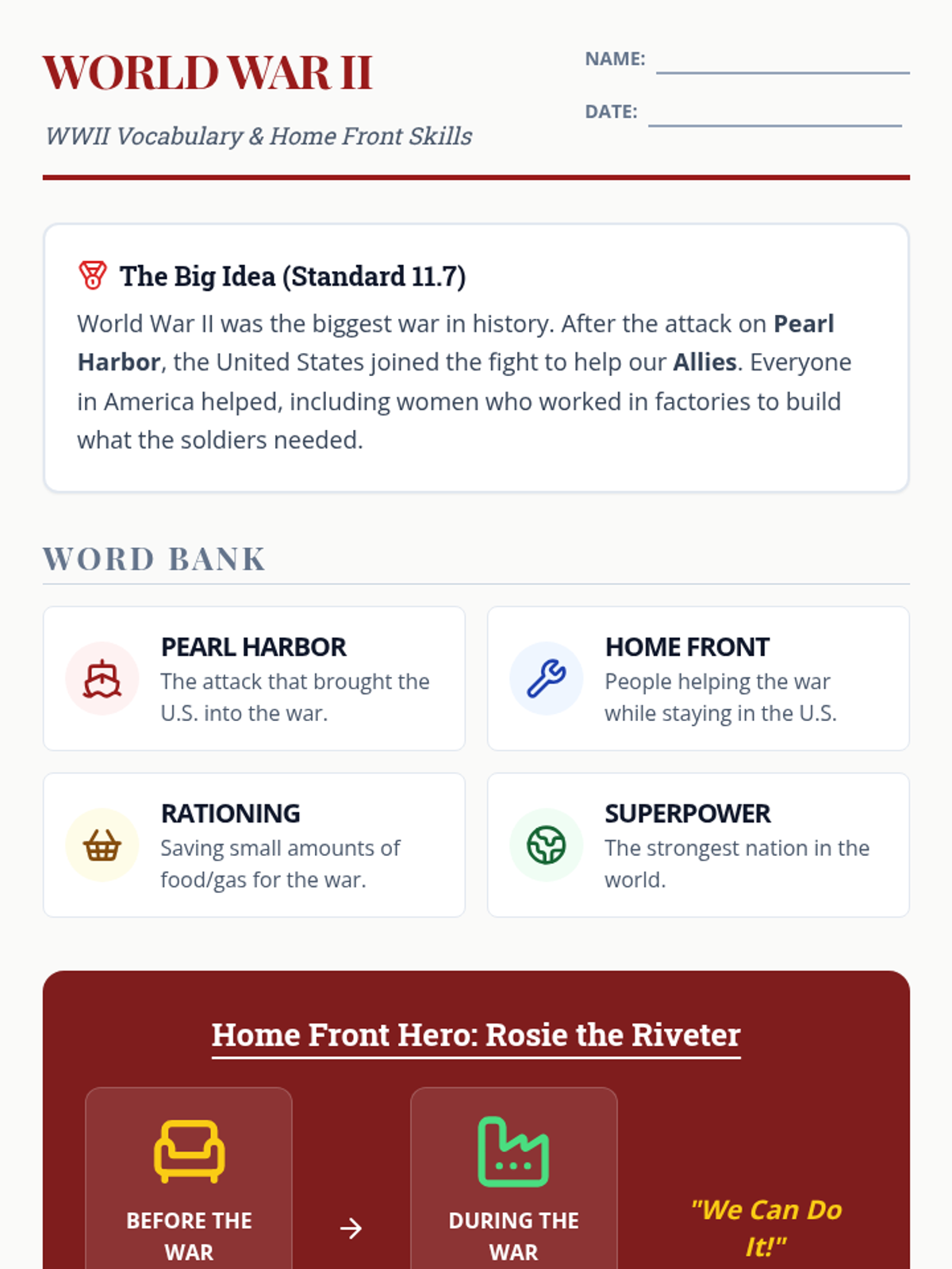 Tracing America's participation in World War II and the changes it brought to the home front, based on Grade 11 Standard 11.7.