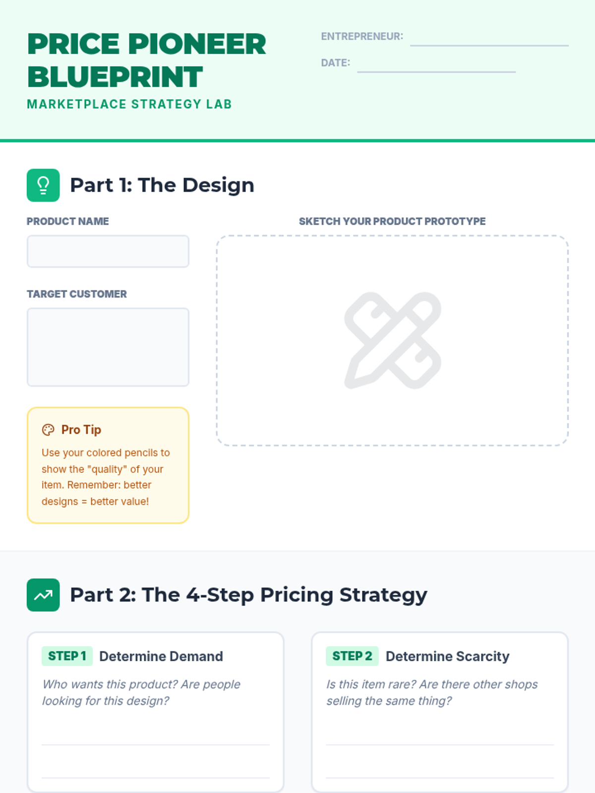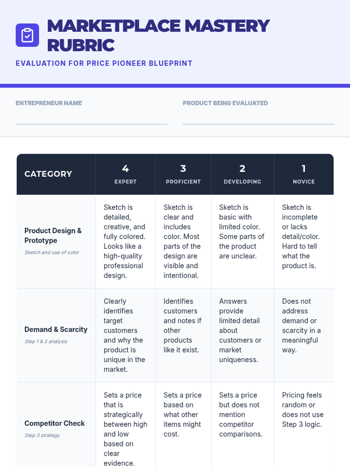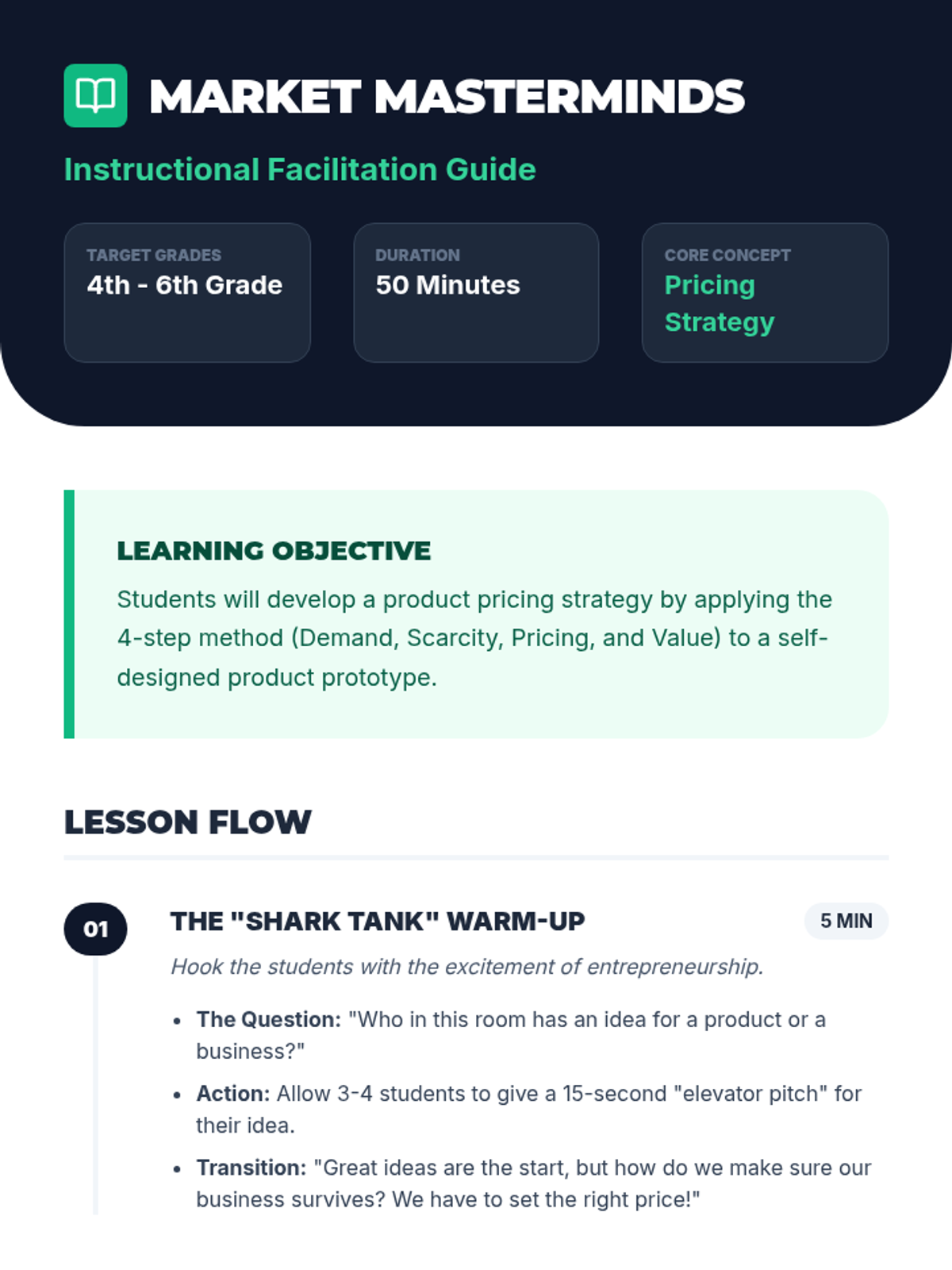 A dynamic introduction to entrepreneurship where students learn to set prices using supply, demand, and scarcity. Students design a product and apply a 4-step pricing strategy inspired by real-world market factors.
