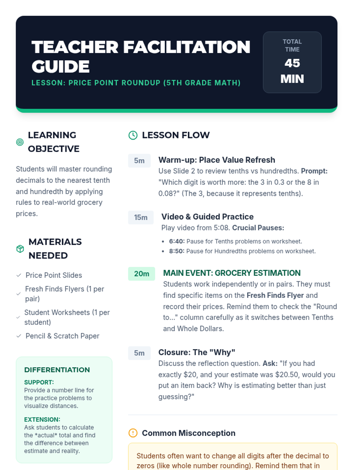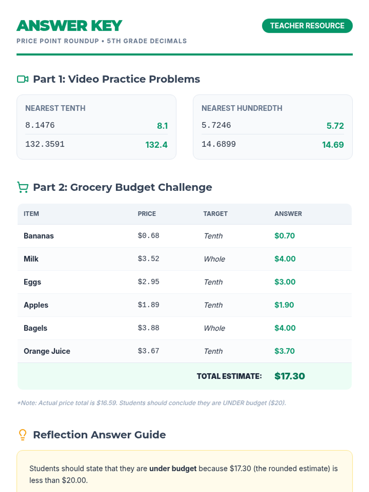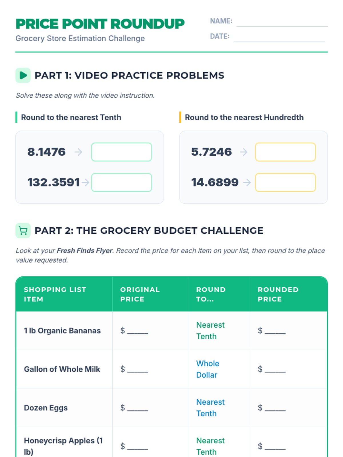 Students master rounding decimals to the nearest tenth and hundredth through place value review, video practice, and a real-world grocery store budgeting activity.