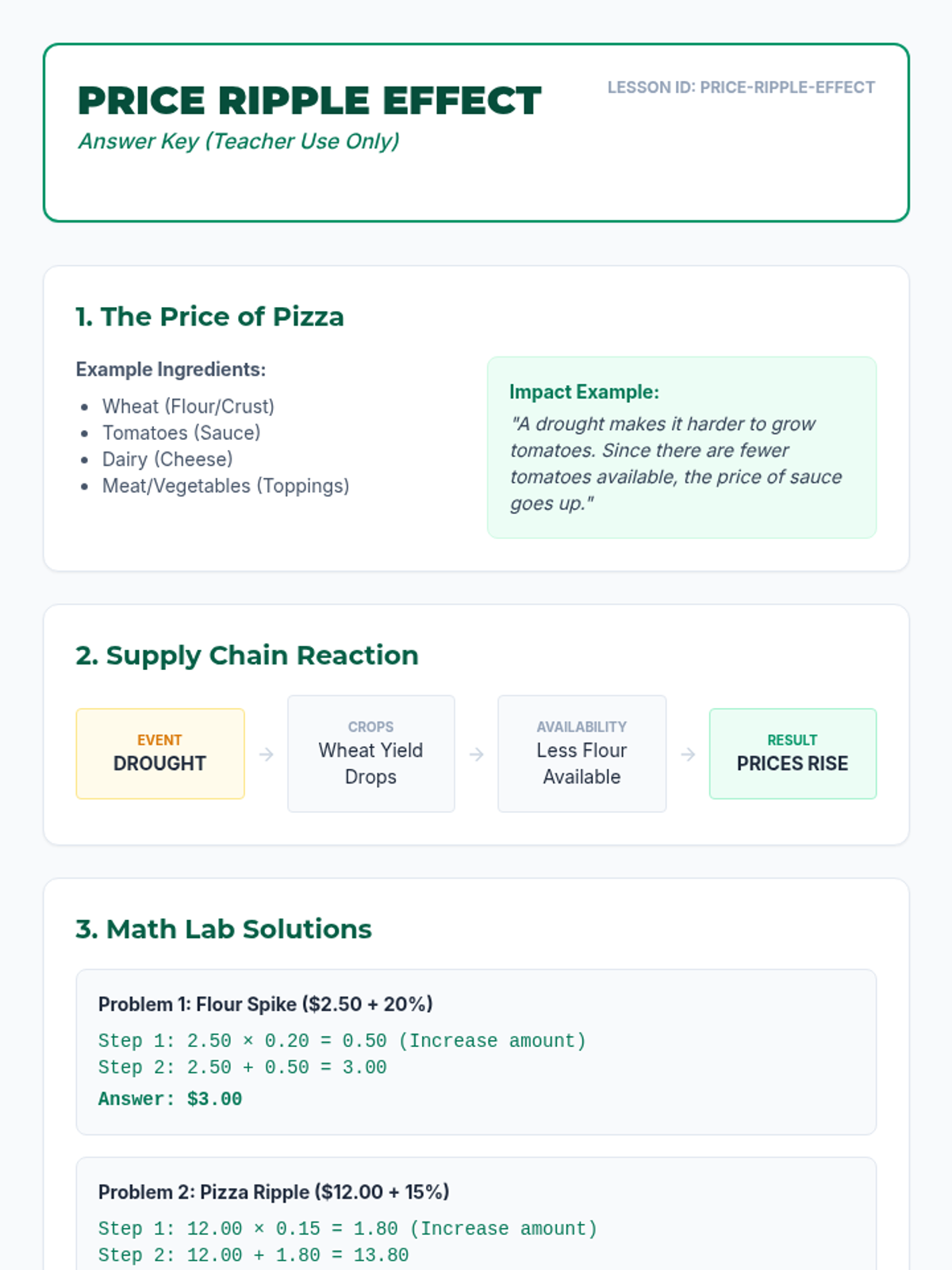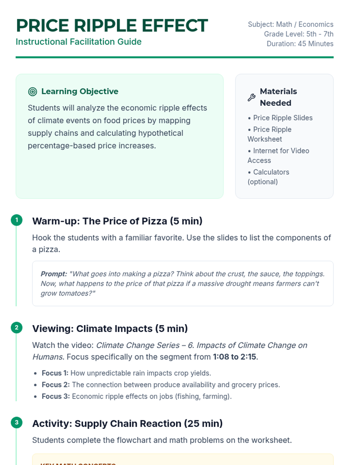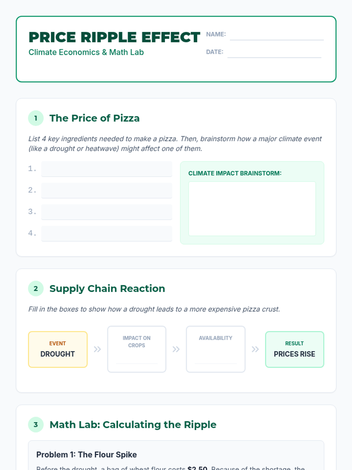 Students explore how climate-driven events like droughts and ocean acidification create economic ripple effects, leading to scarcity and increased food prices, using a pizza-themed supply chain analysis.