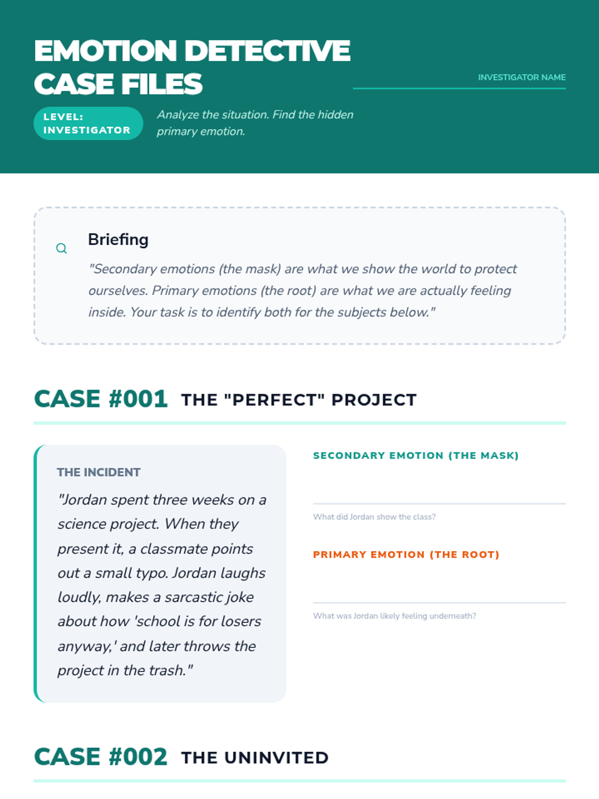 Students investigate the difference between immediate emotional reactions (primary) and the feelings that follow (secondary), focusing on how 'masking' emotions work.