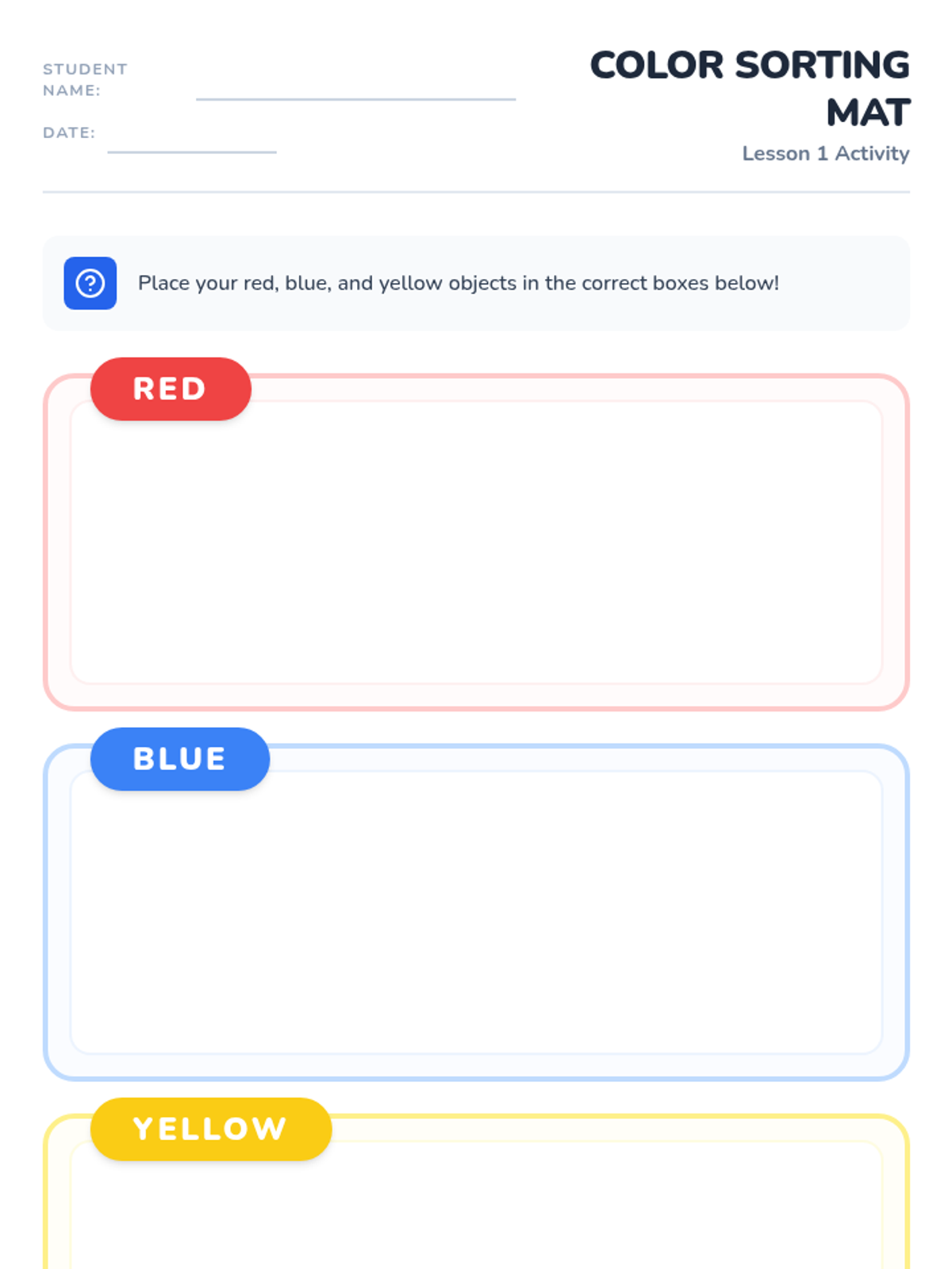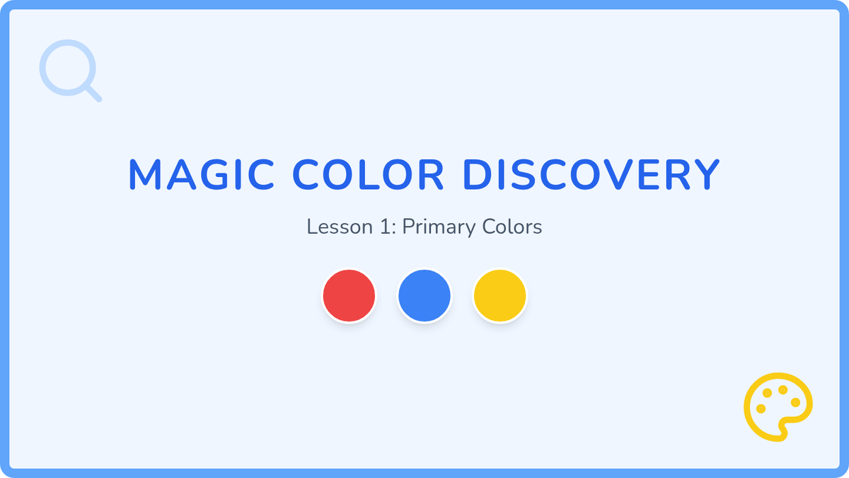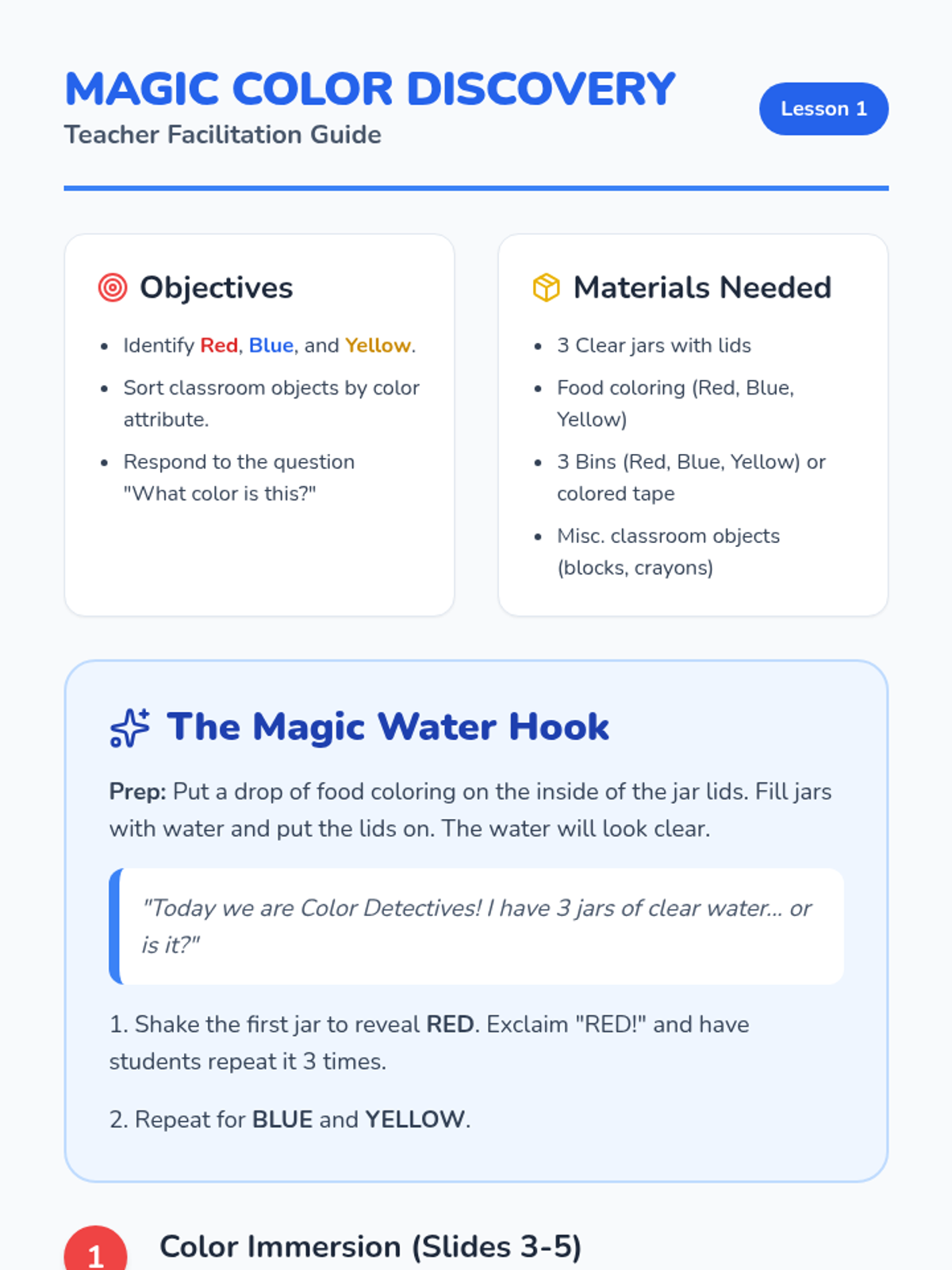 Students are introduced to red, blue, and yellow through a 'magic water' hook and sorting activities to reinforce visual discrimination and vocabulary.