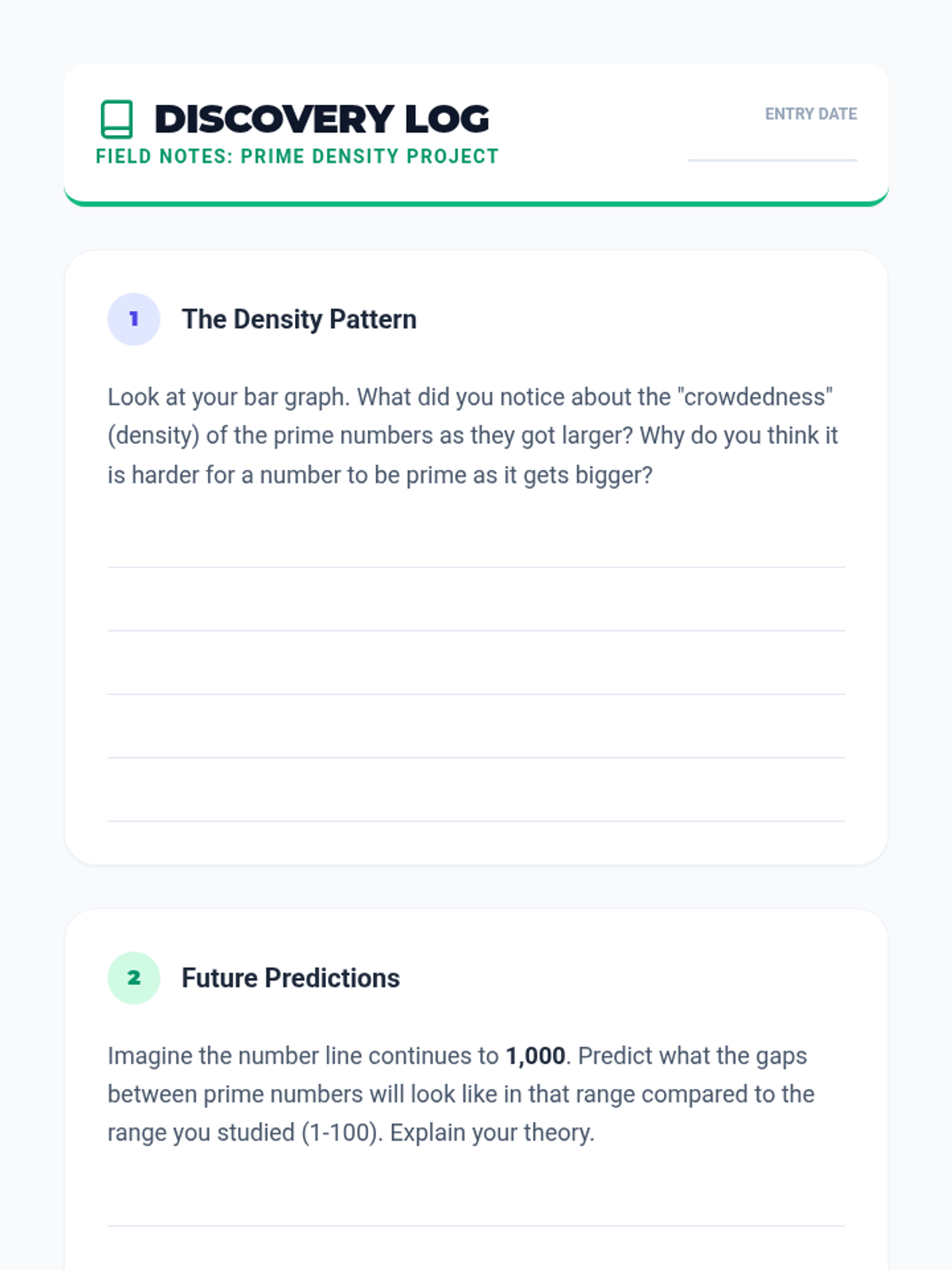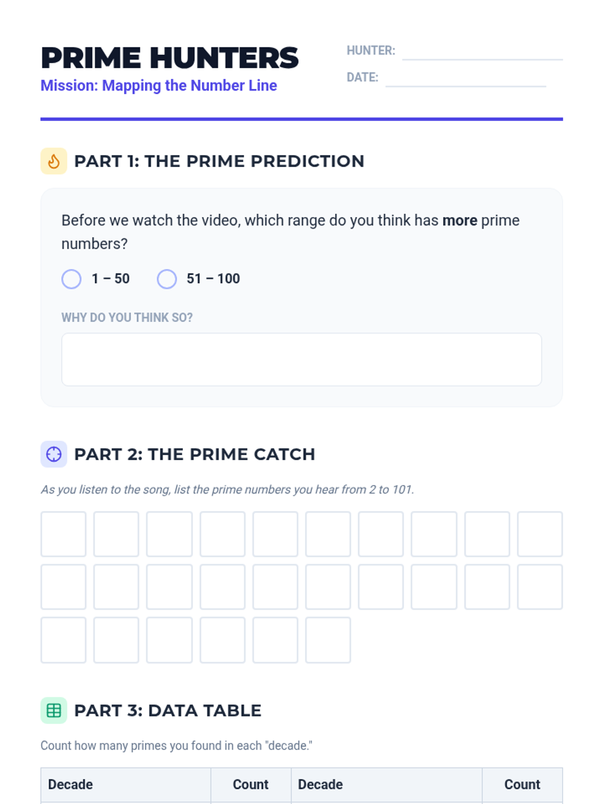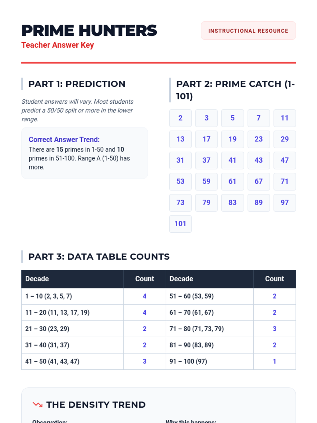 Students investigate the density of prime numbers from 1-100 using a musical mnemonic, creating a decade-by-decade bar graph to visualize how the frequency of primes changes as numbers get larger.