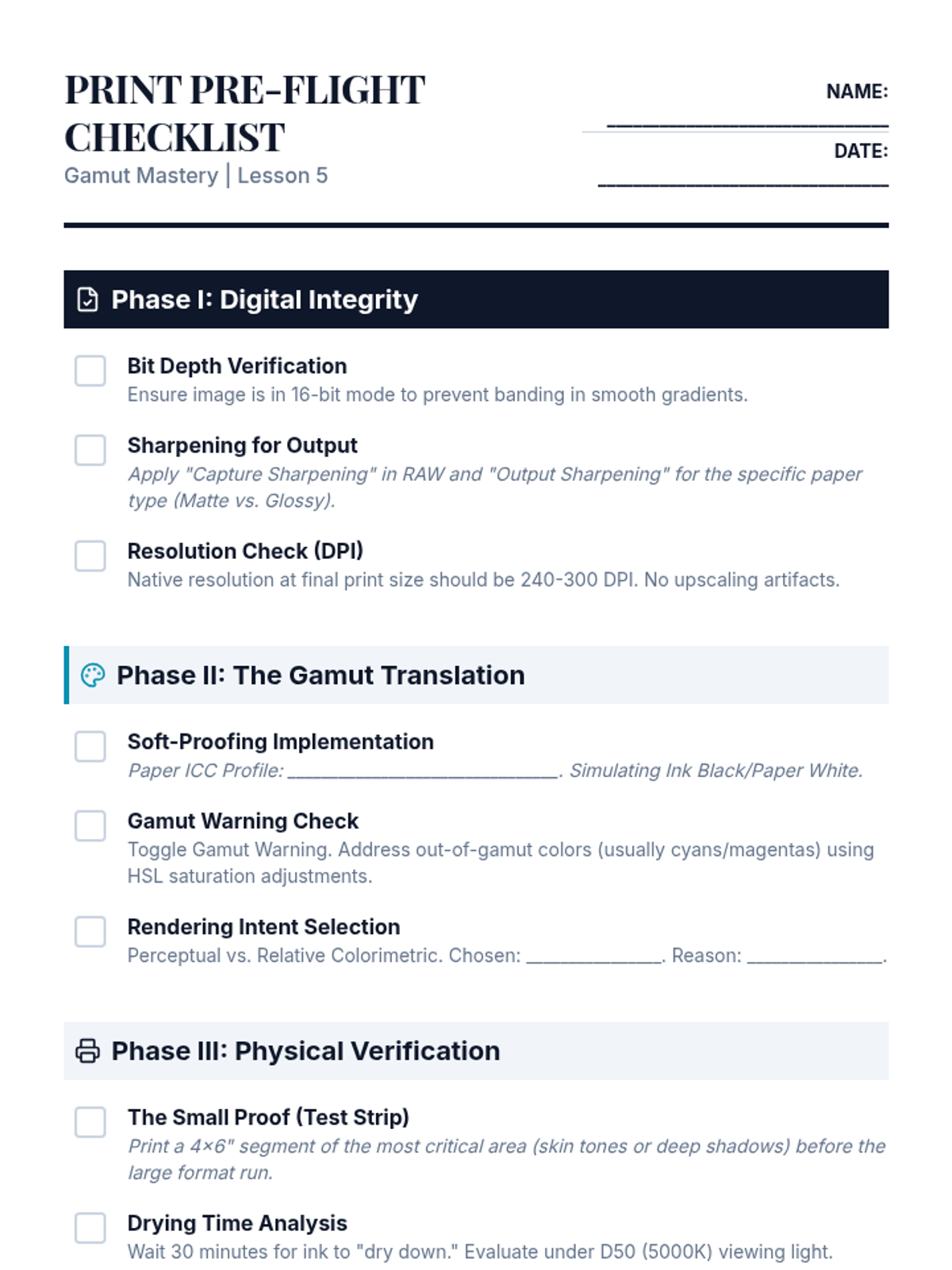 Detailed study of color spaces, monitor calibration, and soft-proofing to ensure high-fidelity physical output.