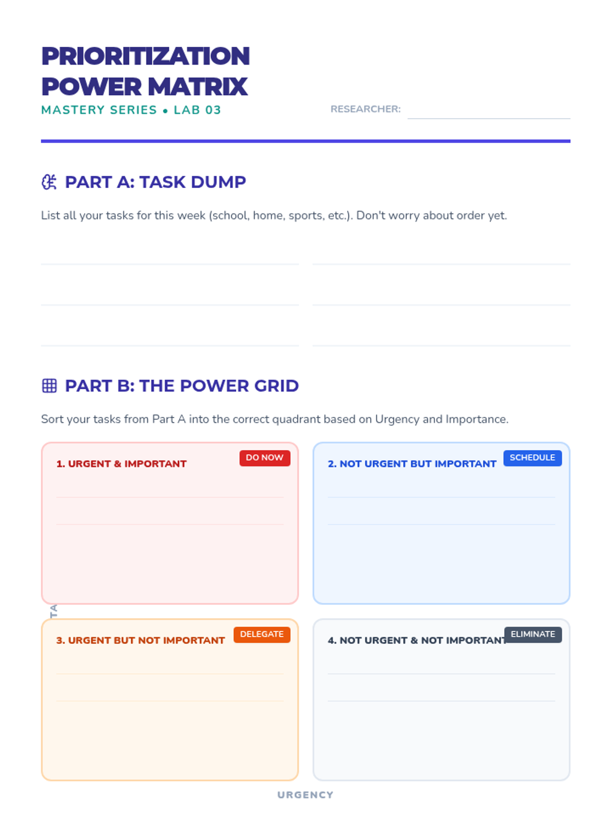Students use a prioritization matrix to categorize tasks by urgency and importance.