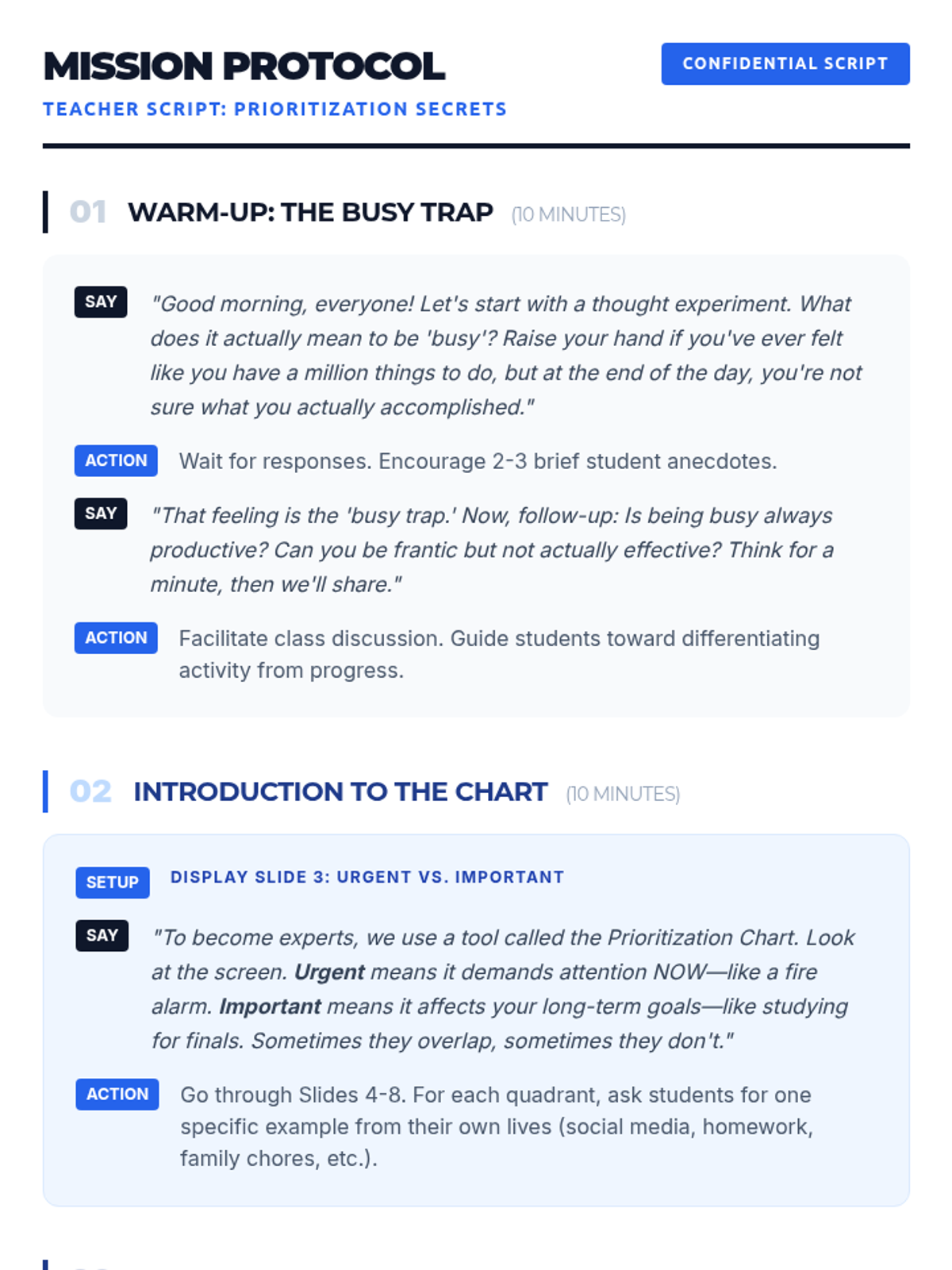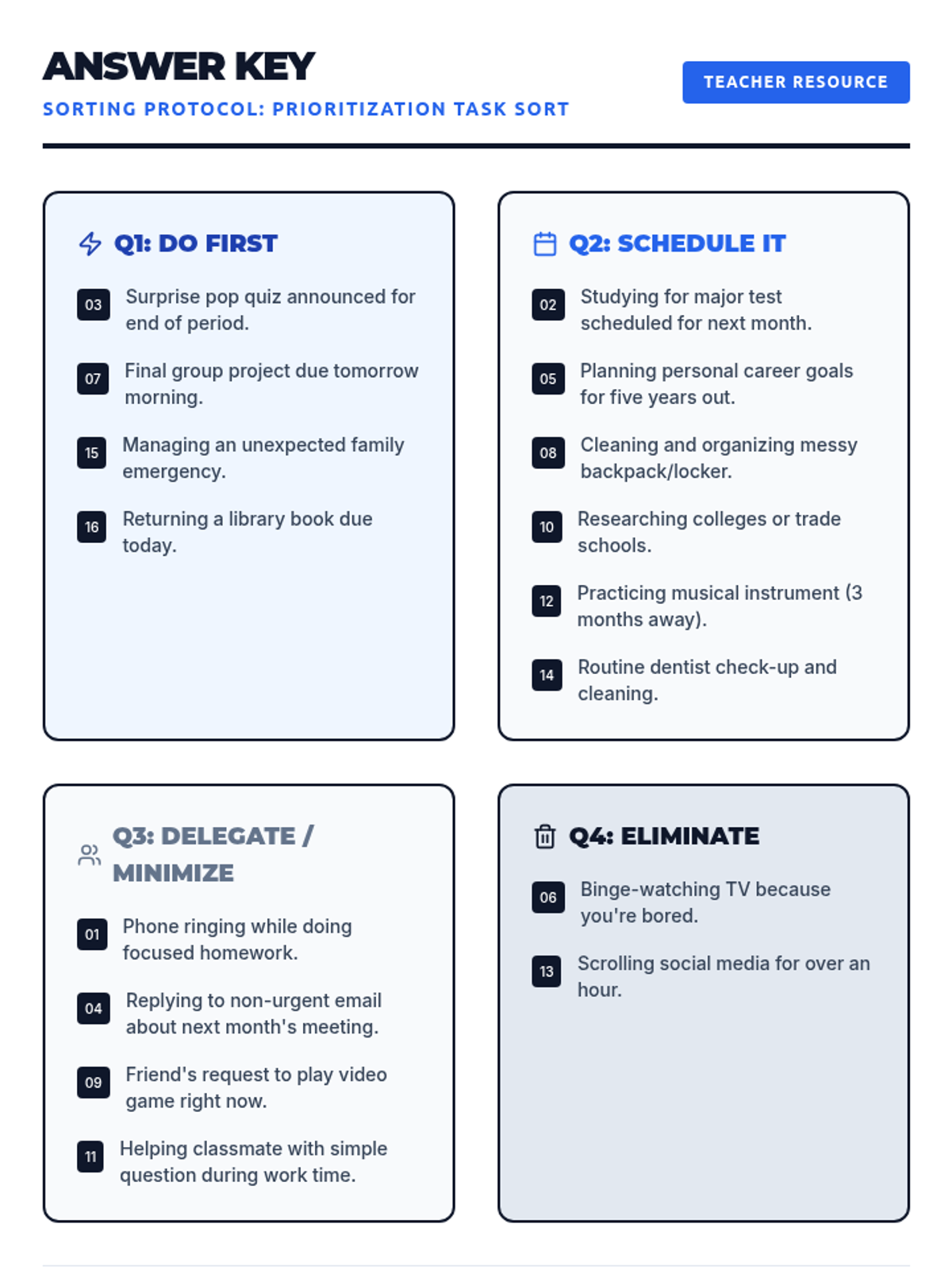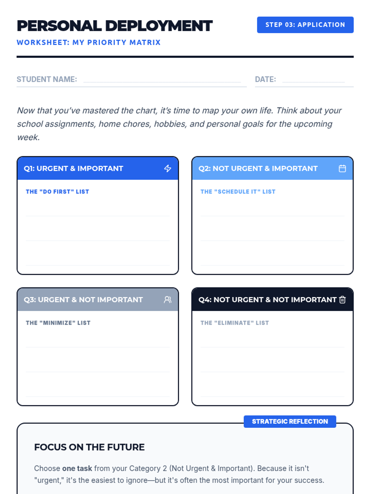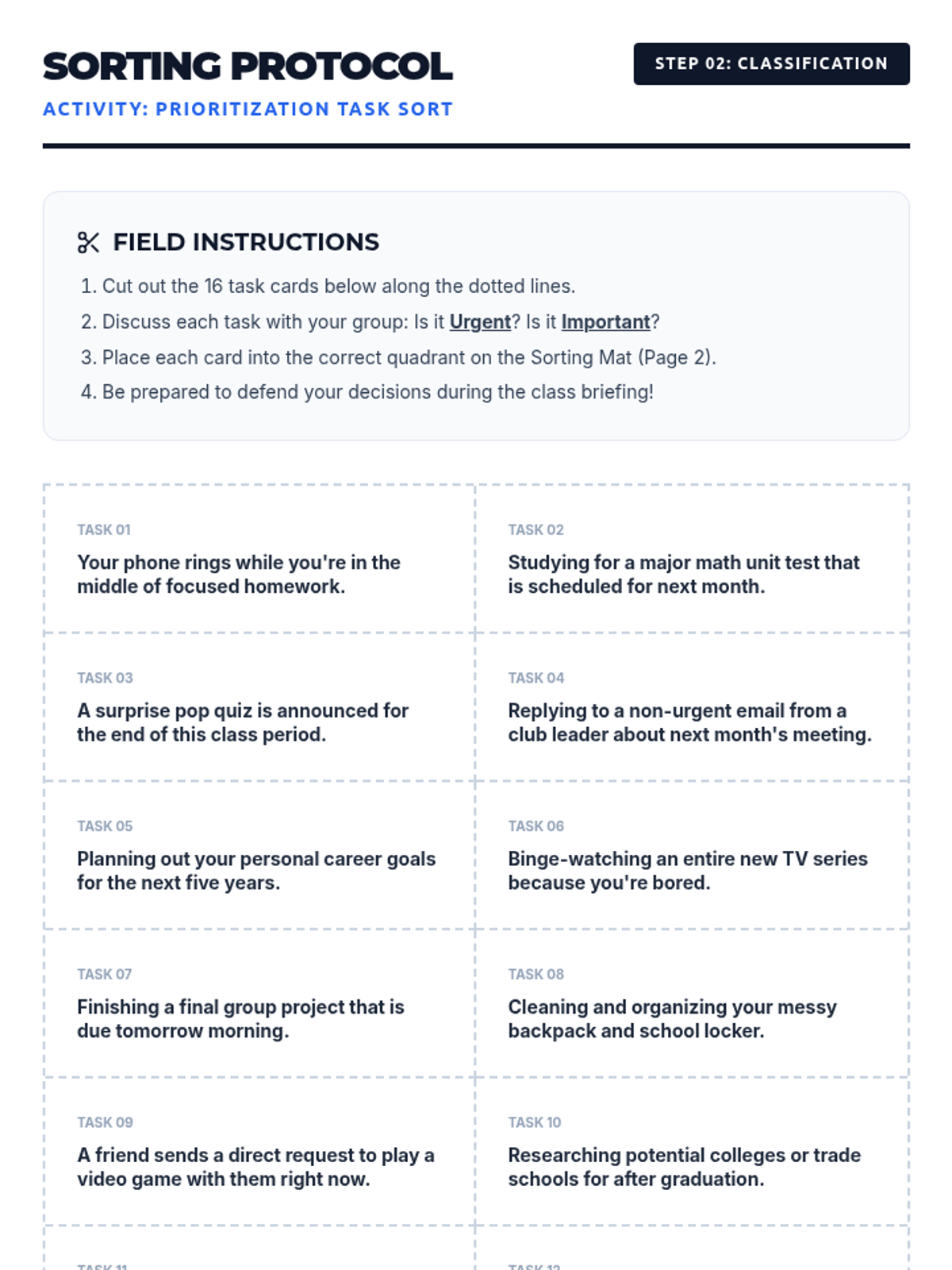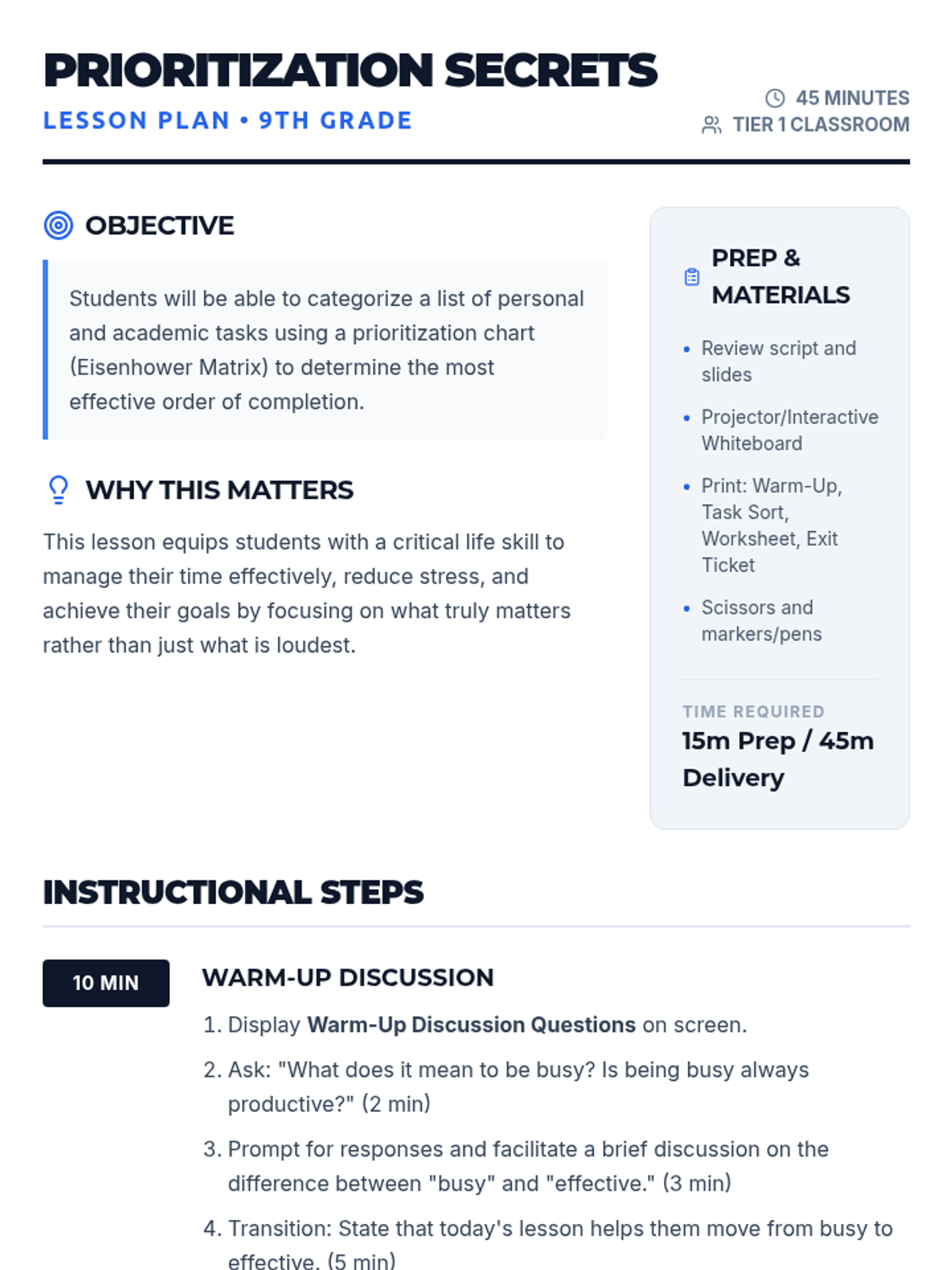 A 45-minute lesson for 9th-grade students to master the Eisenhower Matrix, learning to distinguish between urgent and important tasks to boost efficiency and reduce stress.