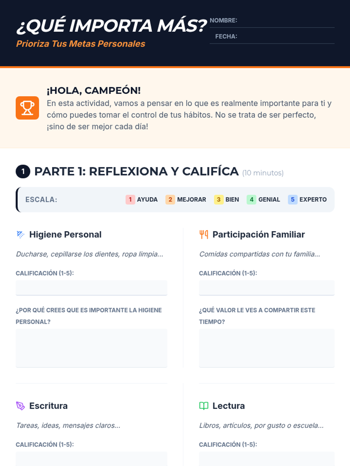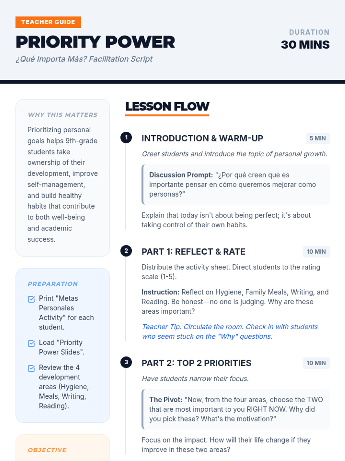An interactive session for 9th-grade students to reflect on and prioritize personal development goals like hygiene, family connection, and academic skills.
