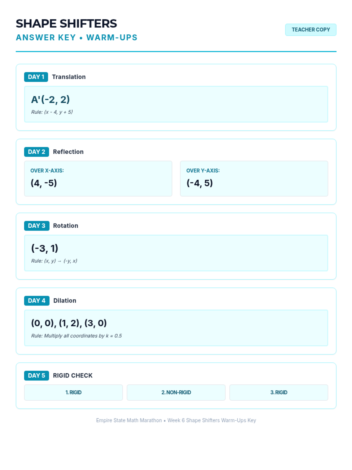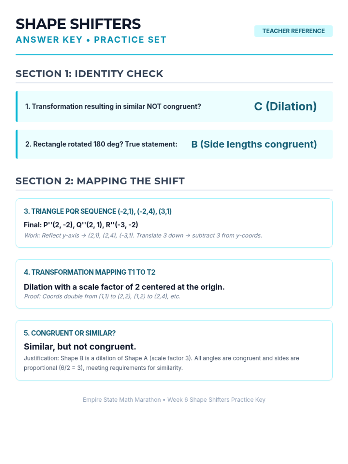 Week 6 focuses on rigid transformations (translations, reflections, rotations) and similarity transformations (dilations).