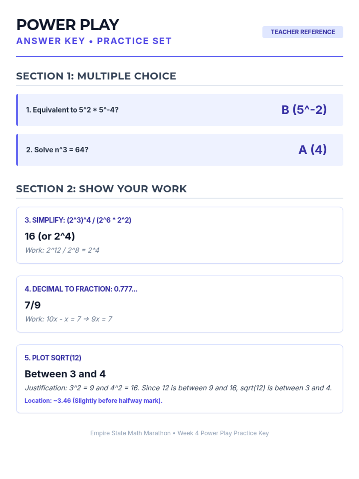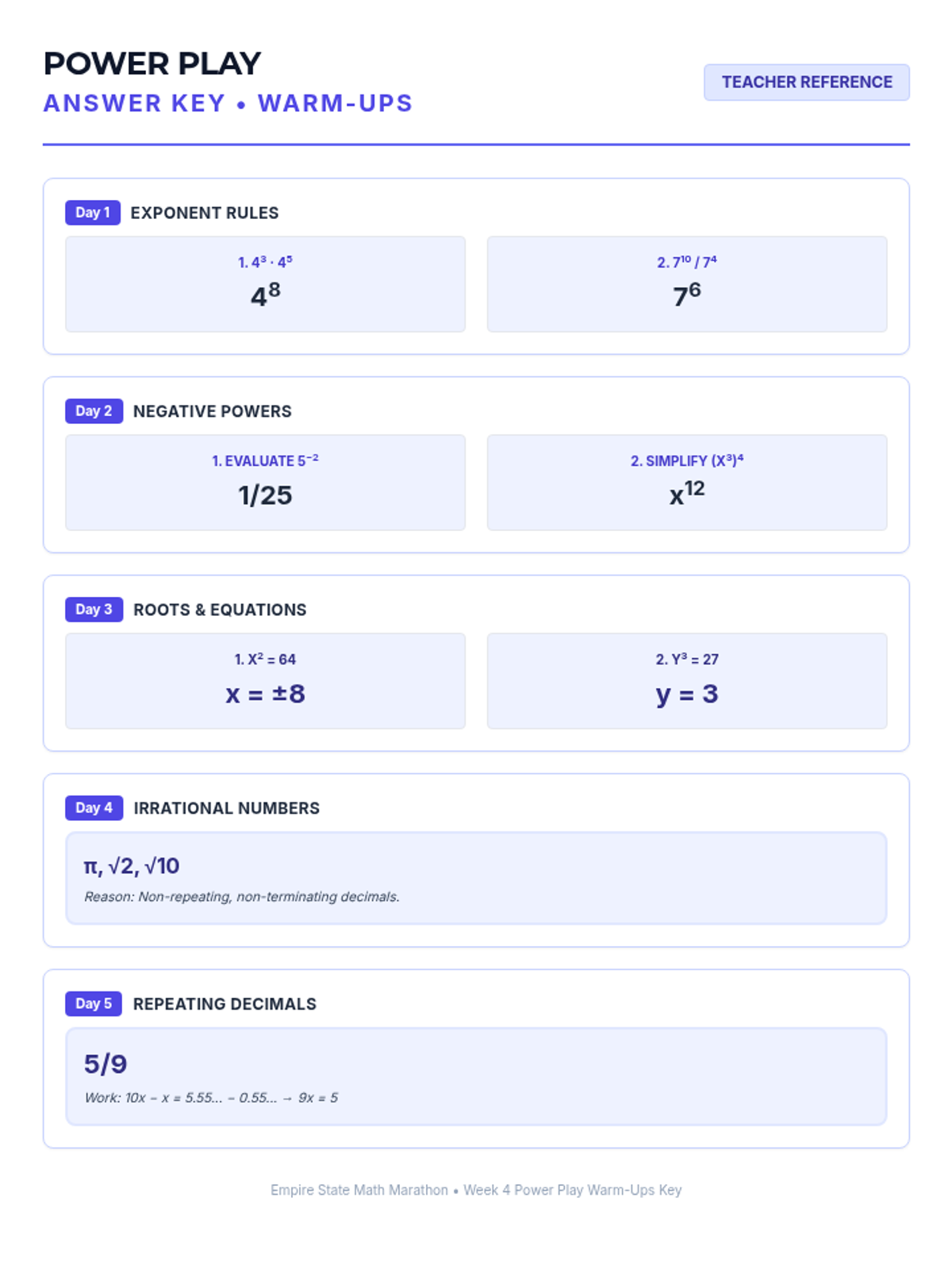 Week 4 explores integer exponent rules, perfect squares and cubes, and distinguishing between rational and irrational numbers.