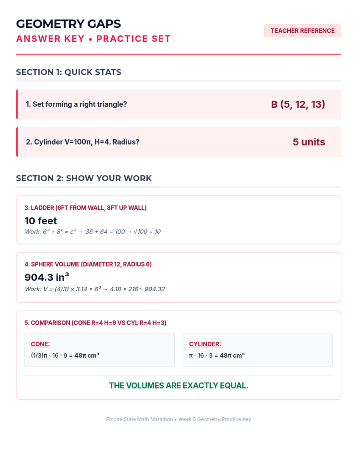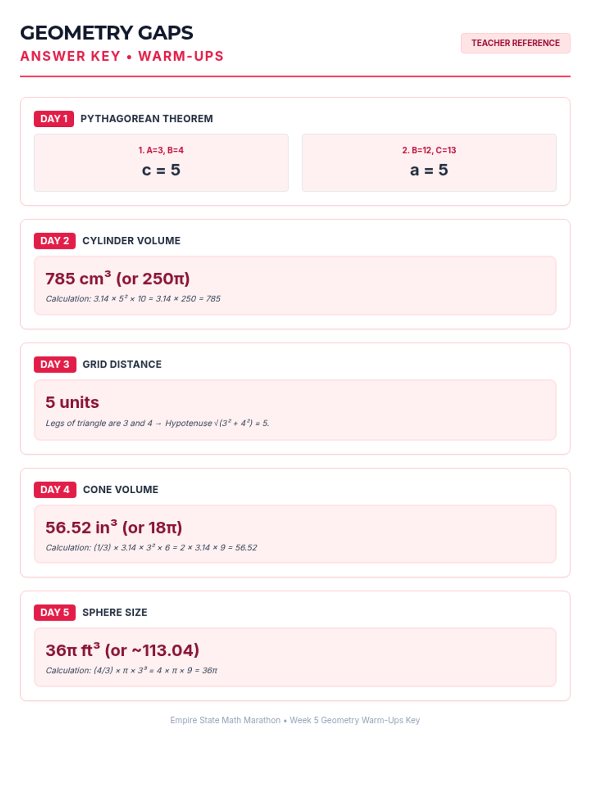 Week 5 reviews the Pythagorean Theorem and volume formulas for cylinders, cones, and spheres.