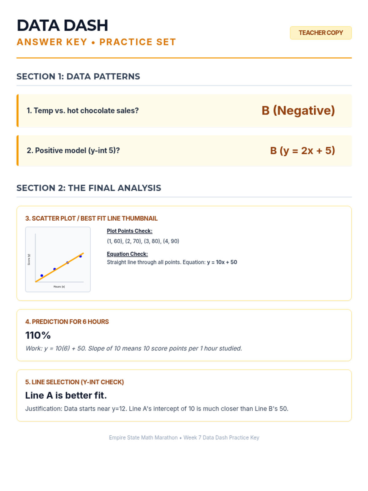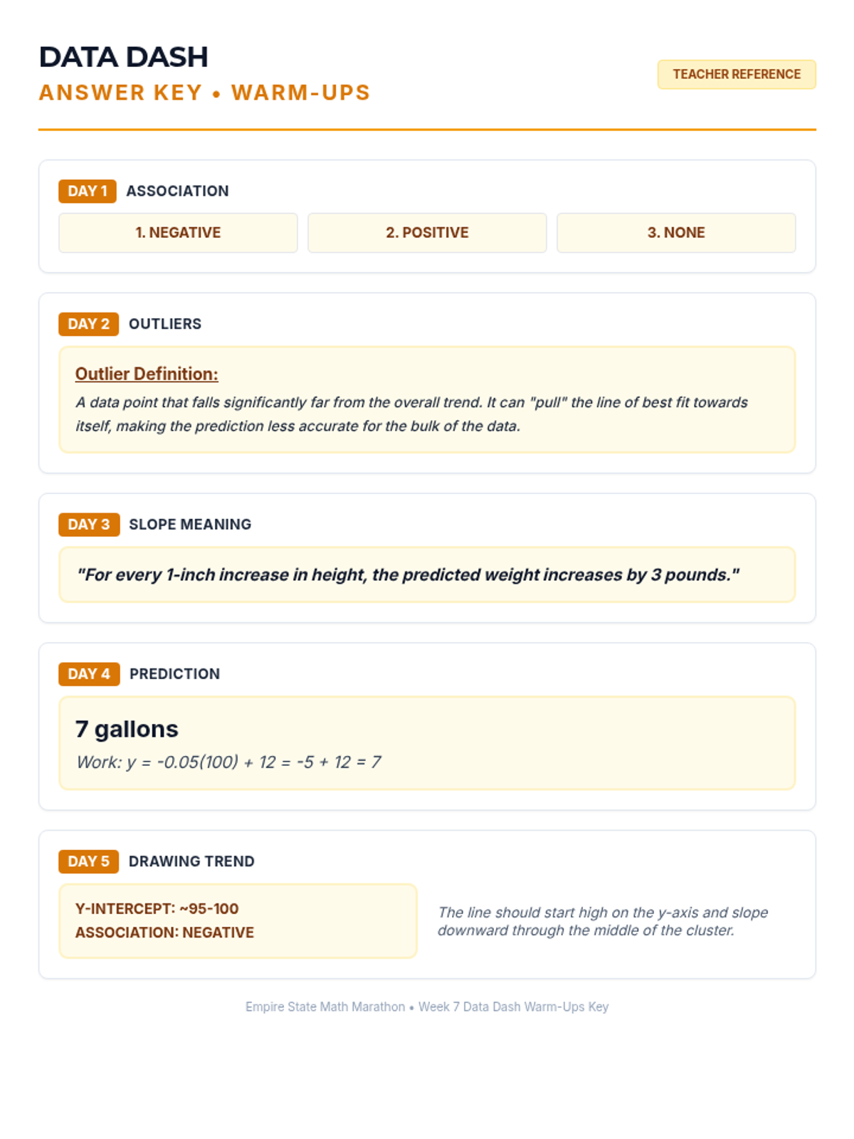 Week 7 analyzes bivariate data through scatter plots, interpreting lines of best fit, and using linear models to make predictions.