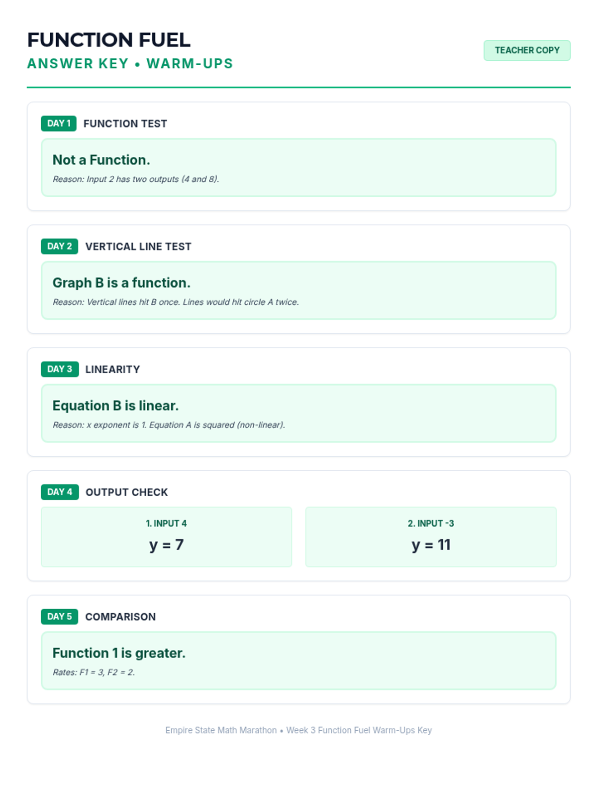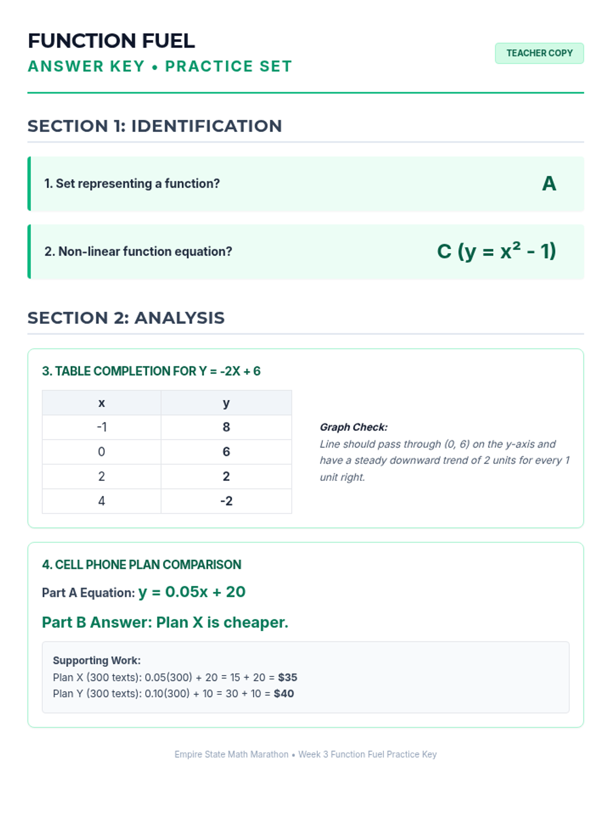Week 3 defines, evaluates, and compares functions represented in different ways (tables, graphs, equations).