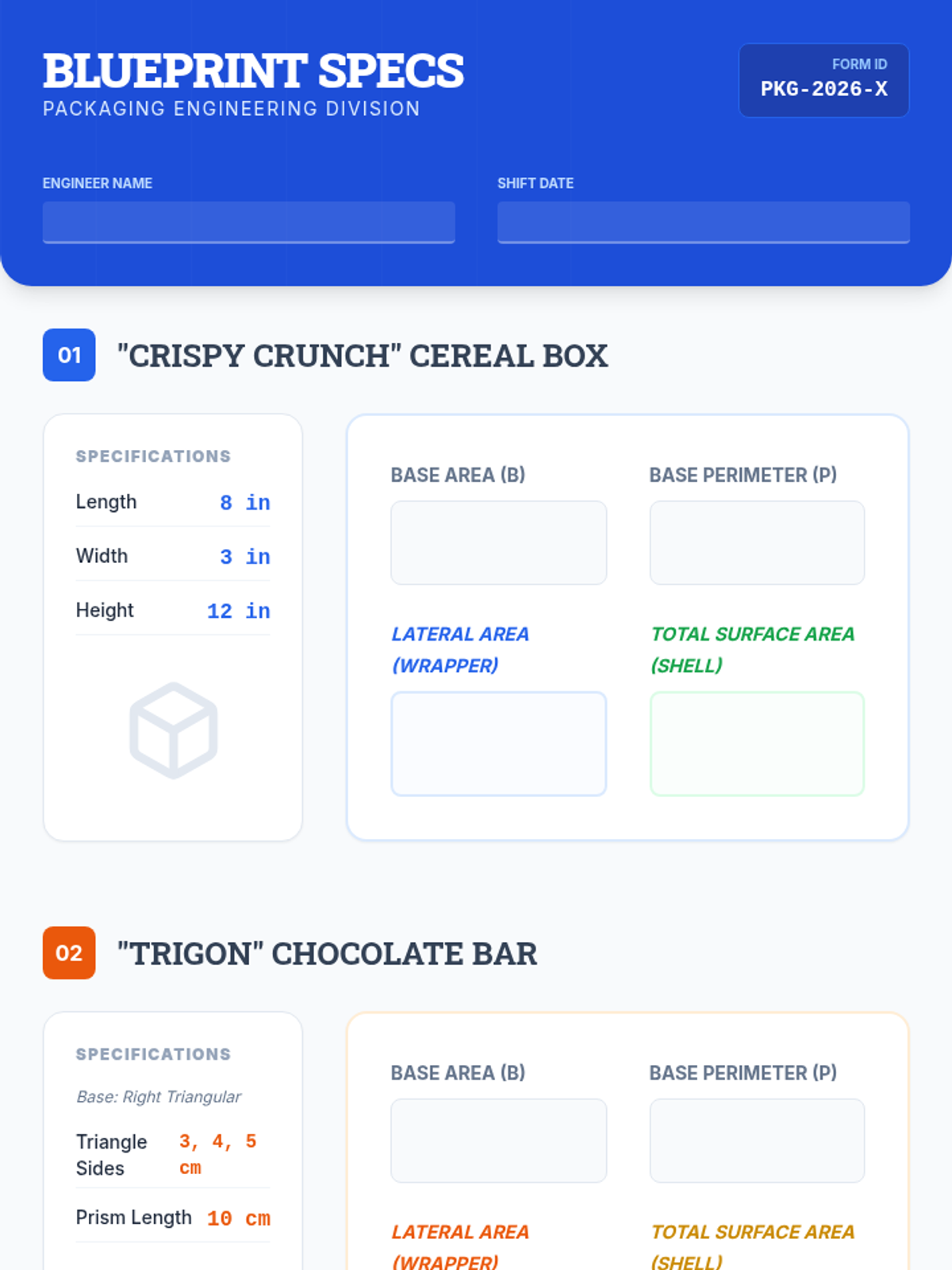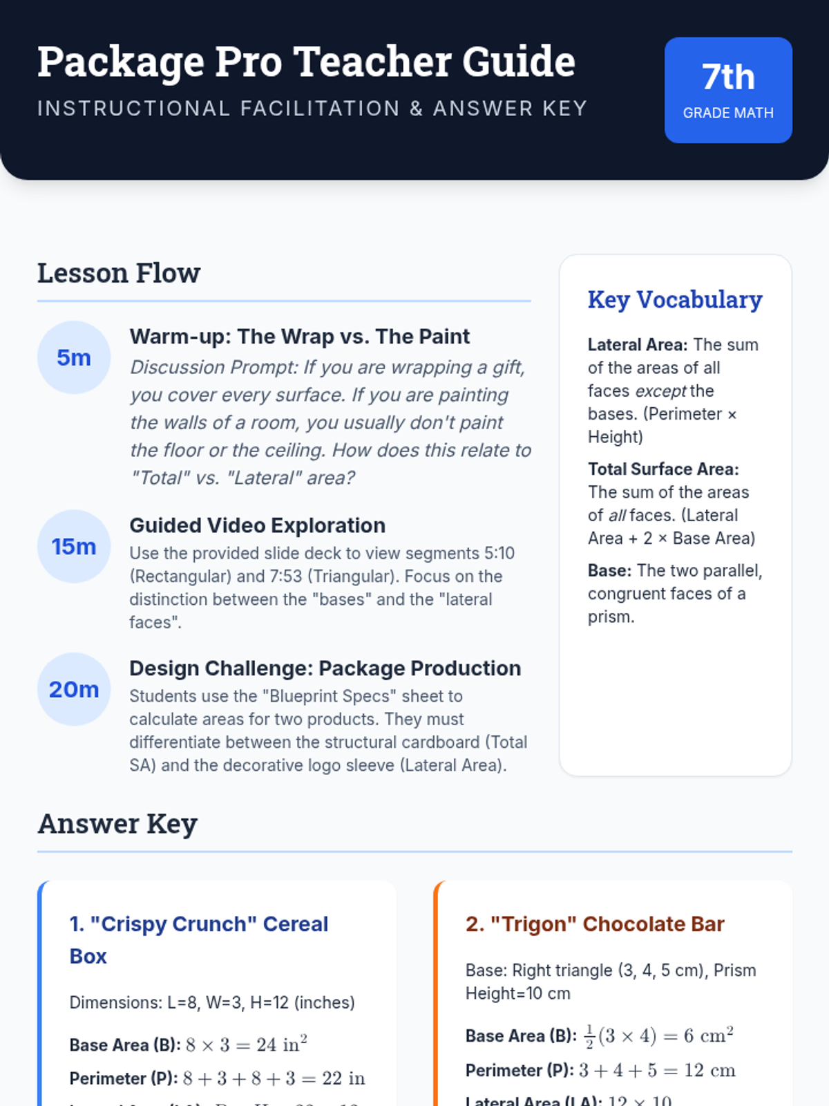 Students step into the role of packaging engineers to explore lateral and total surface area. They will watch targeted instructional videos and then design two different product boxes (rectangular and triangular prisms), calculating the materials needed for the structure versus the branding wrapper.