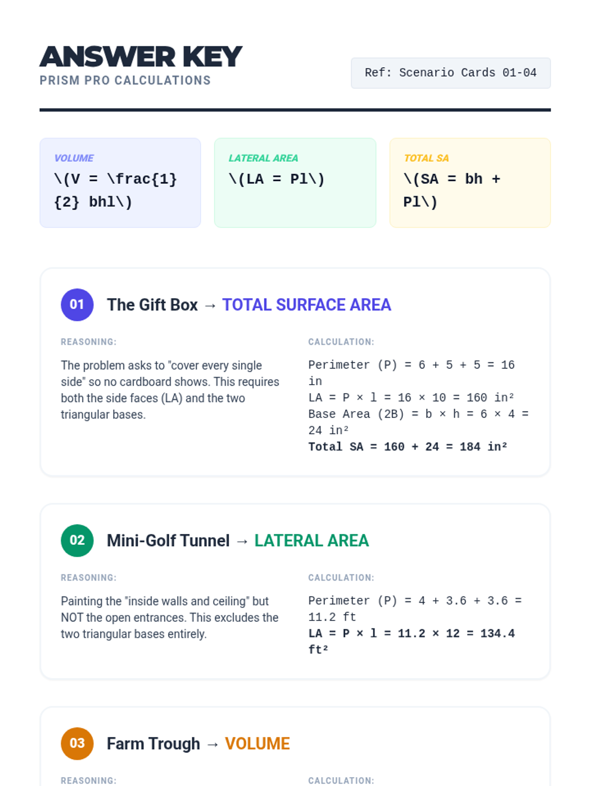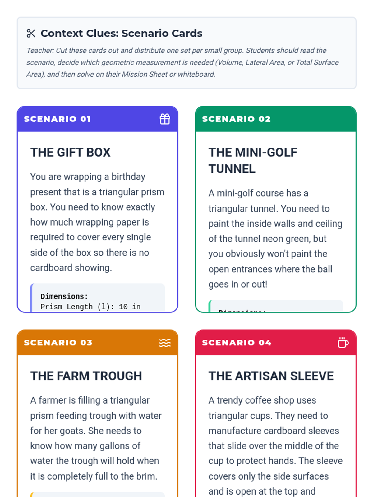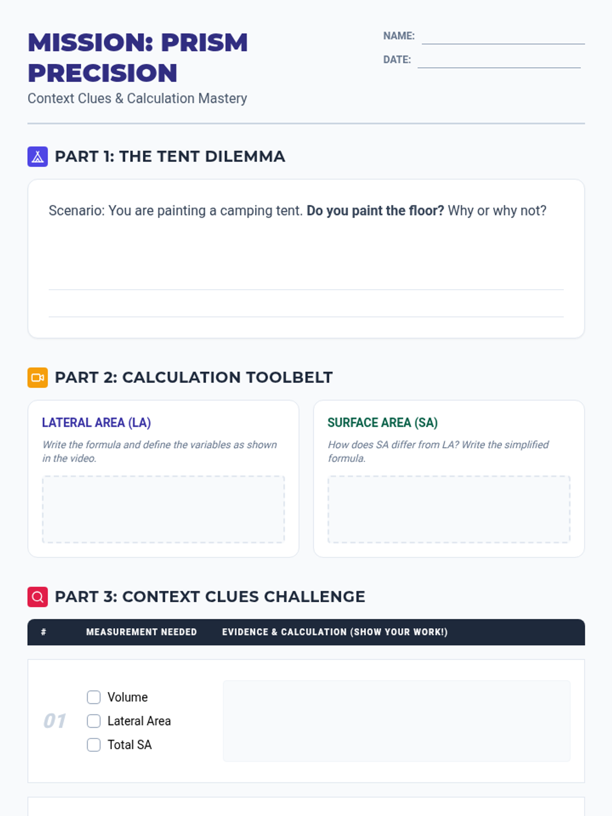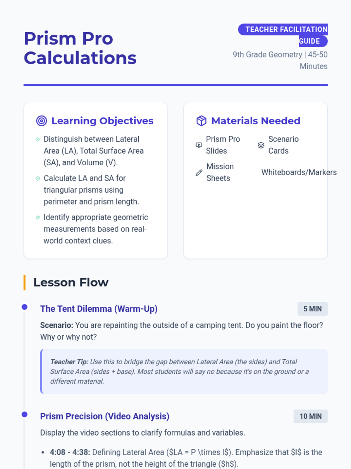 A 9th-grade geometry lesson focusing on distinguishing between Lateral Area, Total Surface Area, and Volume through real-world scenarios and video-based instruction on triangular prisms.