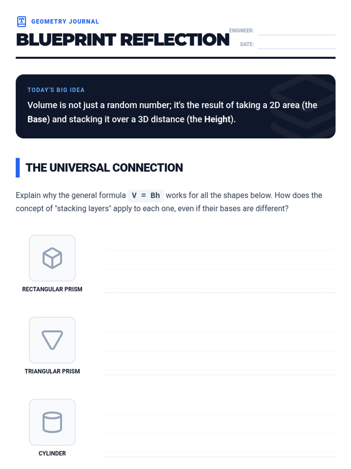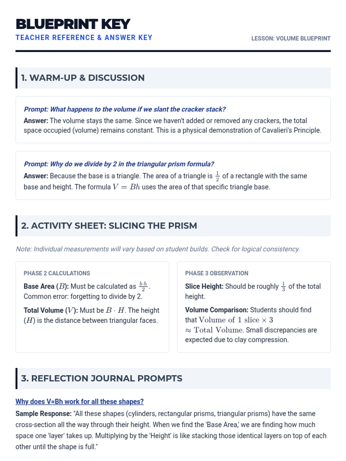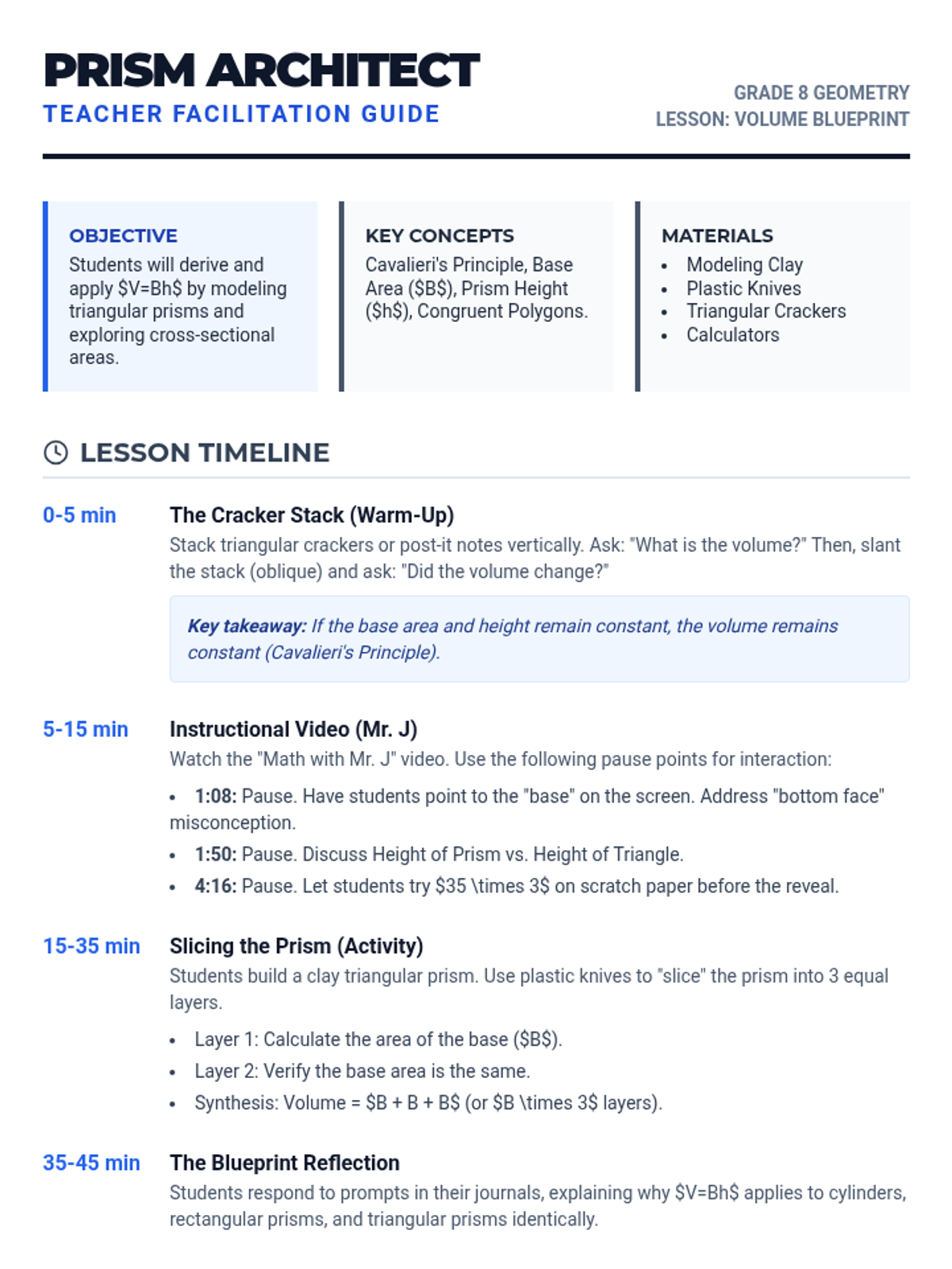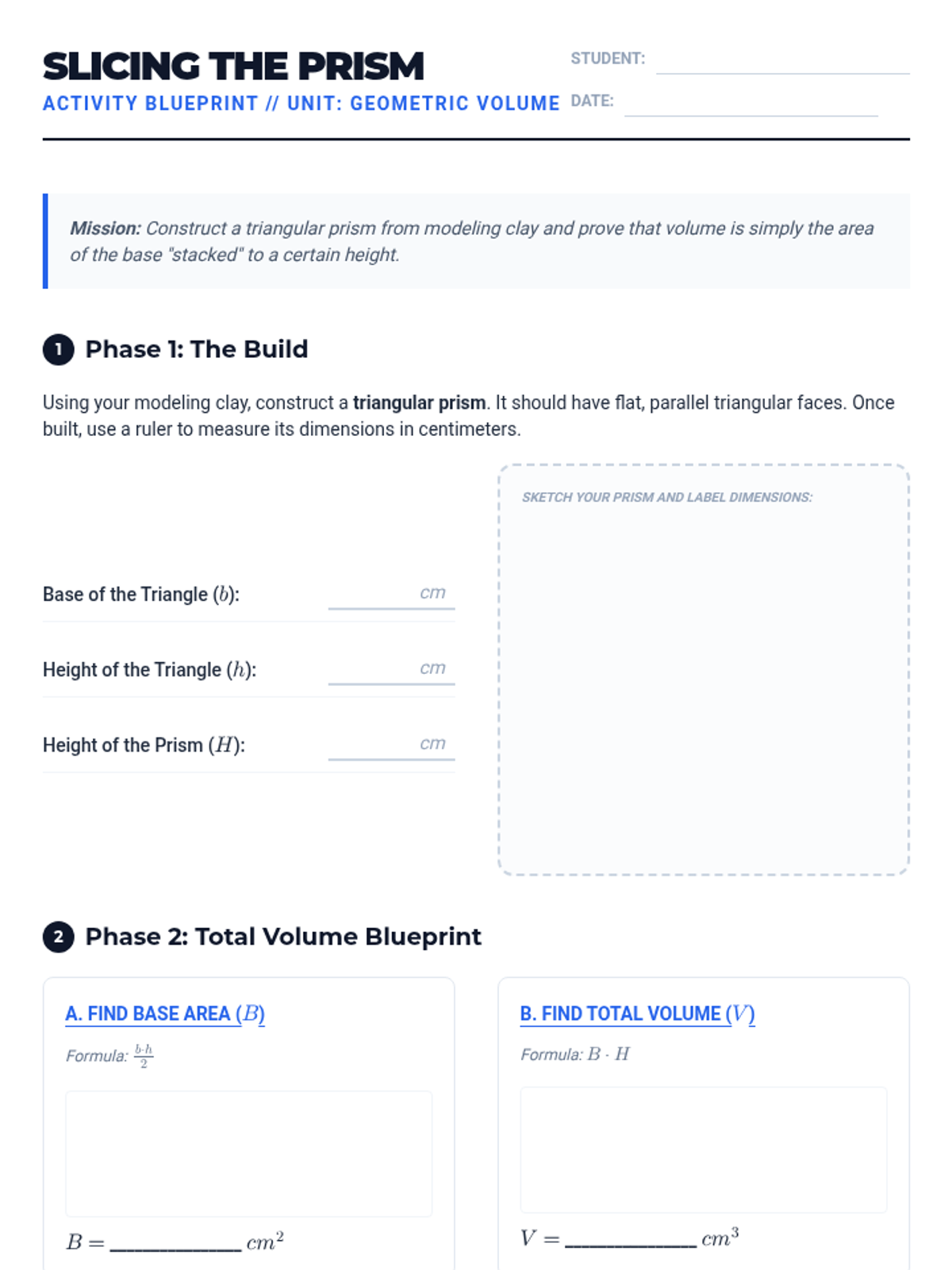 A hands-on geometry lesson for 8th-grade students exploring the relationship between base area and volume in triangular prisms, leading toward Cavalieri's Principle. Students use modeling clay to physically slice and measure prisms to internalize the V=Bh formula.