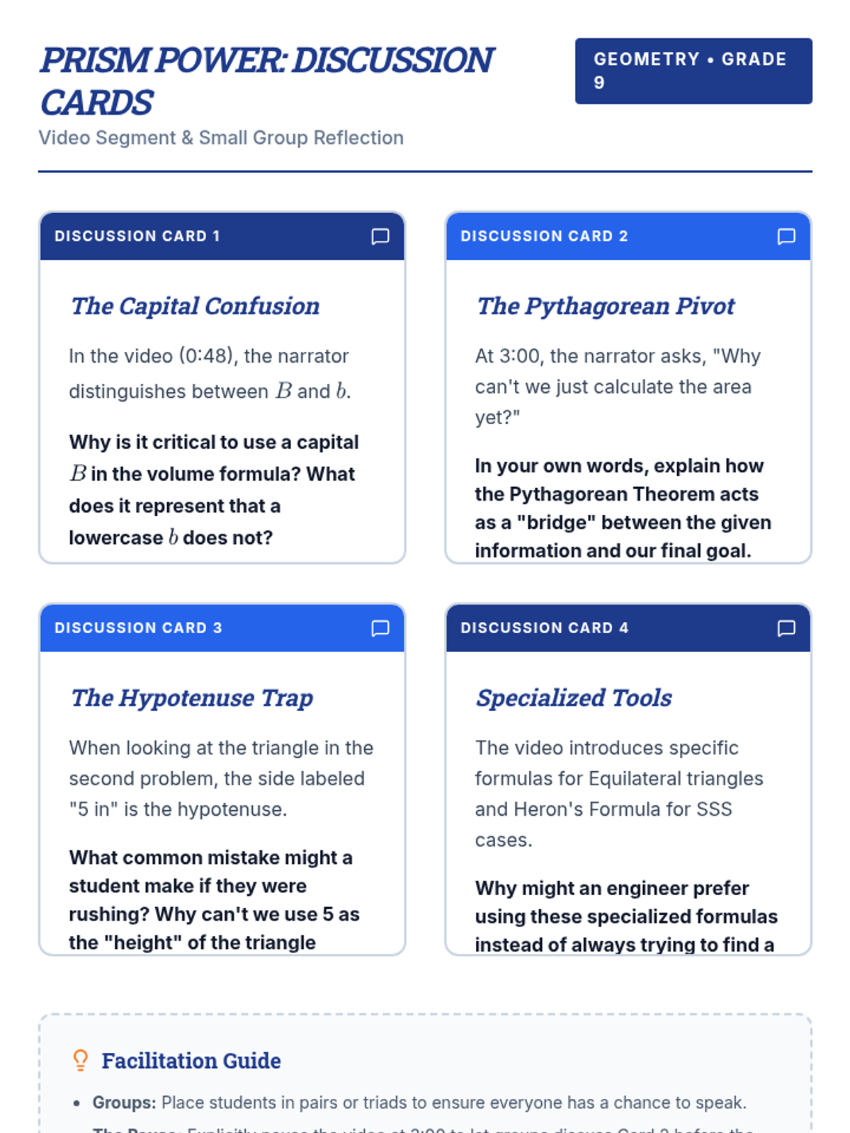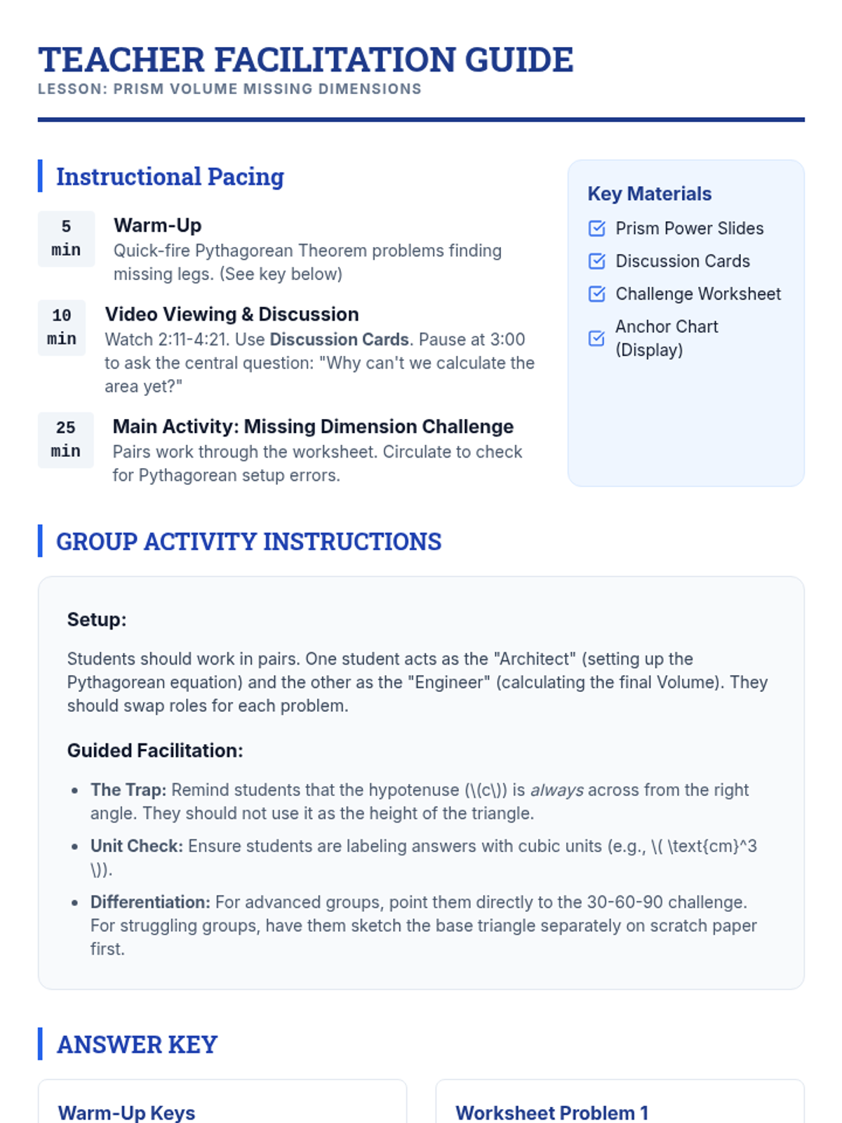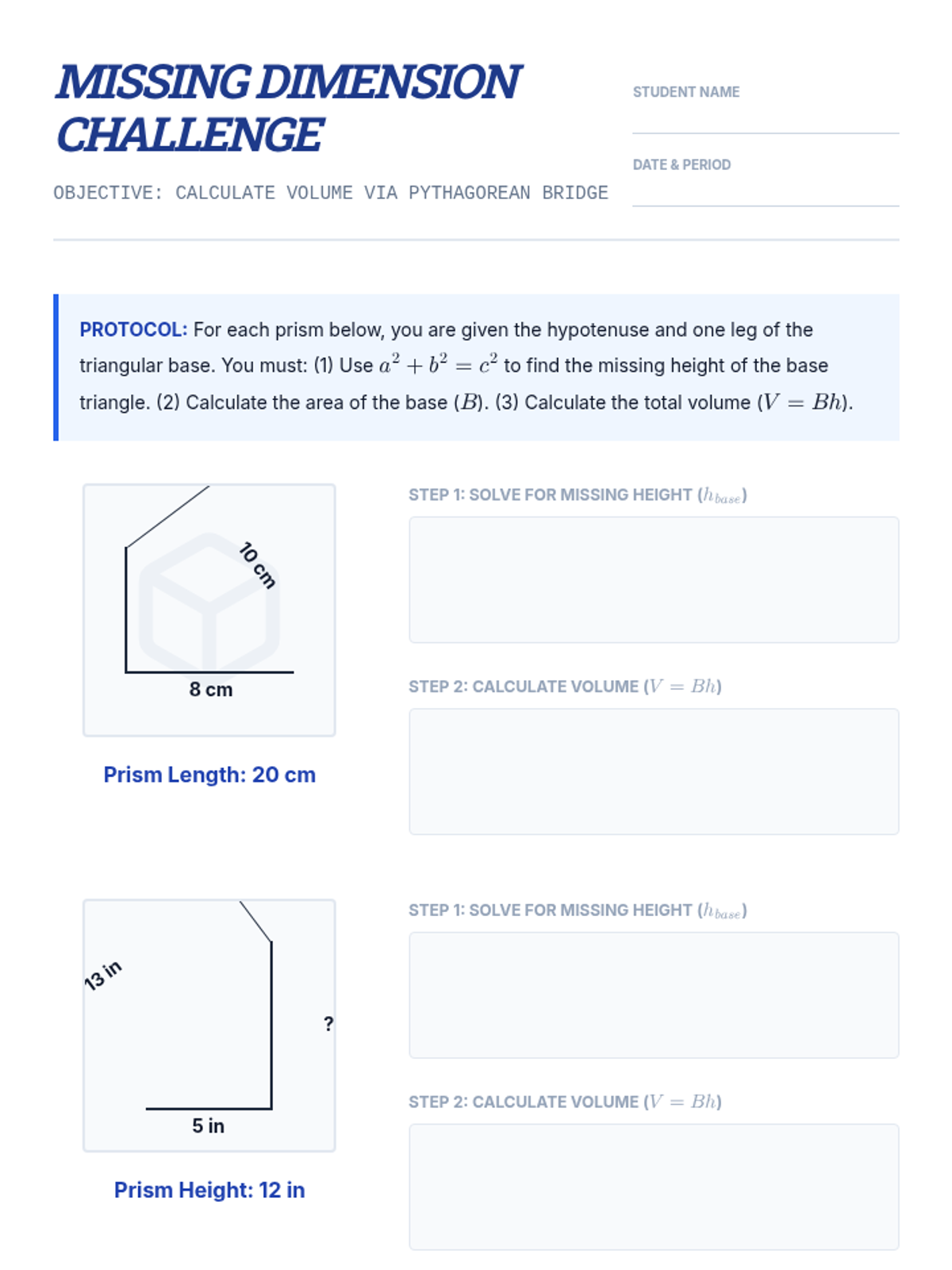 A 9th-grade geometry lesson focusing on calculating the volume of triangular prisms by first using the Pythagorean Theorem to determine missing base dimensions.