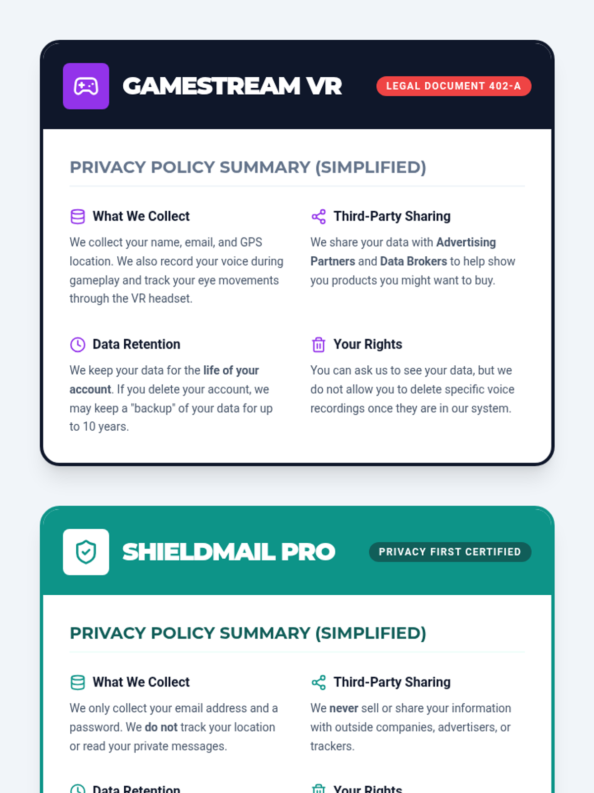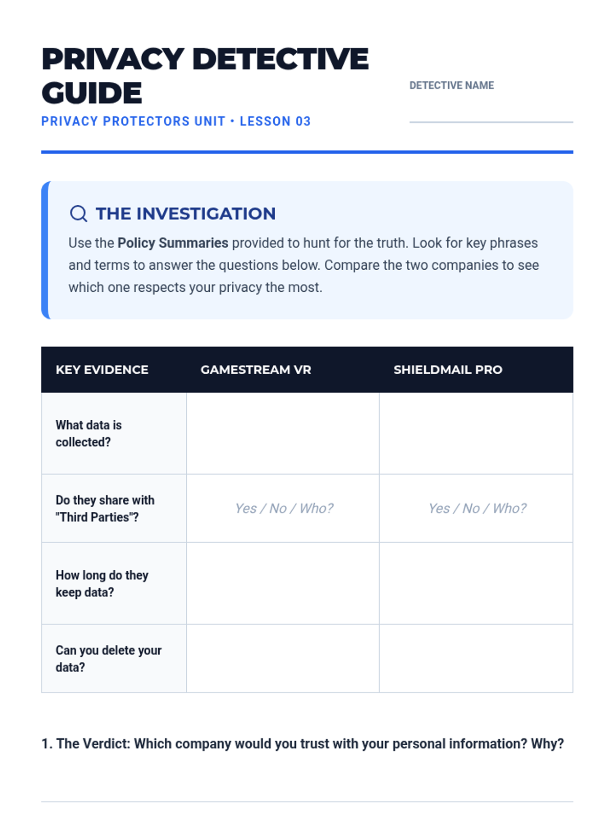 Using simplified, age-appropriate summaries of real privacy policies, students hunt for key clauses: what is kept, what is sold, and how long data is stored.