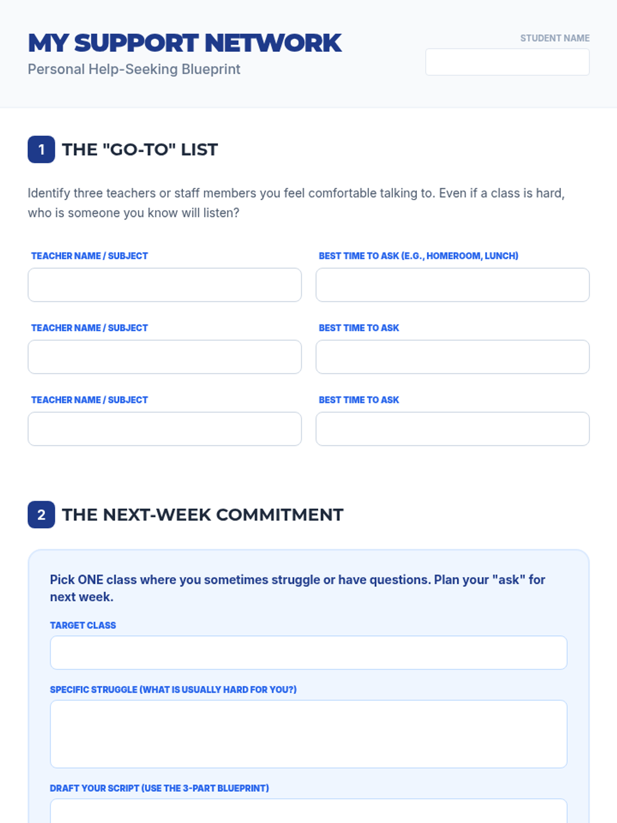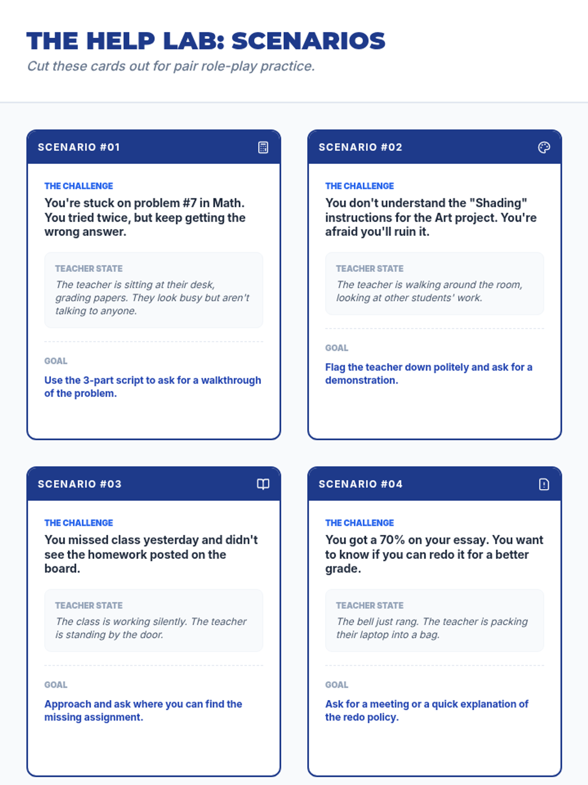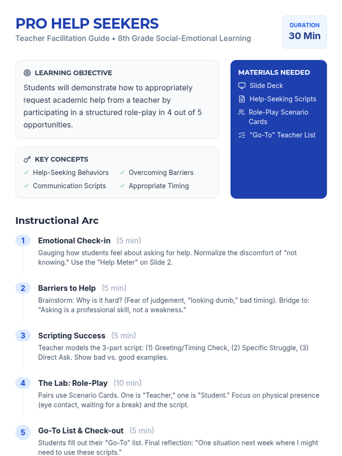 A 30-minute lesson for 8th graders on the art of seeking academic help effectively, covering barriers, timing, and professional communication scripts.